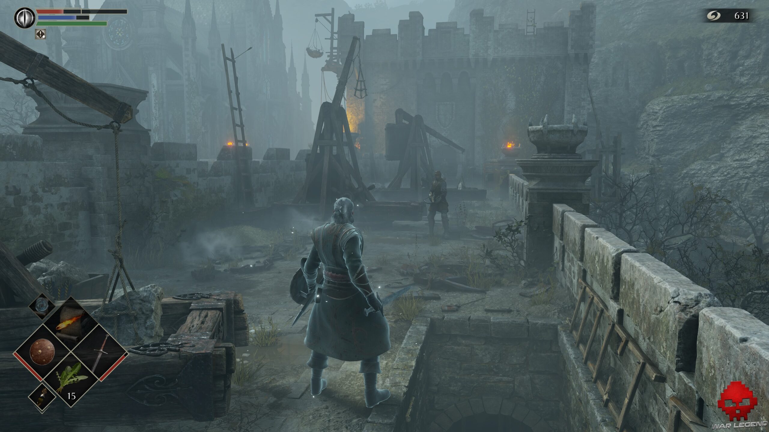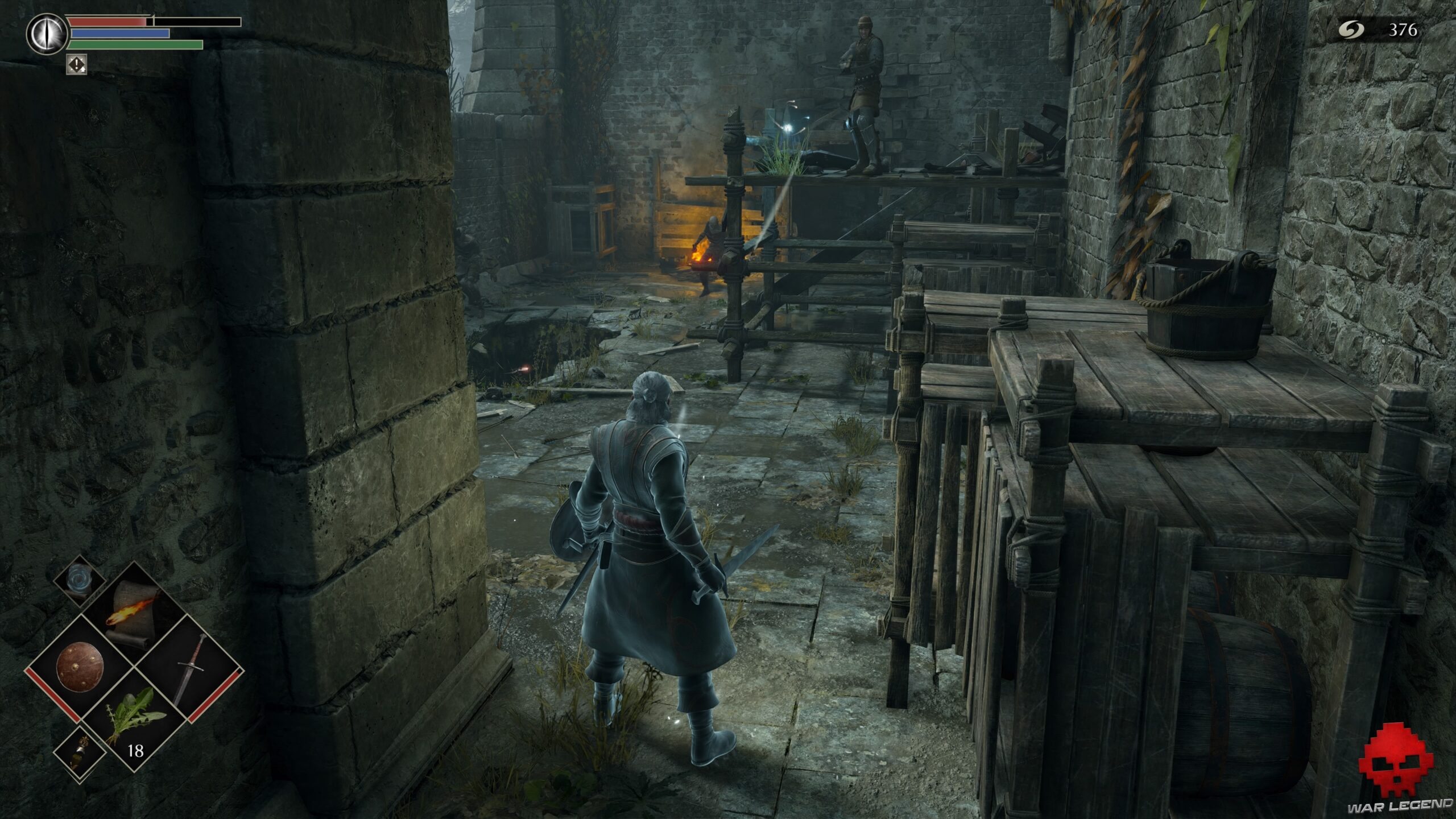 Partez plutôt en direction du chevalier bleu et mettez-le à l’amende. Juste en face, un trou dans les créneaux vous permet de vous laisser tomber pour récupérer une Arbalète légère et des Carreaux d’arbalète. Revenez là où vous avez tué le chevalier et poursuivez vers le bâtiment du fond.