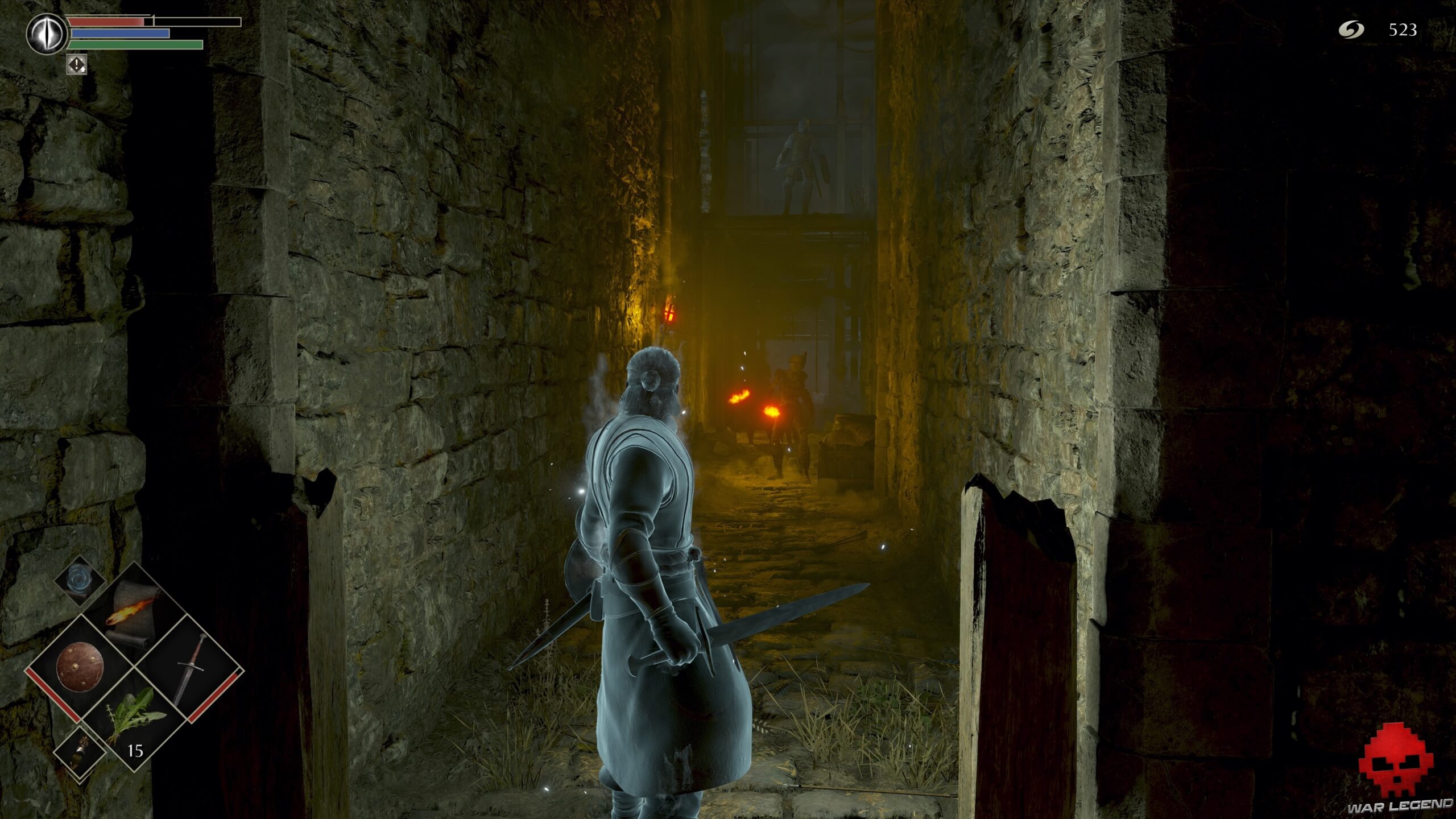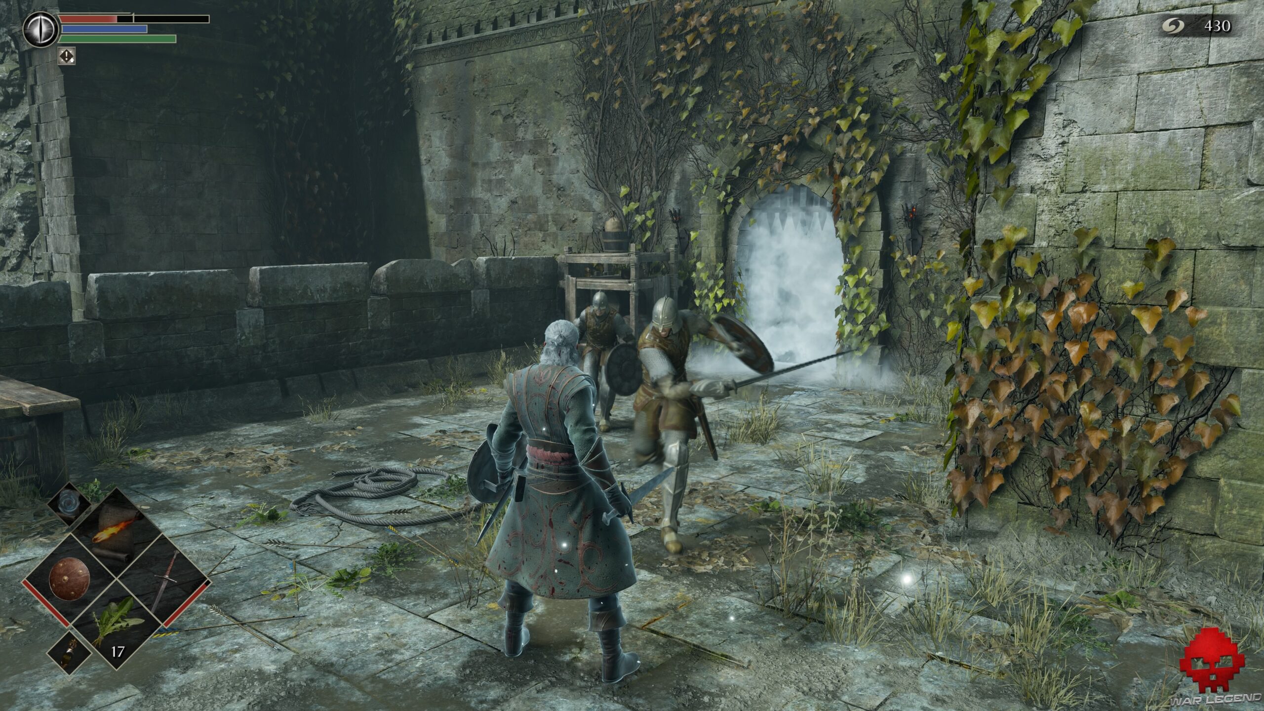 Plus loin, laissez le hallebardier venir à vous car un épéiste attends sur la gauche. Tuez-les tous les deux puis avancez. Vous pouvez prendre immédiatement à droite si vous le souhaitez : en cassant les palissades vous tomberez sur un marchand.
