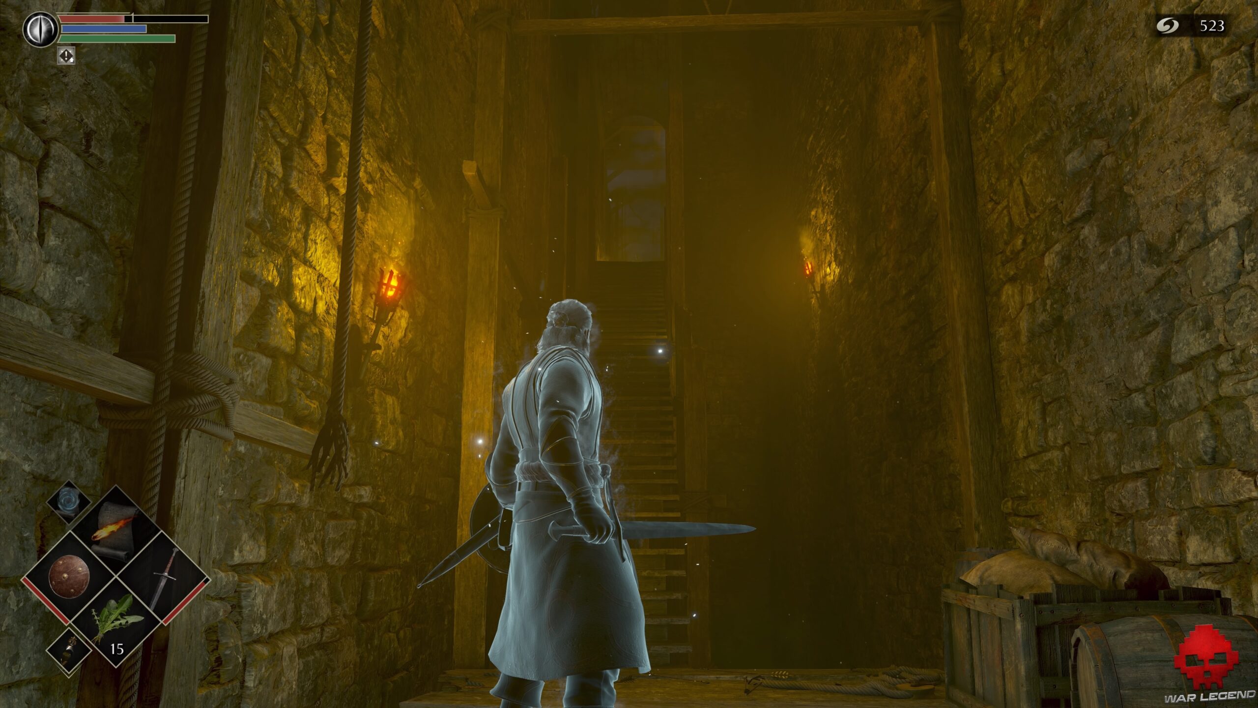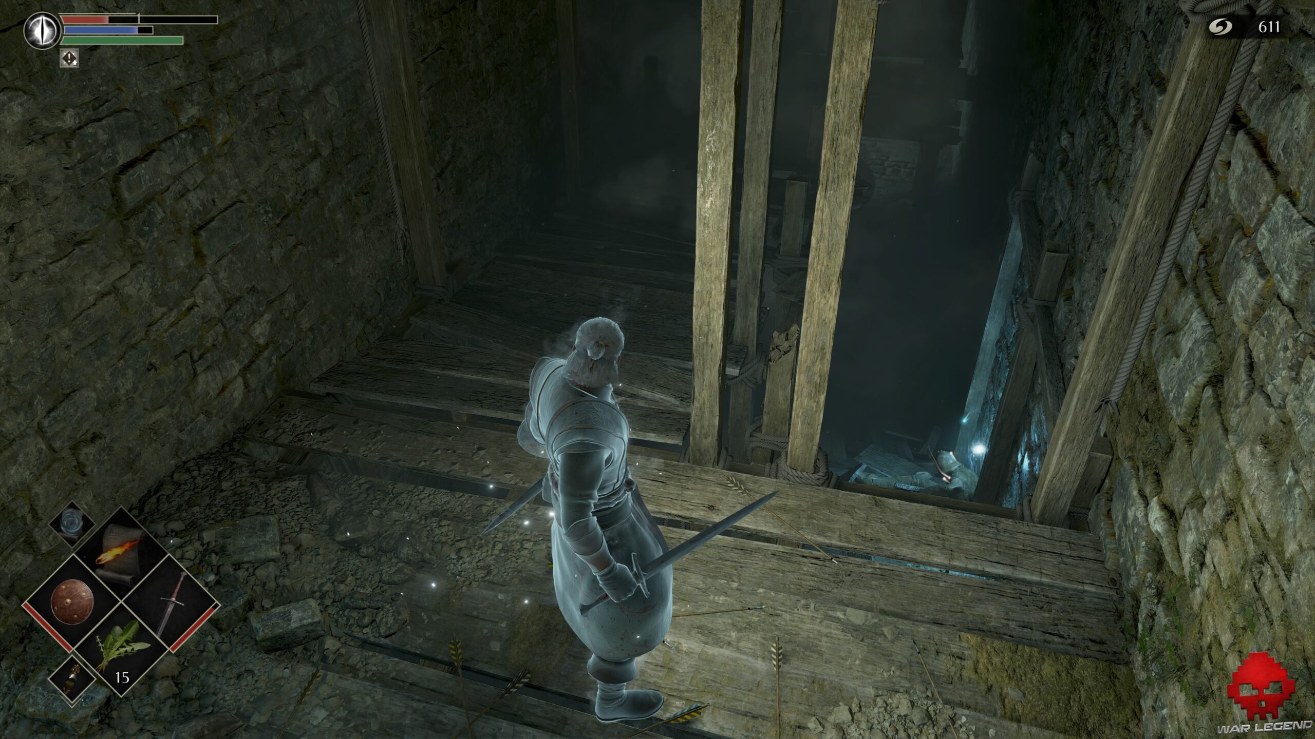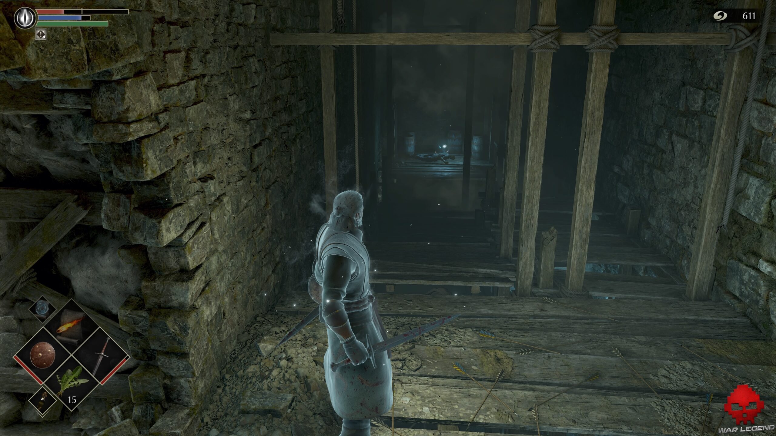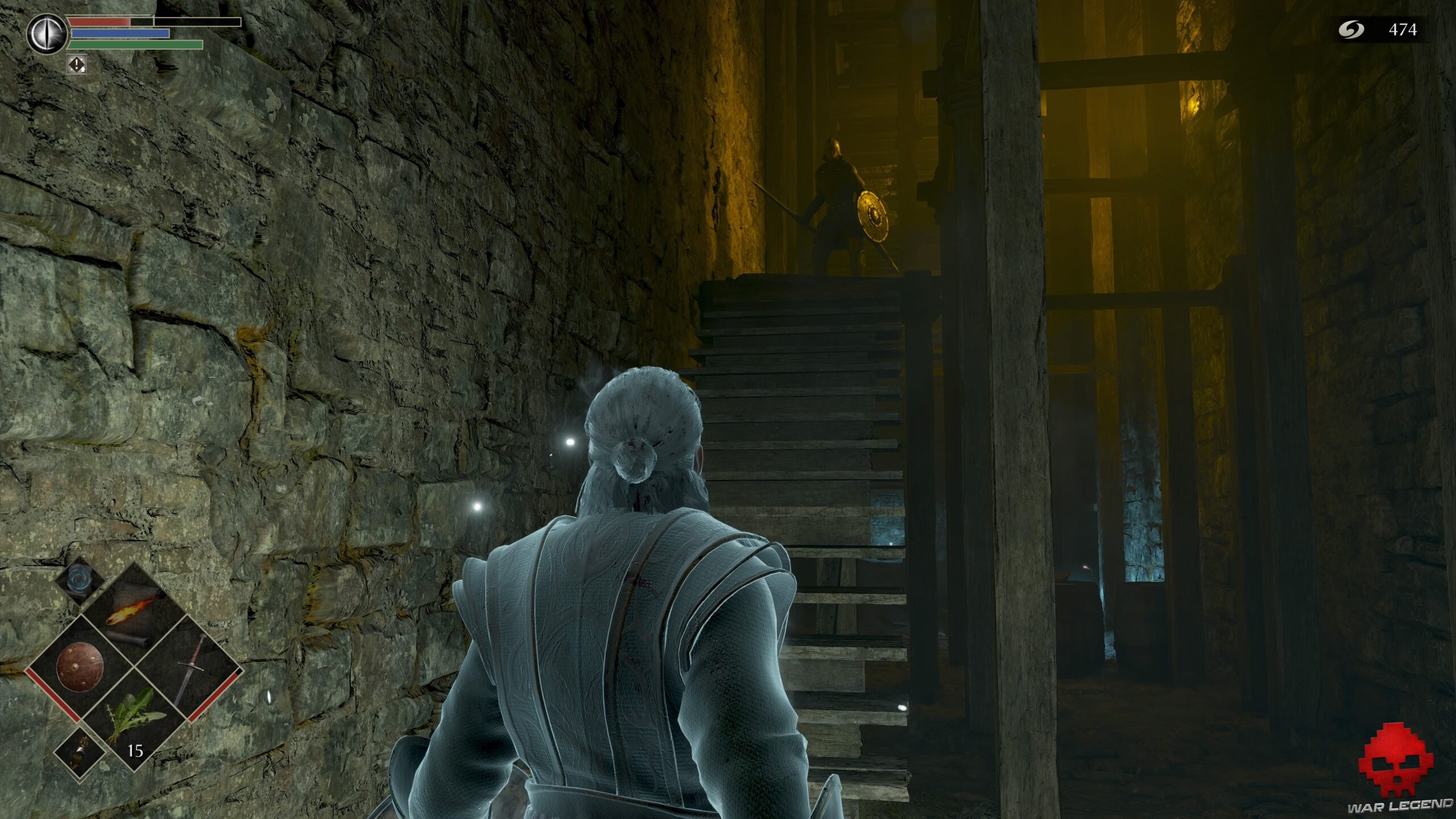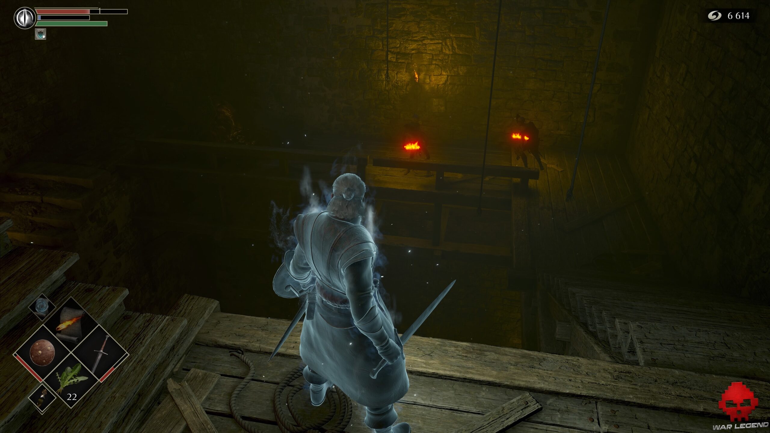 Avancez et montez les escaliers de l’échafaudage pour aller dégommer un premier arbalétrier et récupérer 1 Âme de soldat inconnu. Montez les dernières marches pour tuer un chevalier bleu et un autre arbalétrier et obtenir 2 Herbes de lune descendante. Redescendez ensuite les escaliers et prenez à gauche pour trouver de nouvelles marches menant au niveau inférieur, avec un certain nombre d’ennemis à la clé.