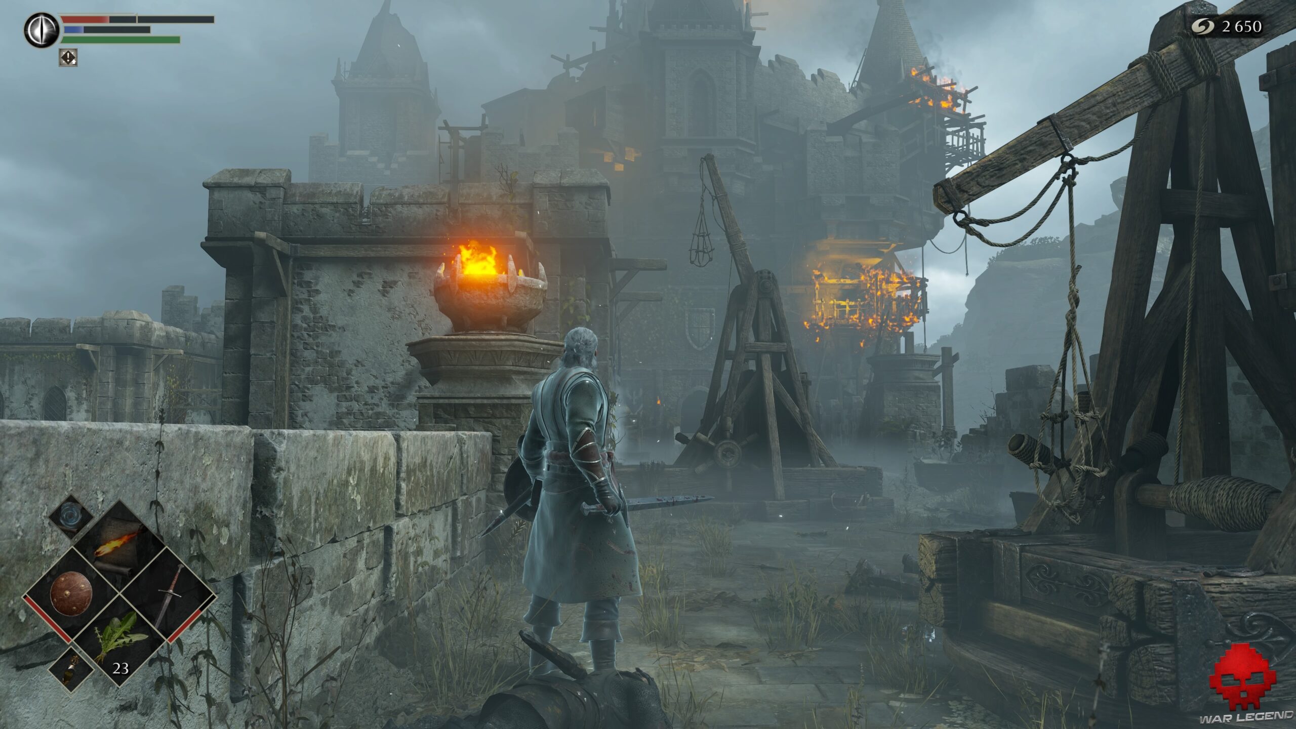 Remontez les escaliers de la tour pour retourner là où vous avez tué un chevalier bleu, et entrez dans le brouillard. Descendez les marches et avancez prudemment vers le prochain ennemi. Il va lancer une bombe incendiaire, et les petits tonneaux que vous voyez sont explosifs. Dès qu’il amorce son mouvement, reculez pour que l’explosion ne vous atteigne pas puis allez le tuer.