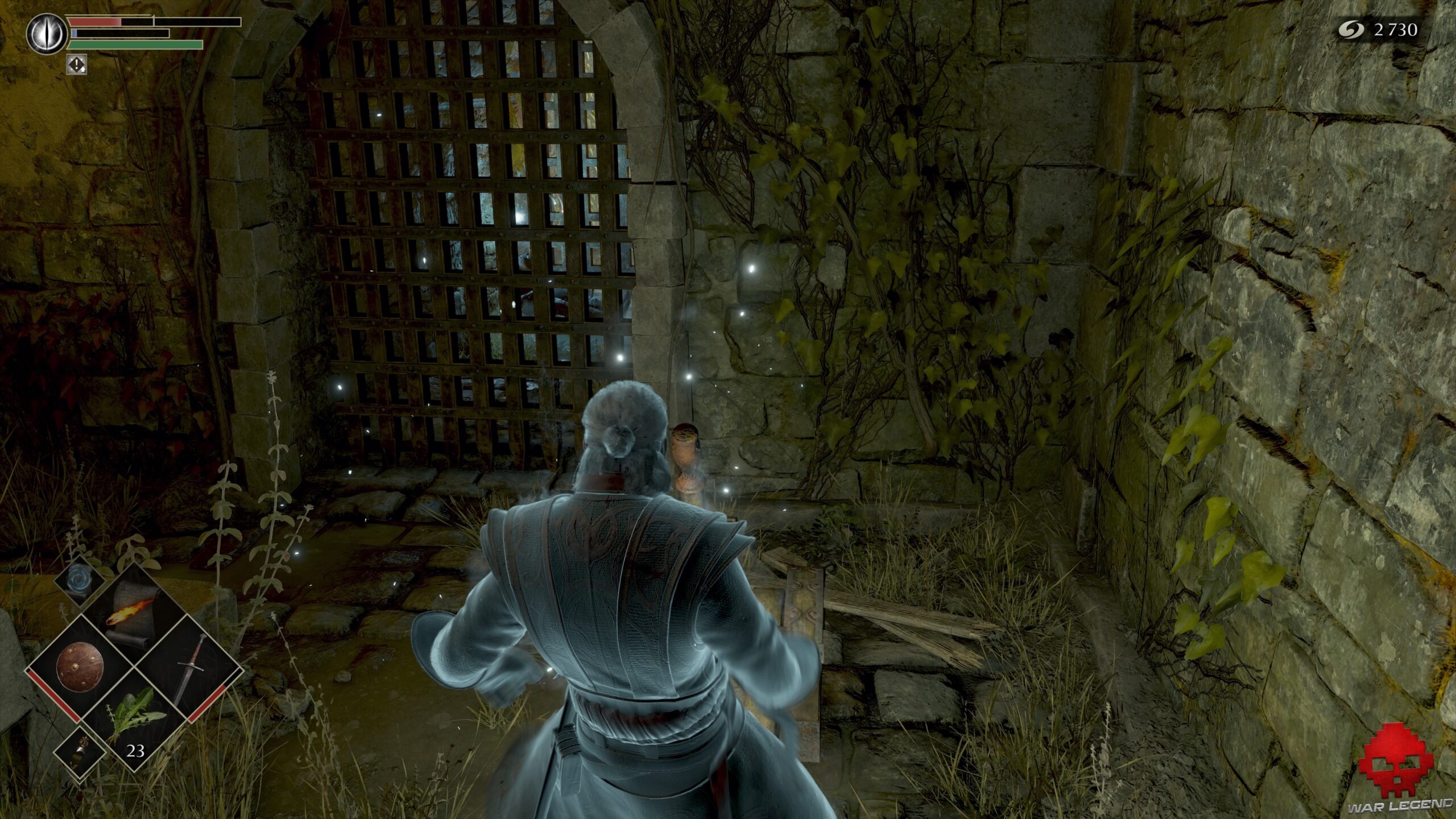 Descendez jusqu’en bas en tuant les ennemis et vous pourrez débloquer un raccourci vers l’archipierre. Tirez le levier pour ouvrir la herse et récupérez la Bague collante sur le cadavre. Celle-ci vous permet de garder plus de points de vie sous forme d’âme. En sortant, vous constaterez que les 2 chaînes que vous avez brisées plus haut, vous auront rapporté un et d’armure rapiécé et un Colifichet cheveux en jade, que vous pourrez remettre à Thomas au Nexus.