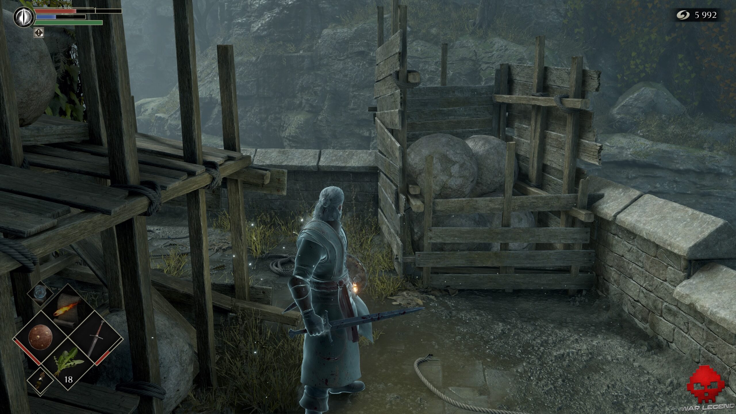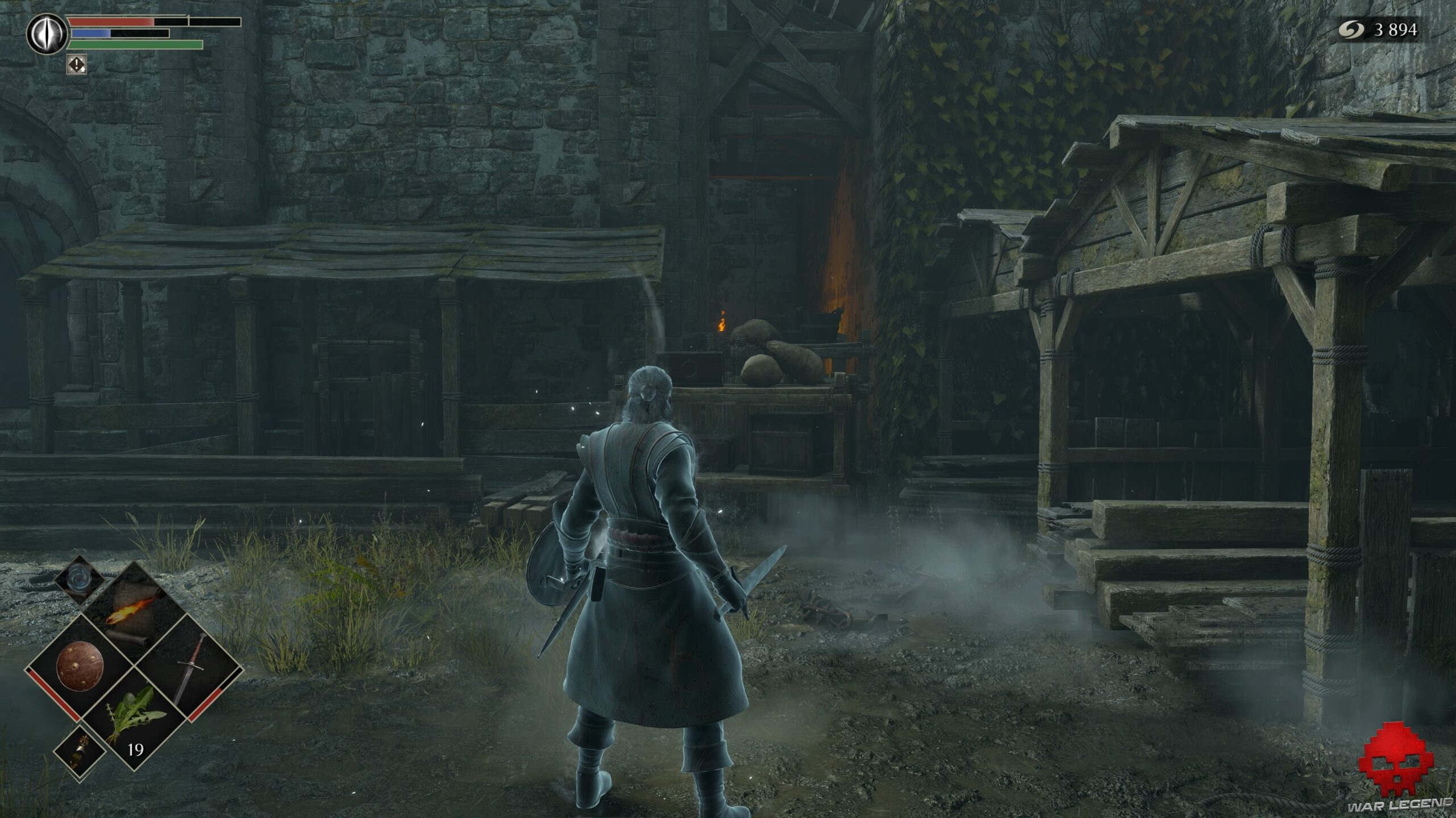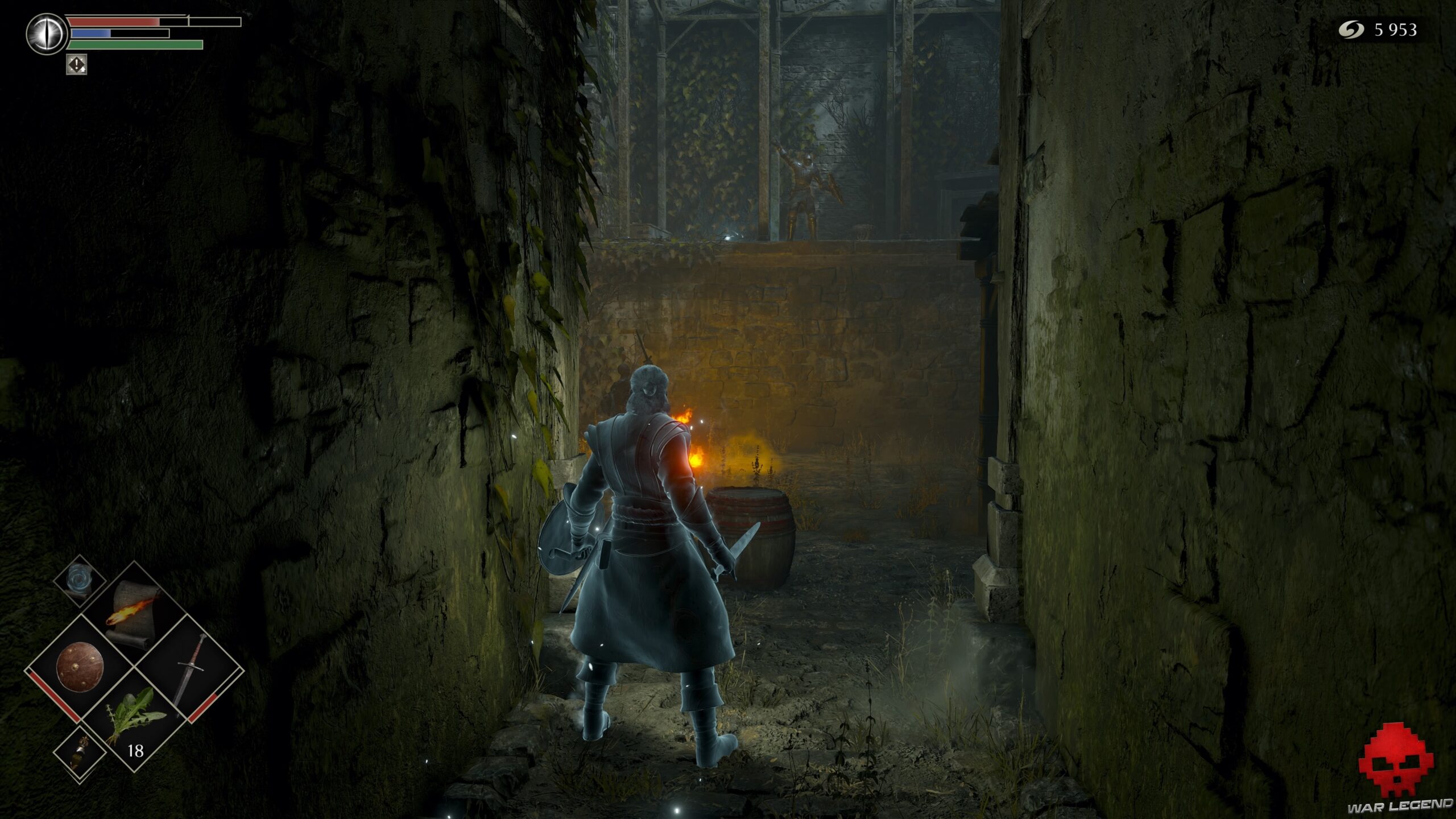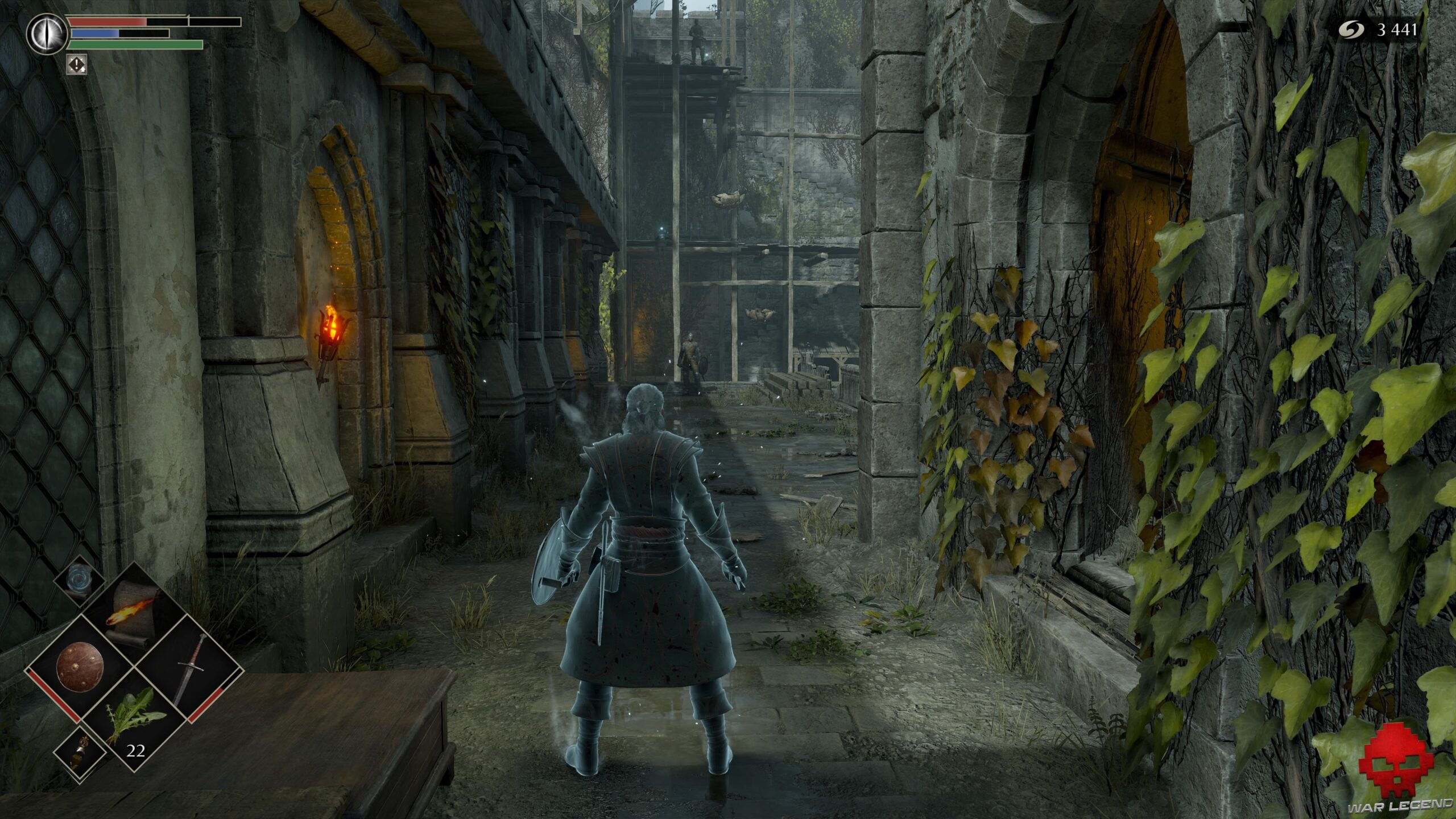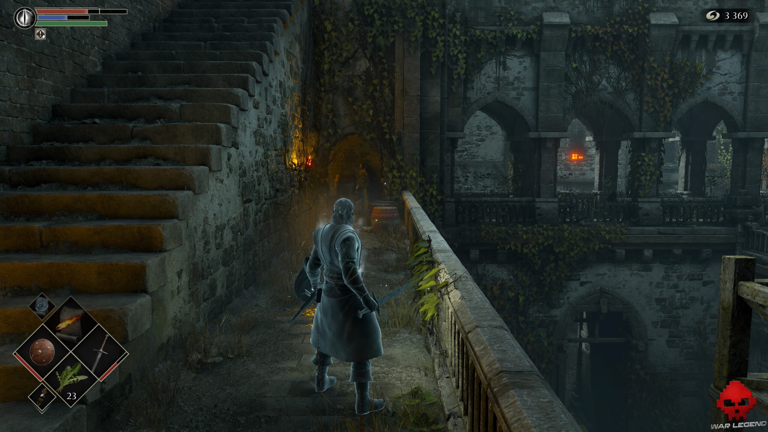 Immédiatement sur la droite se trouve 1 Âme du soldat inconnu. Tuez le chevalier bleu plus loin et prenez à gauche, là où un arbalétrier vous tire dessus. Attention juste à gauche après l’arche un ennemi vous tend une embuscade. À côté de l’arbalétrier se trouve 1 Âme du héros inconnu.