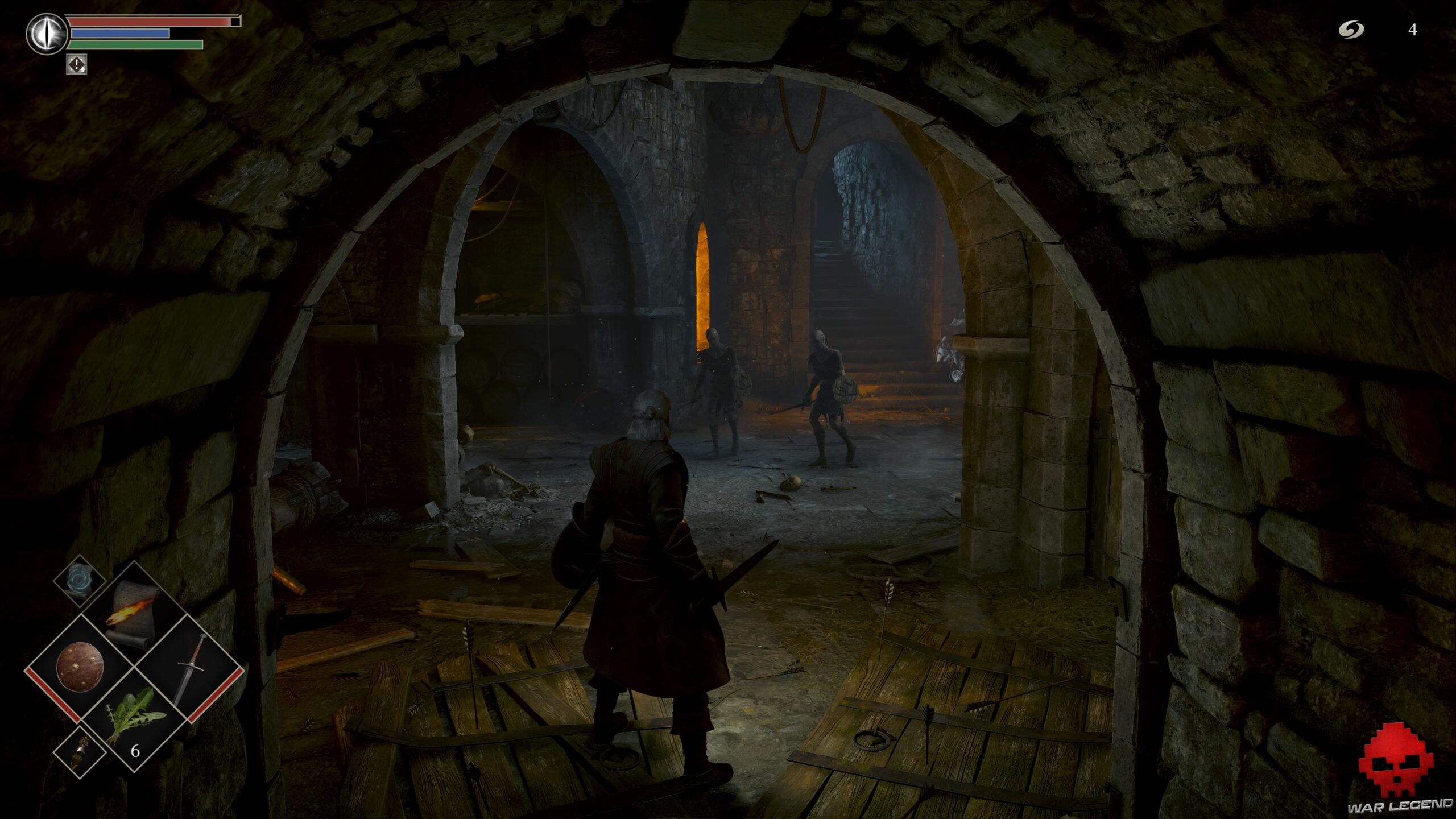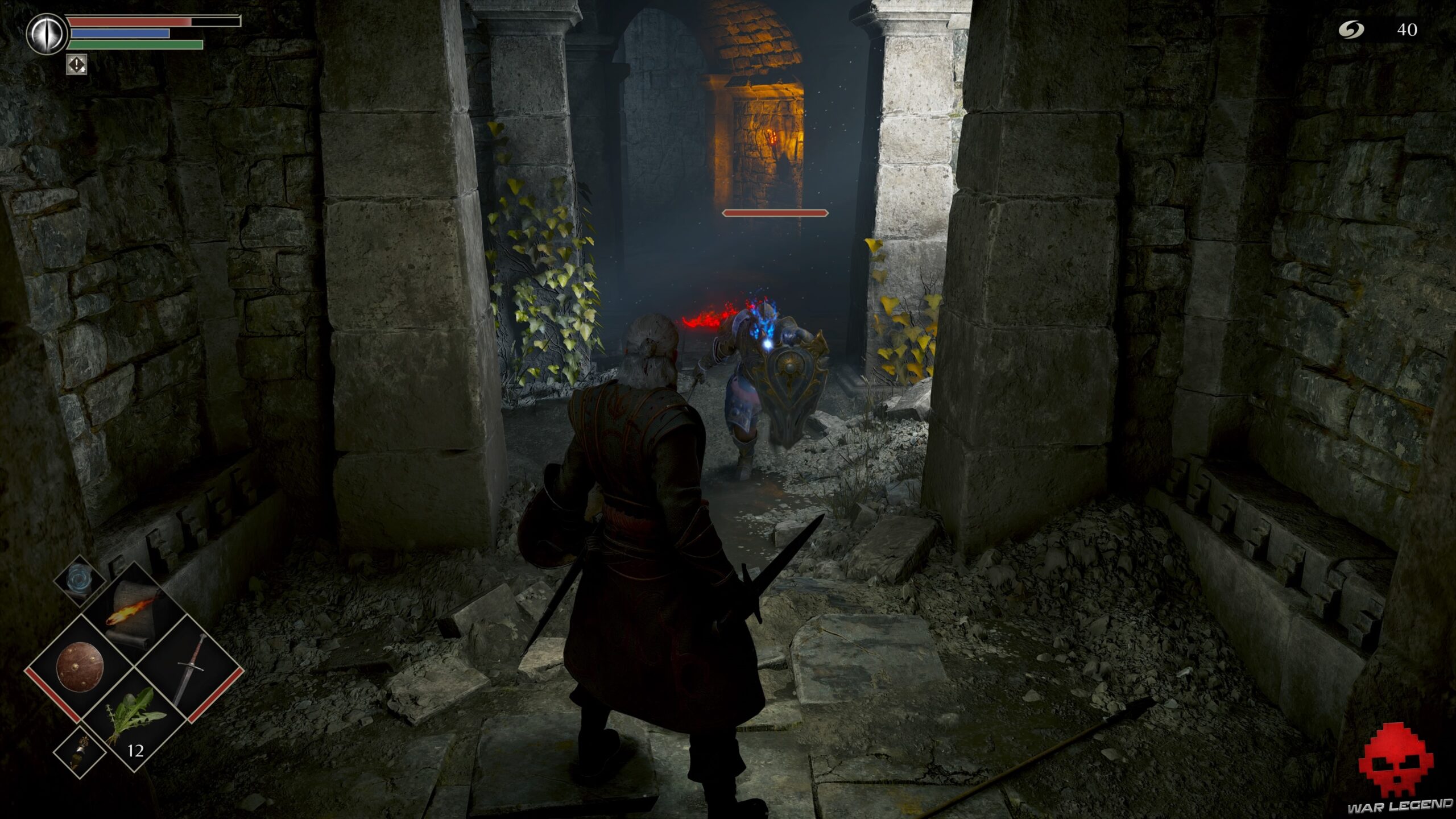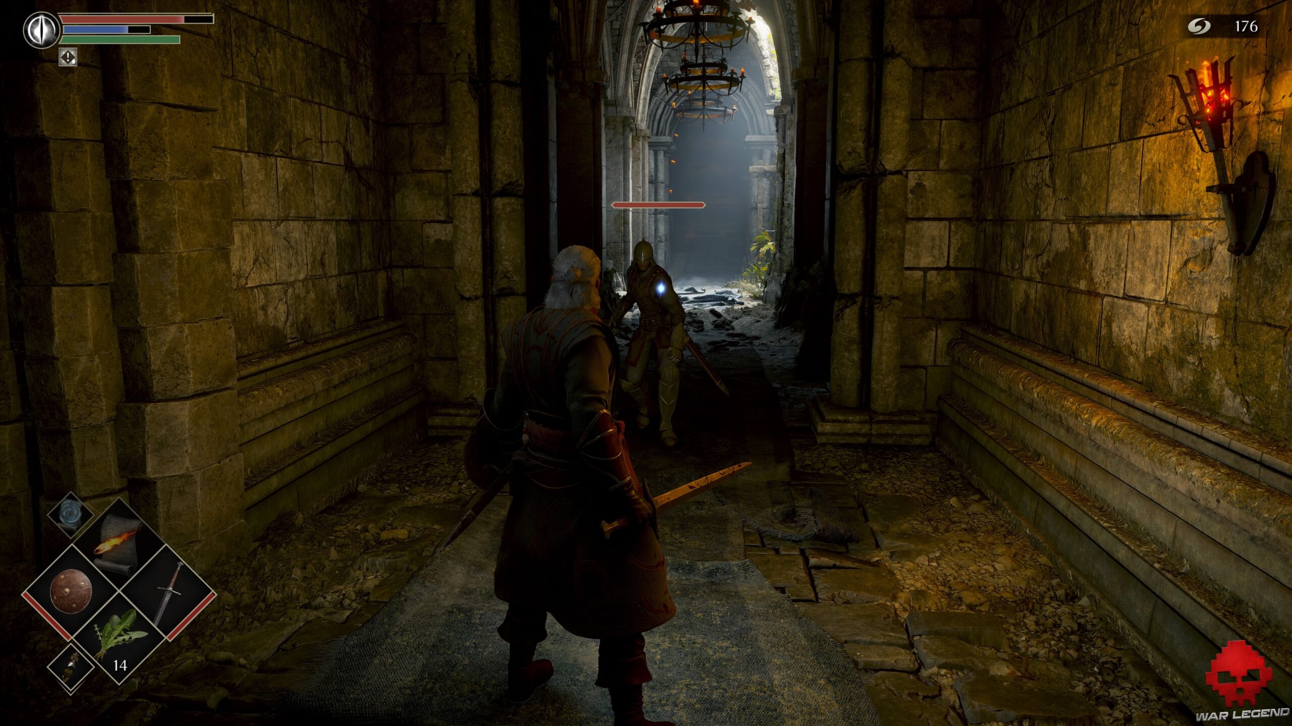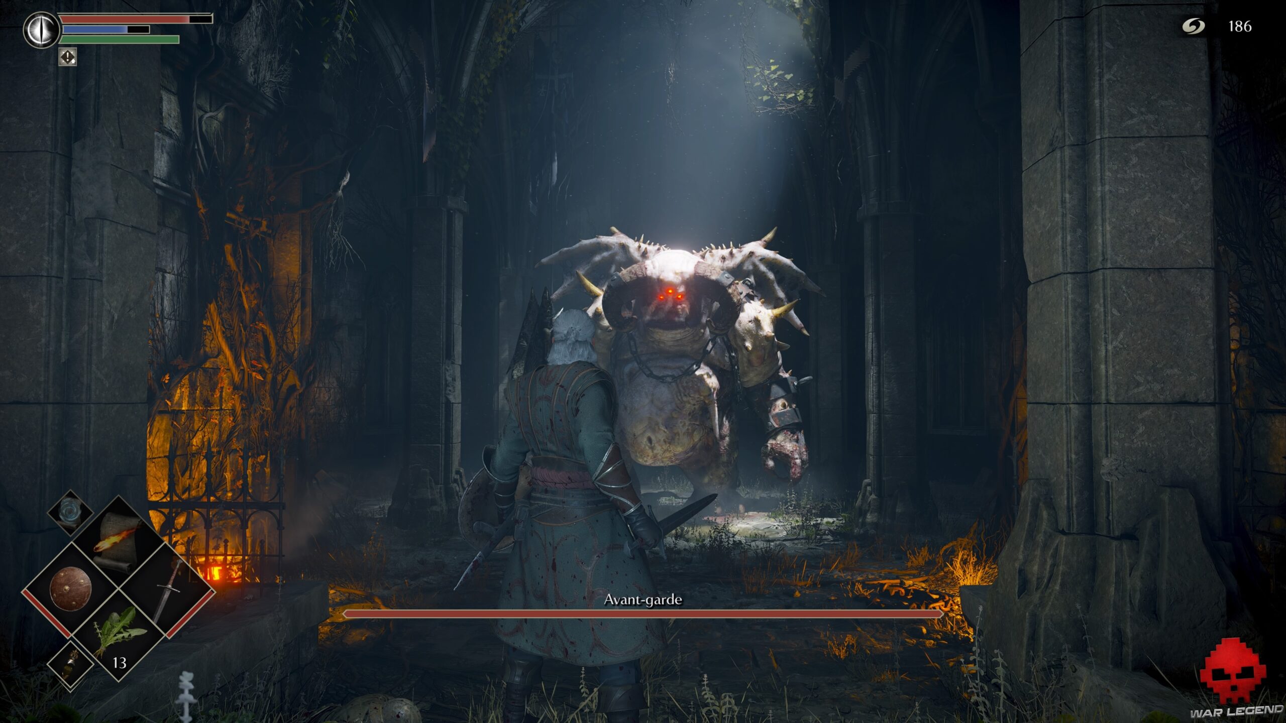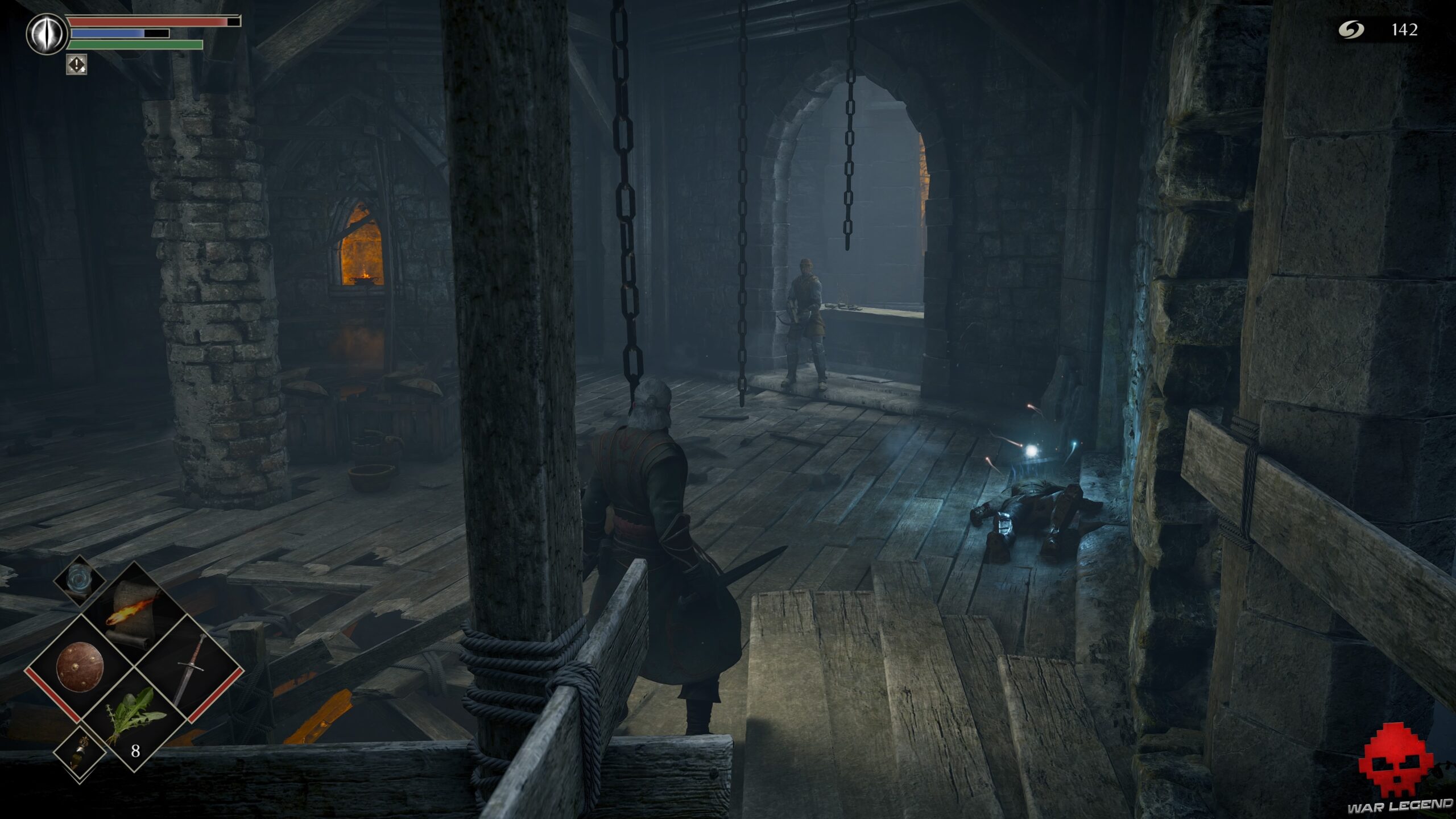 Un arbalétrier vous attend bien sagement. Avancez vers lui bouclier levé si vous en avez un ou bien faites une roulade au moment où il tire. Prenez l’Âme du soldat inconnu sur le cadavre à côté et continuez par le seul chemin possible.