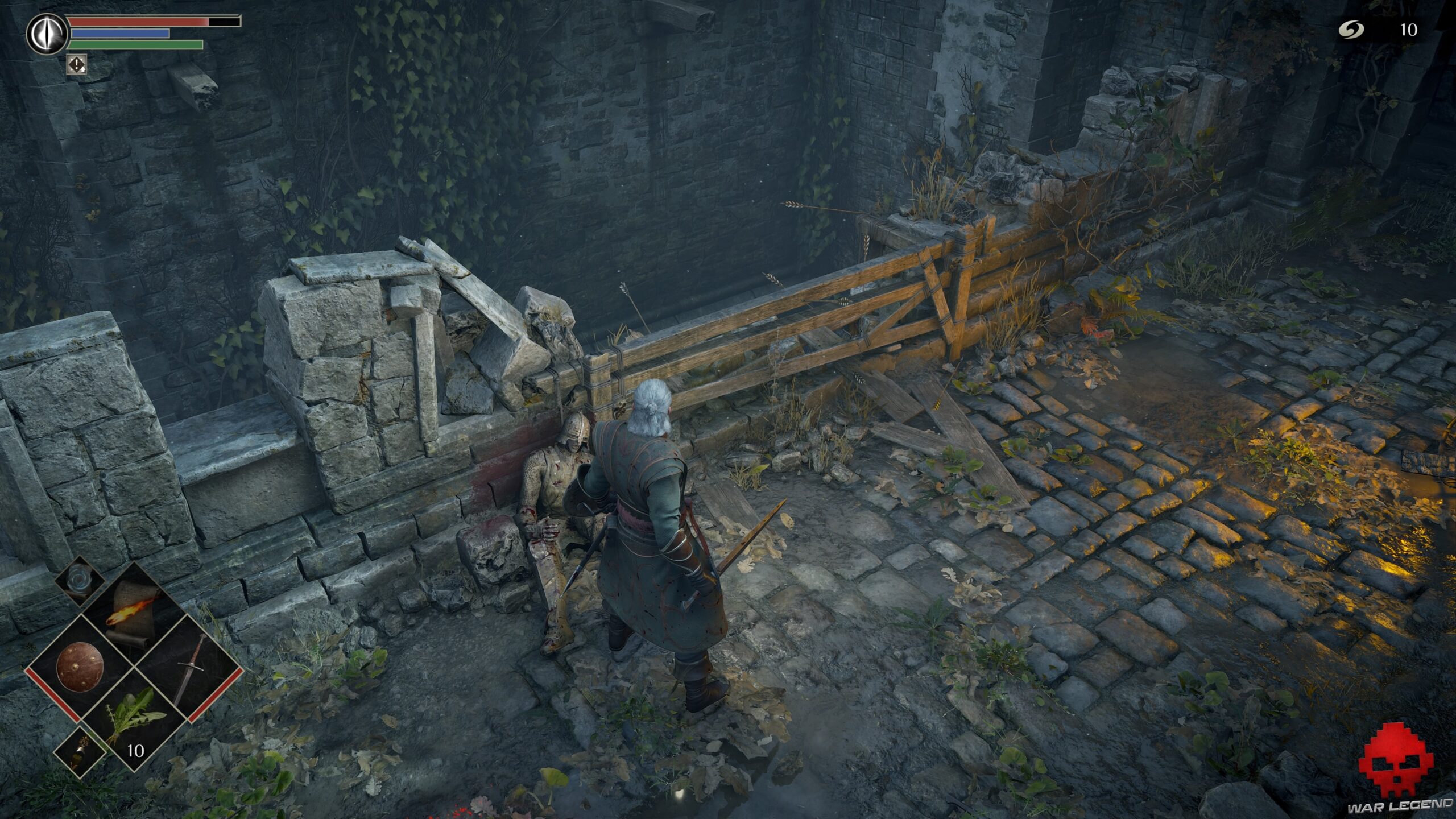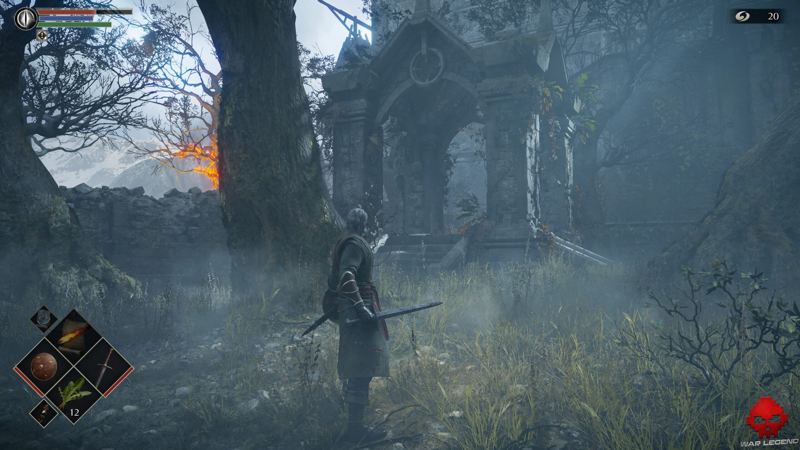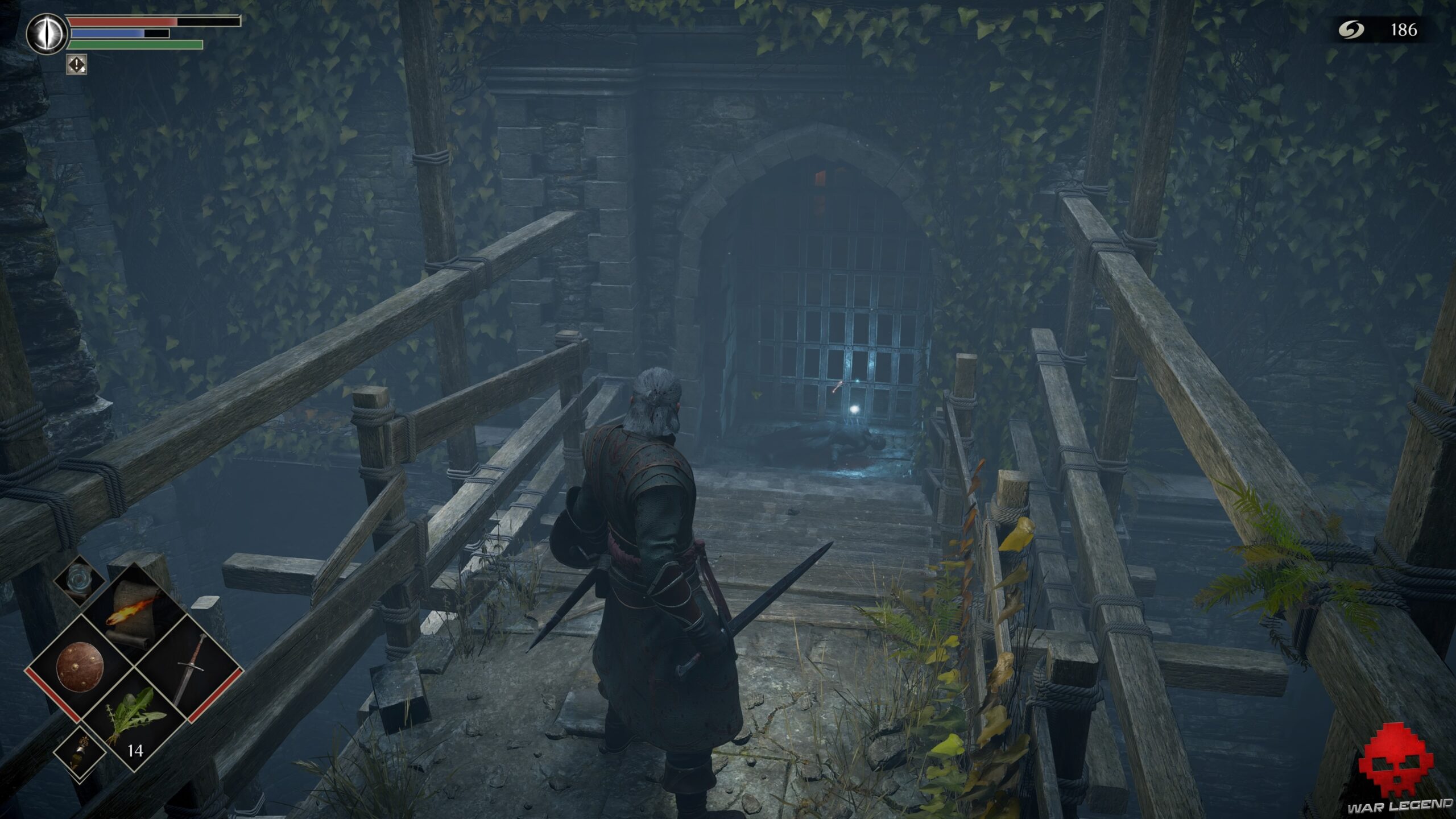 En montant les derniers escaliers qui vous séparent du brouillard, éliminer un épéiste puis un arbalétrier et engagez-vous dans la brume. Tuez le soldat qui arrive sur votre gauche, mais n’oubliez pas d’aller chercher 2 Herbes de la demi-lune de l’autre côté avant de poursuivre.