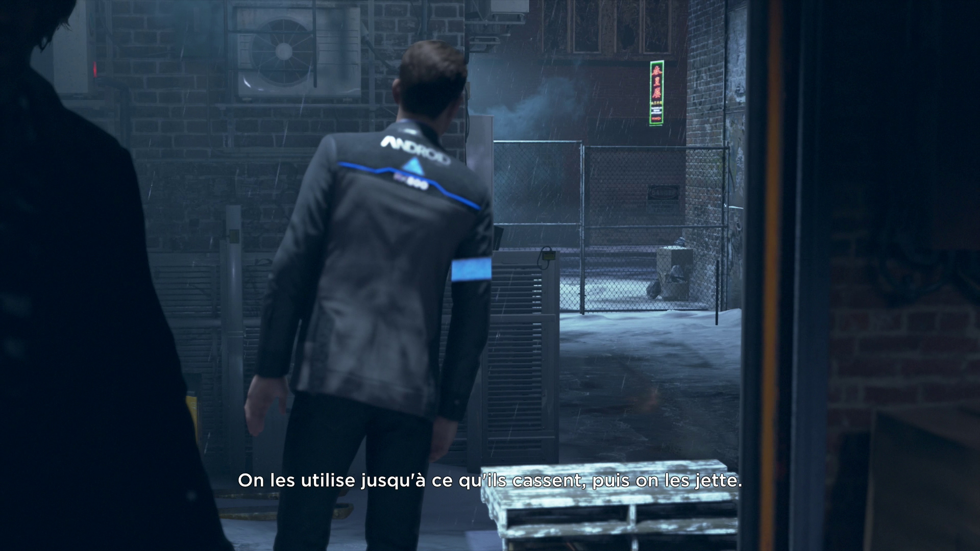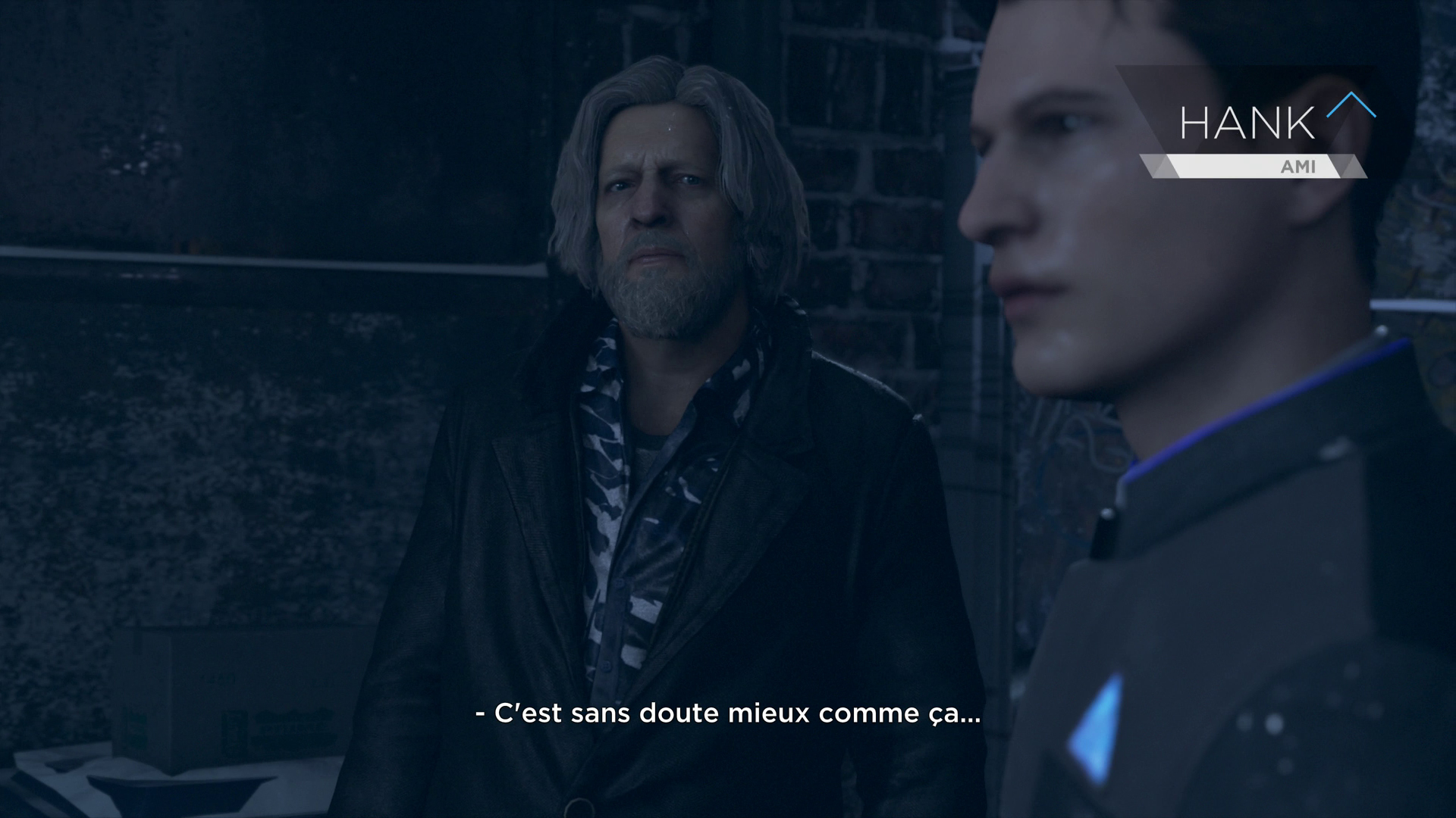Après avoir été témoins d’une scène pareille, Connor et Hank décident de les laisser partir. Hank commence à changer sérieusement de point de vue sur les androïdes.