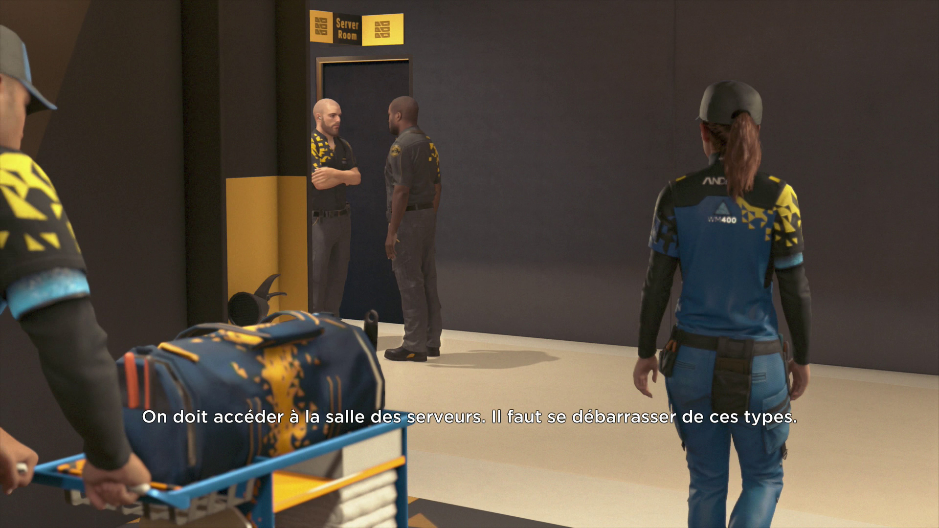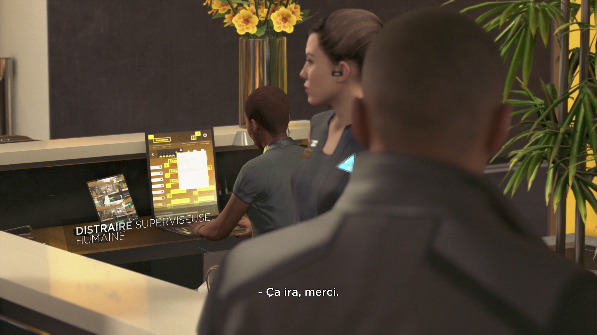 Dans le hall, parlez à l’androïde standardiste. Une superviseuse humaine vous empêche de rentrer sans donner l’alerte.