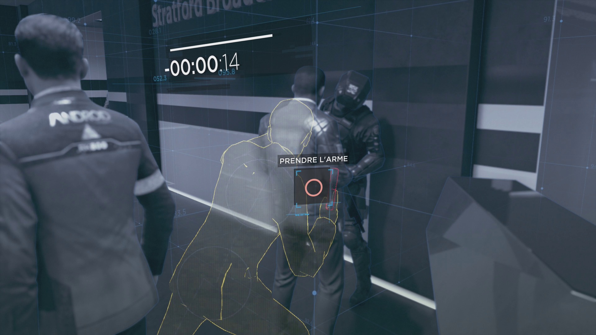 L’androïde se saisit d’une arme. Regardez à droite et prenez l’arme de l’agent près de vous.