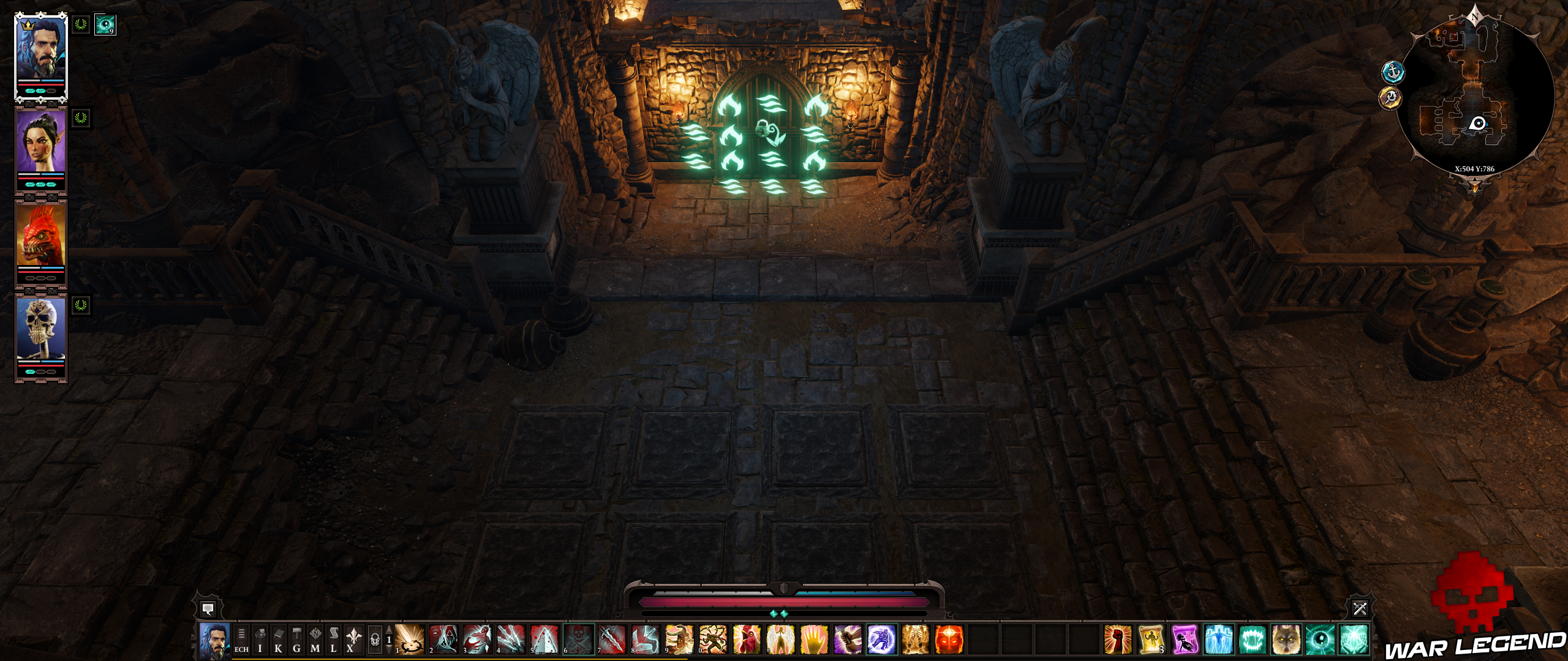 Empruntez la trappe pour accéder au niveau inférieur. Au centre de la pièce, des dalles de pression qui composent un puzzle. La combinaison est visible grâce à Vision spirituelle. Reproduisez-la pour pouvoir débloquer le verrou magique de la porte.