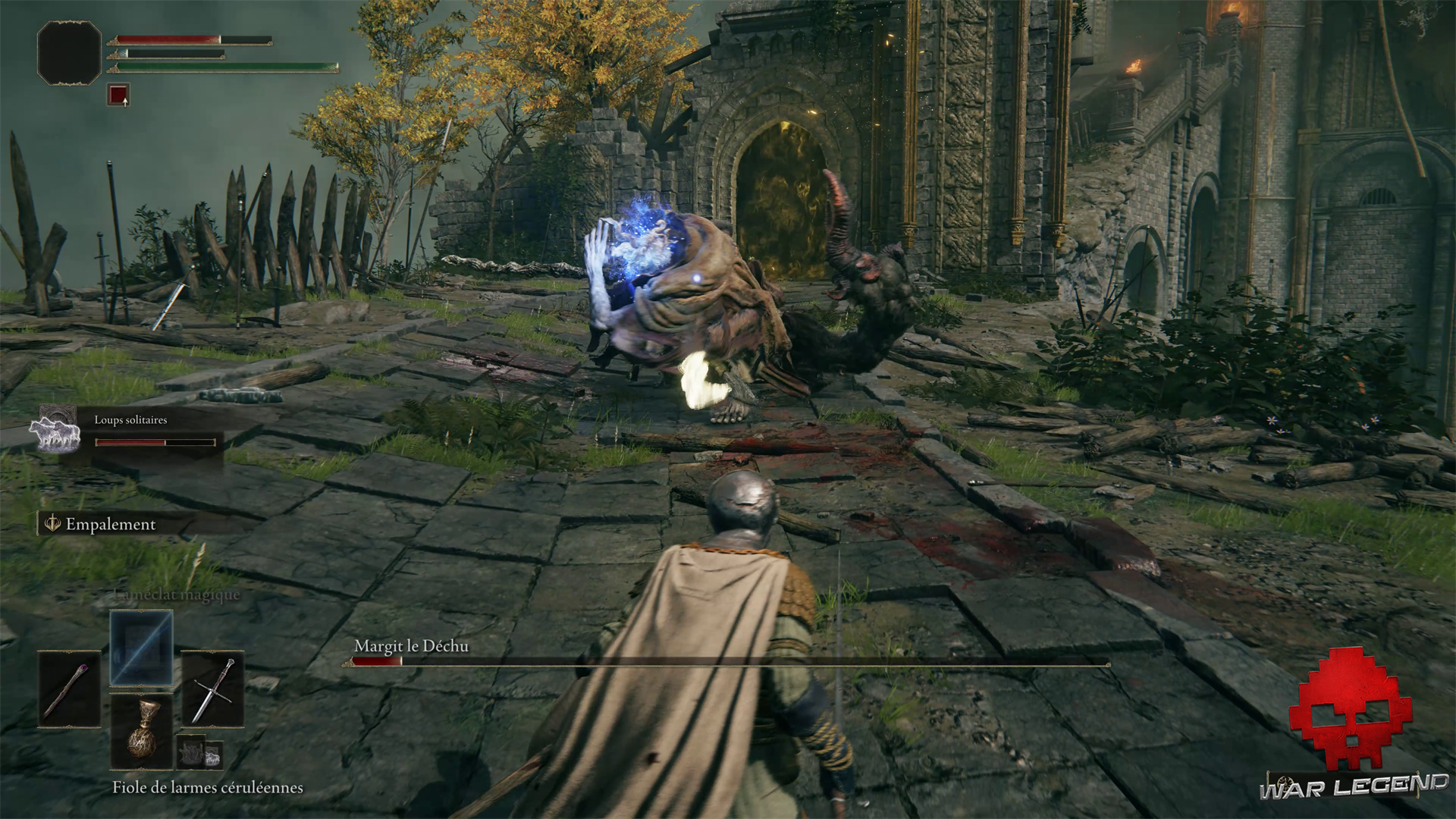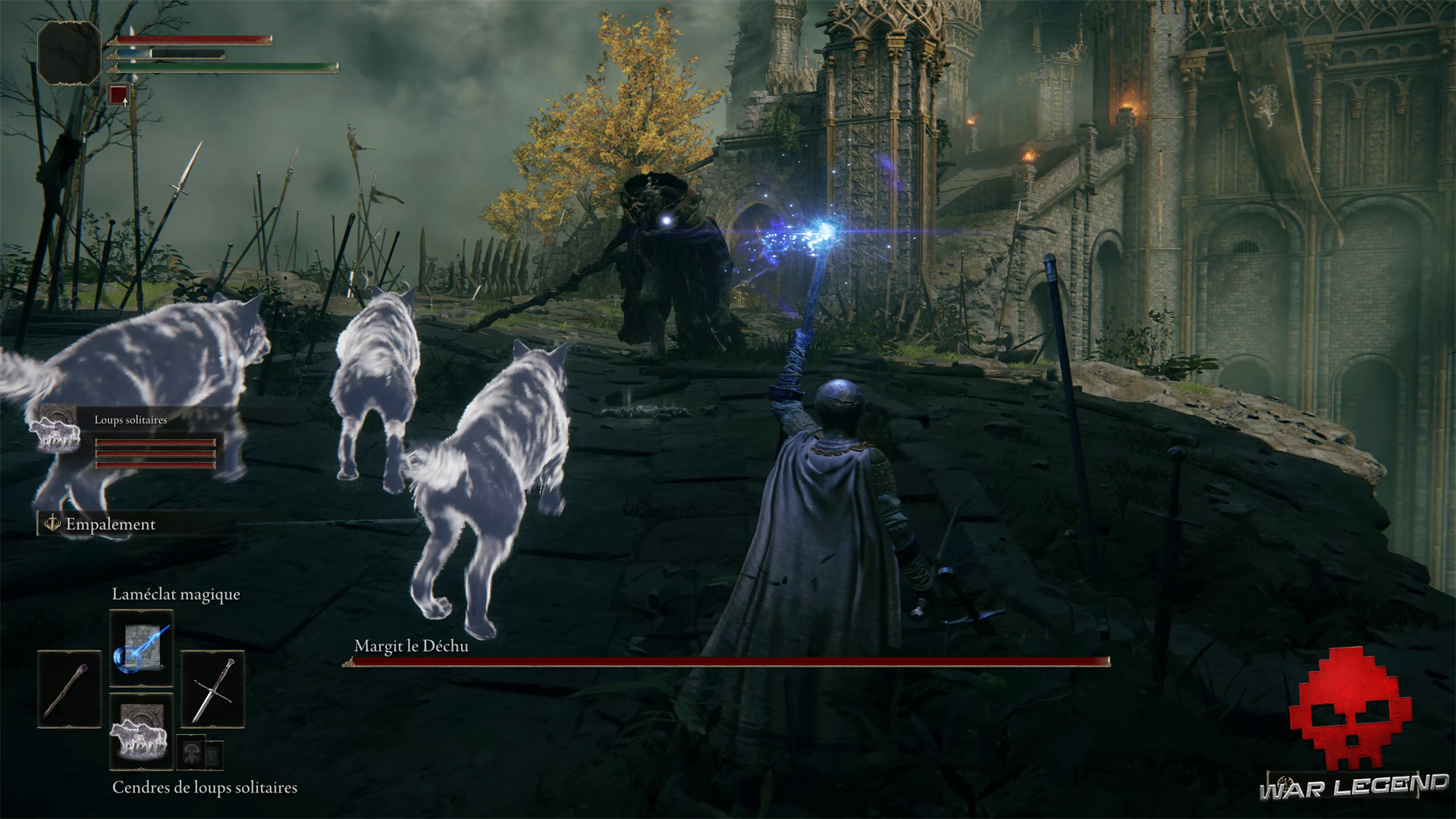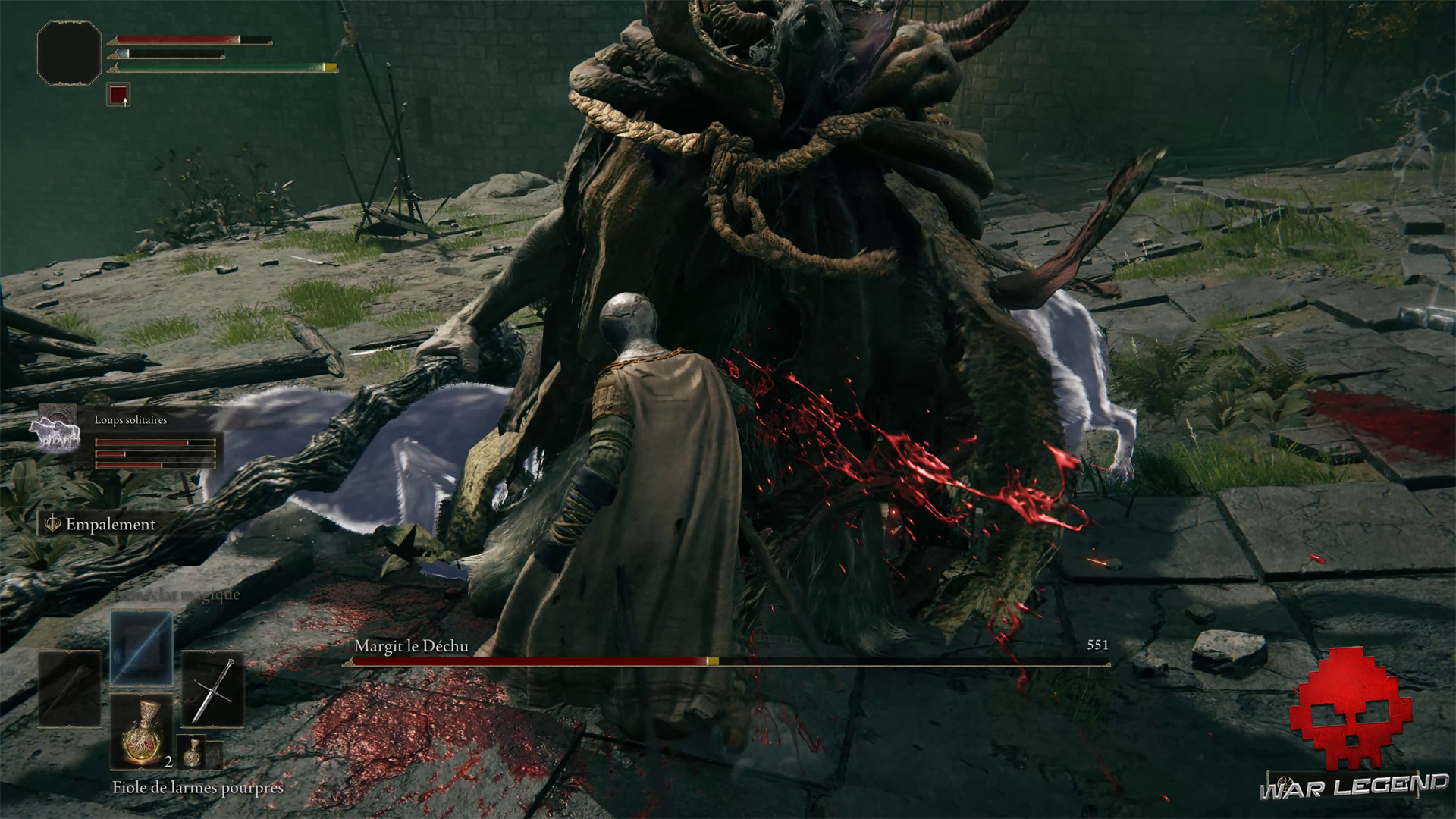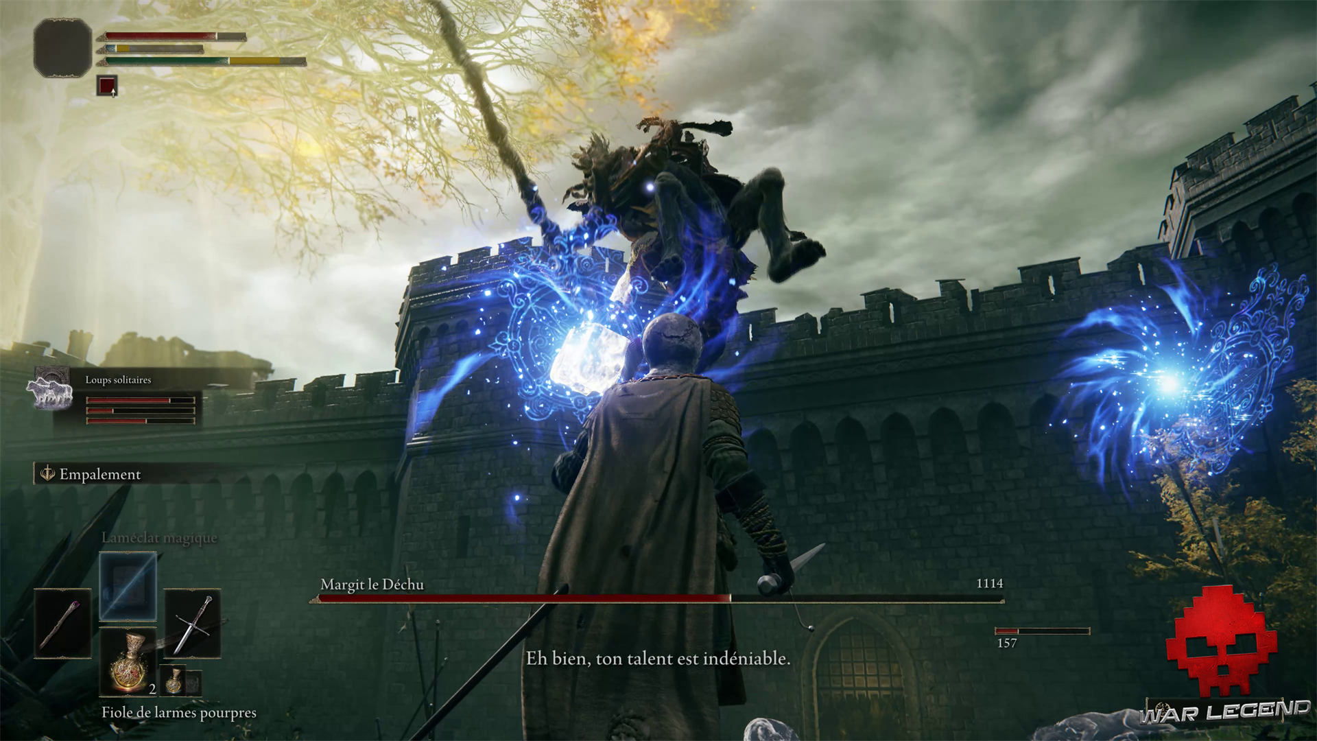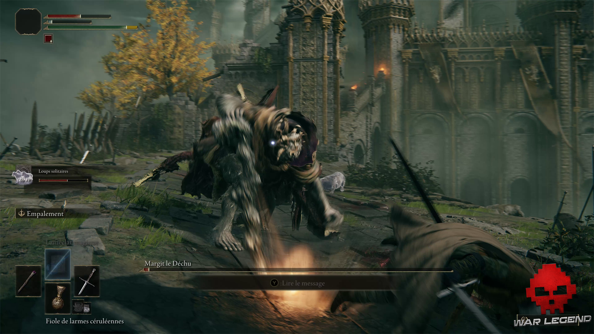 Margit Le Déchu est le premier véritable boss obligatoire d’Elden Ring. Et également un sacré pic de difficulté. Si vous trouvez le combat vraiment trop compliqué, n’hésitez pas à explorer le reste de Nécrolimbe pour gagner quelques niveaux et glaner de l’équipement supplémentaire.