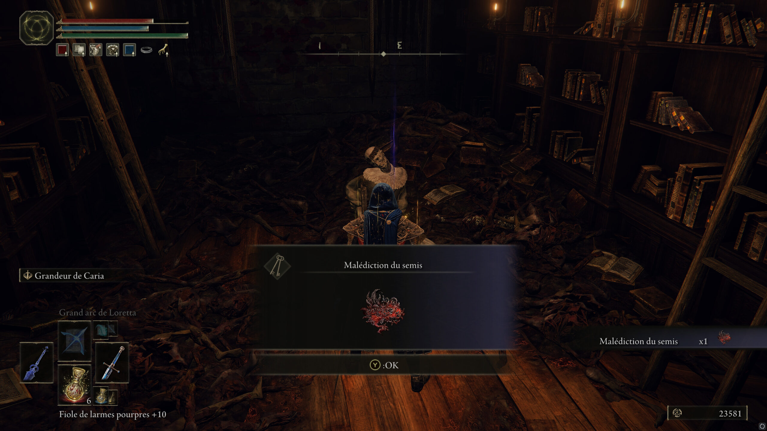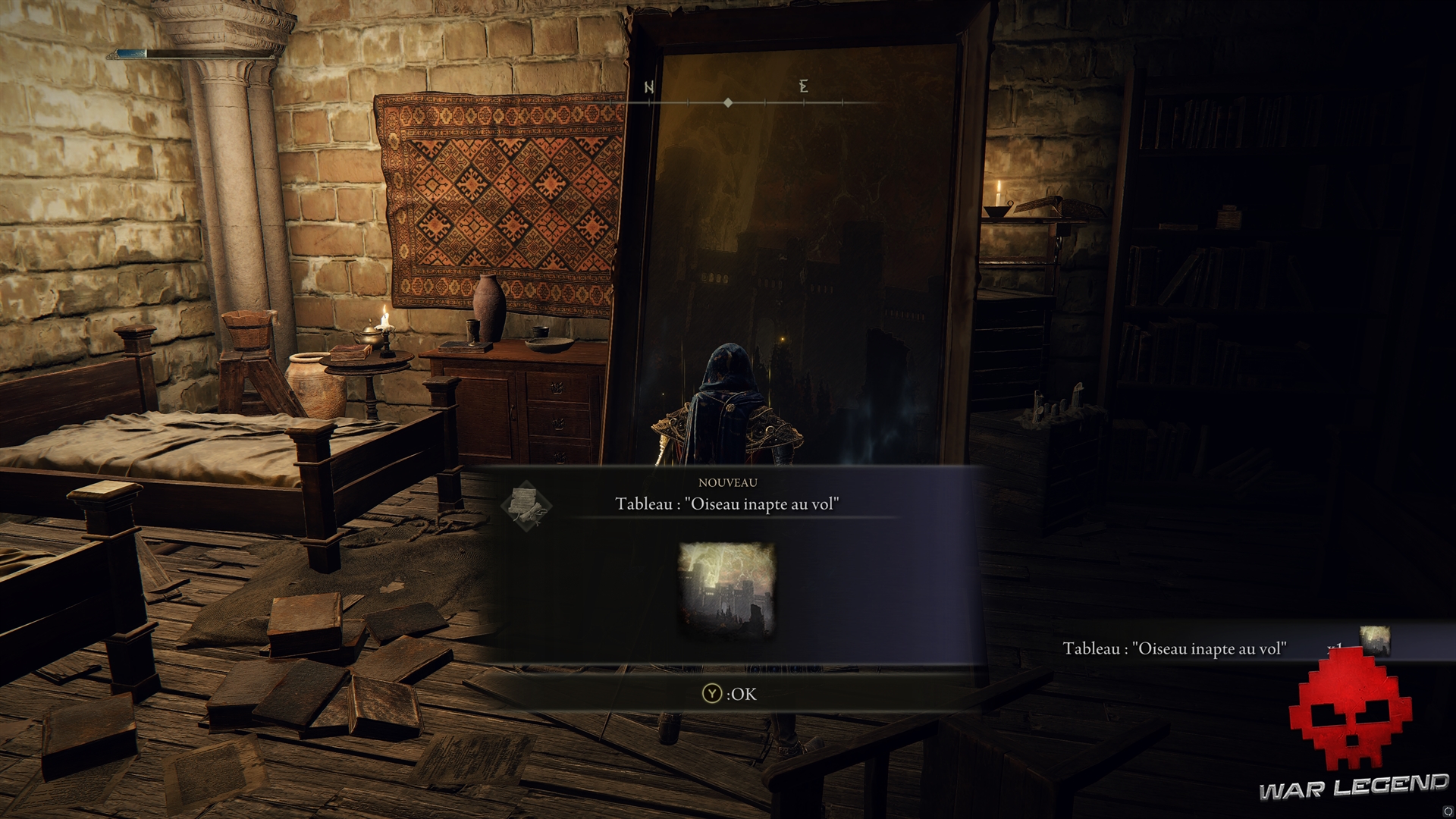 Récupérez l’ensemble d’Alberich au fond de la salle, activez un site de grâce et récupérez le Tableau : Oiseau inapte au vol dans une pièce, puis le Bréviaire des Deux Doigts dans une autre.