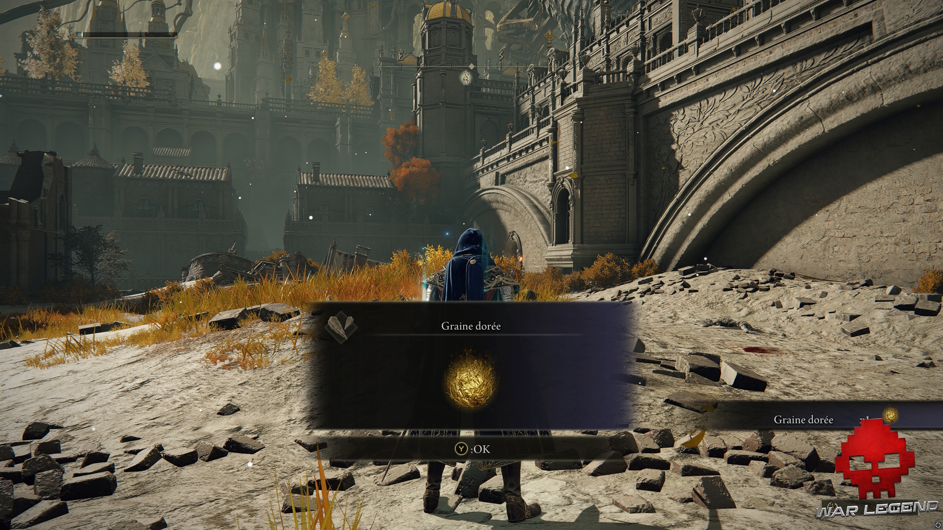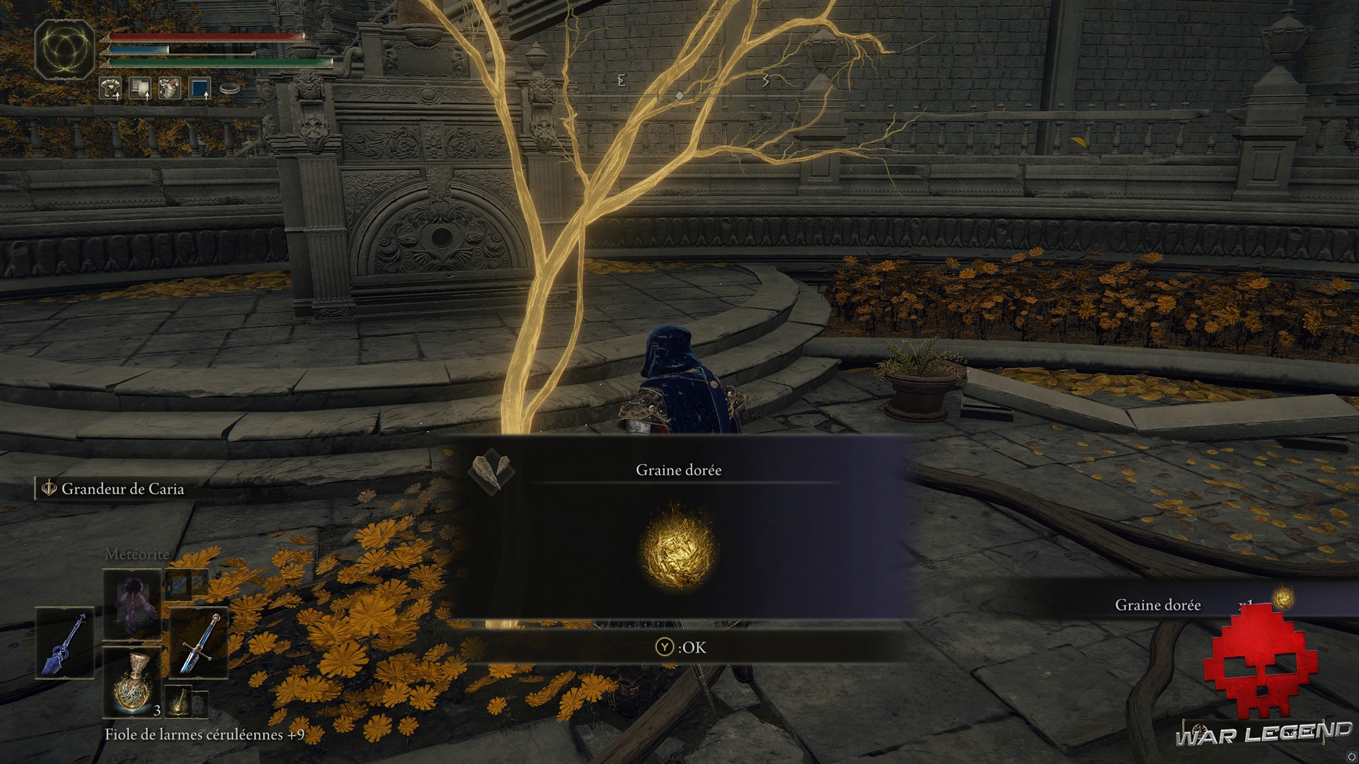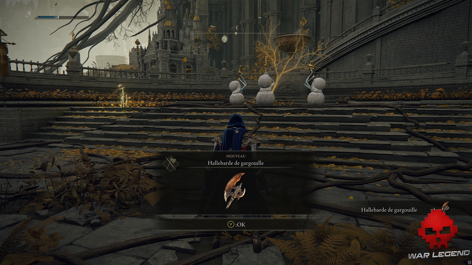 Remontez par les escaliers et occupez-vous de la gargouille que vous n’avez pas pu rater : le combat est très similaire à celle que vous avez croisé dans les faubourgs de Leyndell. Vous pourrez alors récupérer son Hallebarde de gargouille, ainsi que la Graine dorée vénérée par les 3 créatures.