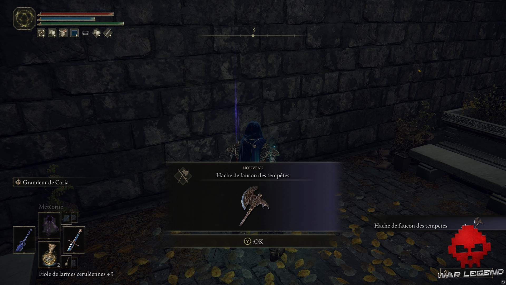 Il est possible de continuer à explorer le manoir, mais vous tomberez alors sur deux Vierges ravisseuses, alors procédez avec prudence. Dans la cour, vous pourrez ramasser une Hache de faucon des tempêtes.