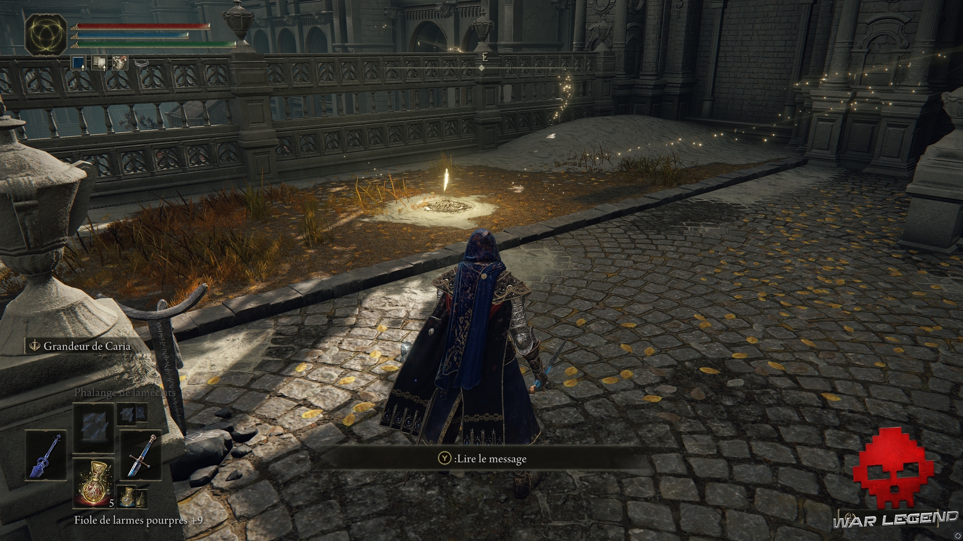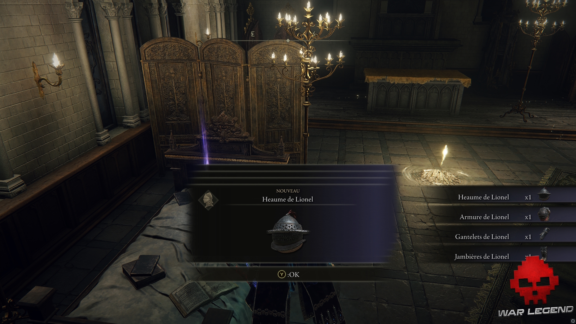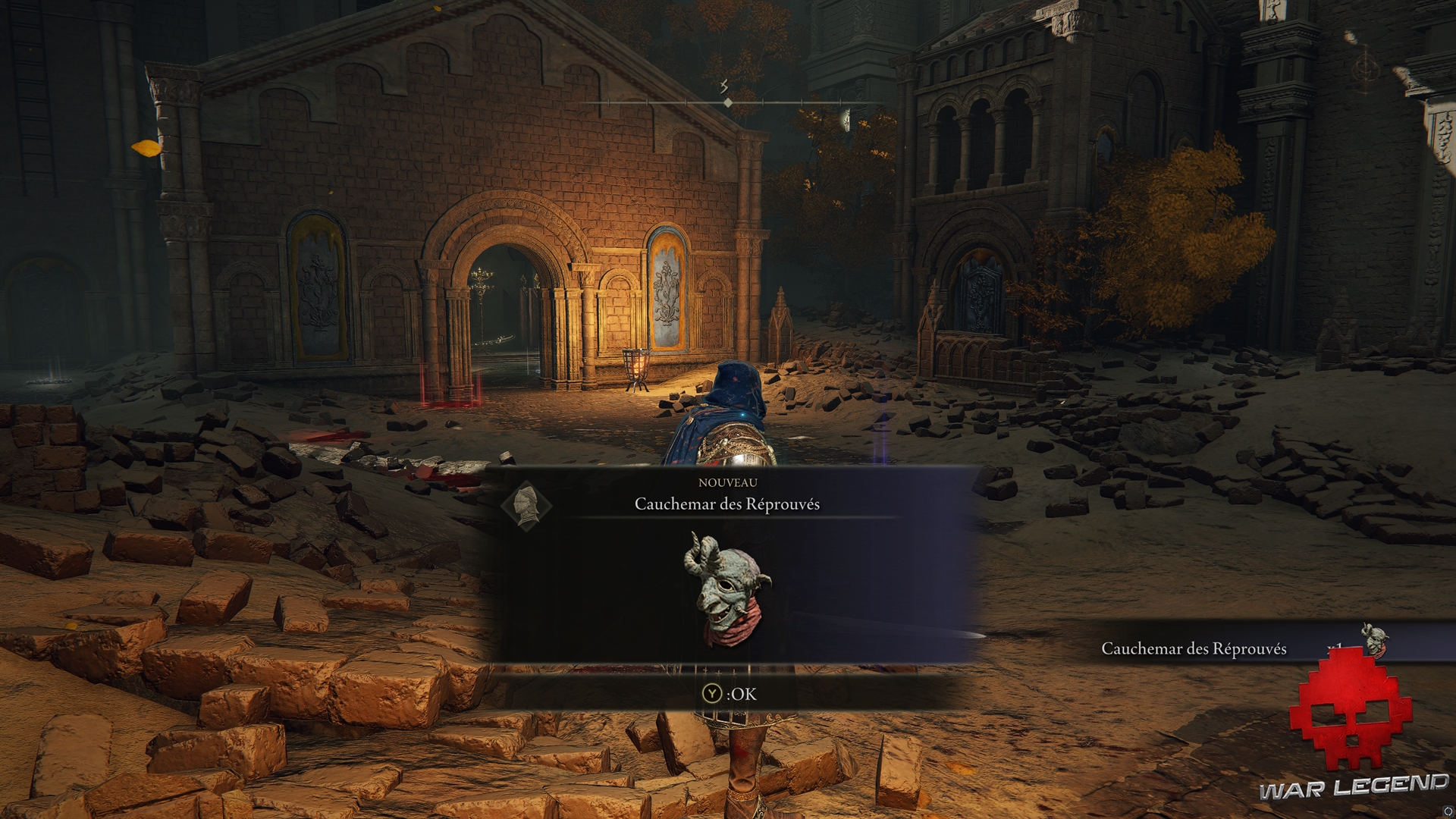 Revenez un peu plus en amont et montez à l’échelle : tuer le guerrier Réprouvé pour obtenir un casque, le Cauchemar des Réprouvés, puis allez activer le site de grâce dans la chapelle. Vous obtiendrez d’ailleurs l’ensemble d’armure de Lionel.