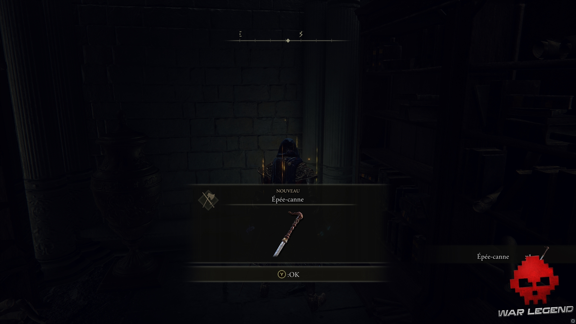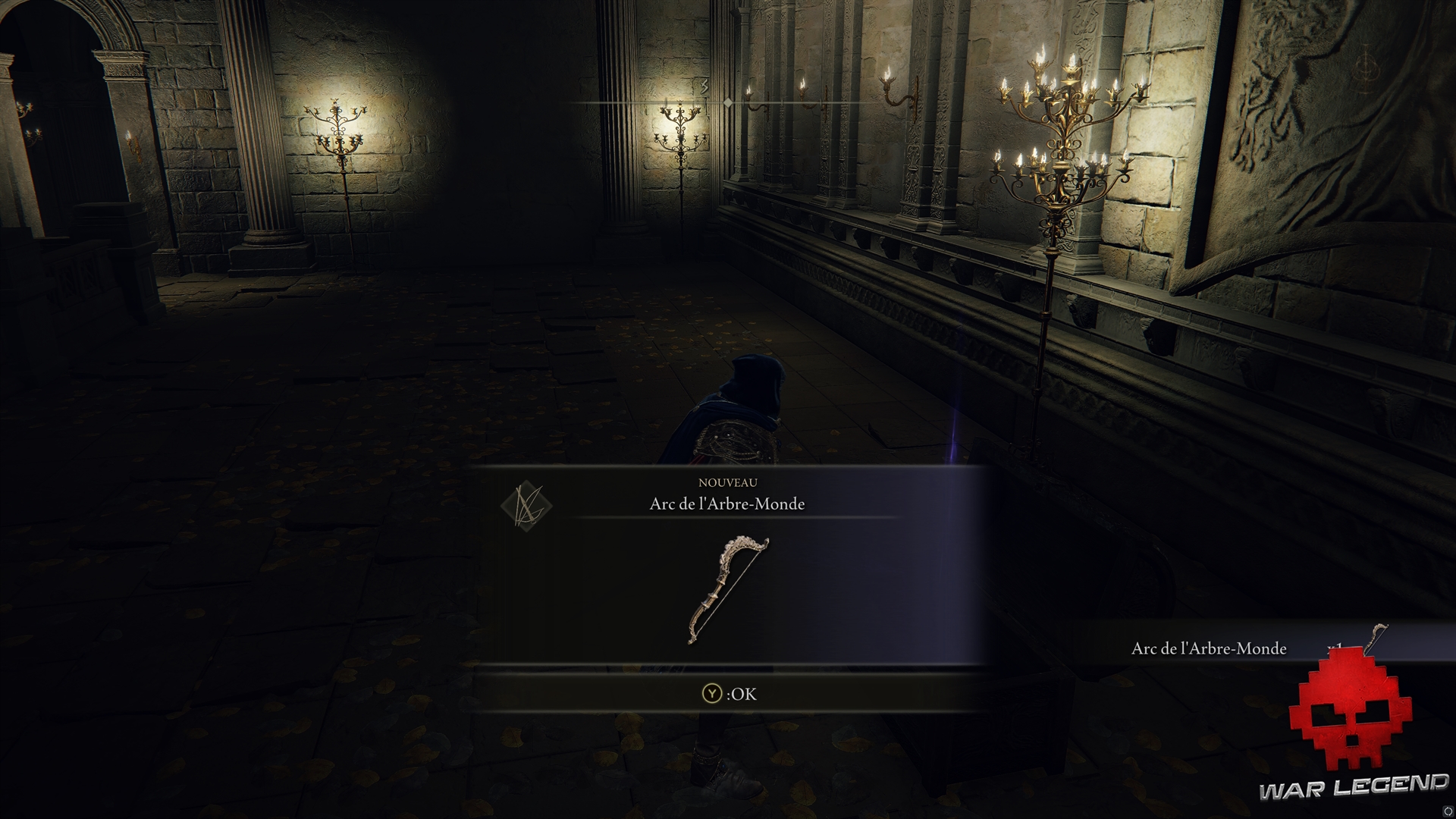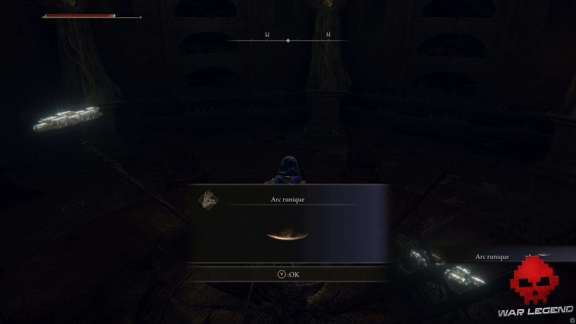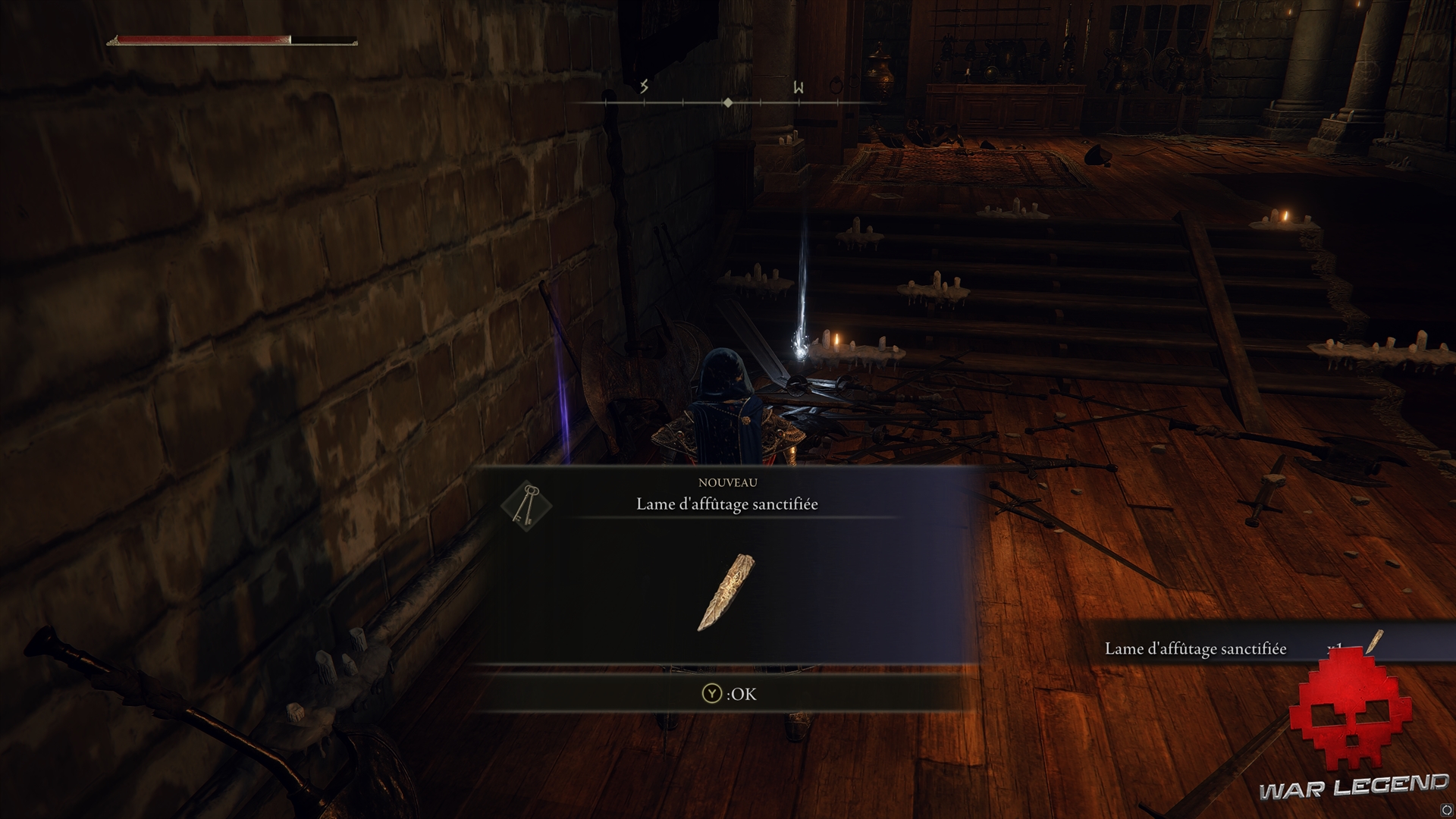 En farfouillant un peu partout, vous pourrez mettre la main sur un Arc runique, le Marteau, une Lame d’affutage sanctifiée, l’Epée cryptée dans une salle fermée adjacente à la table ronde, une emote, une Clé-lame, et une Malédiction du semis, entre autres.