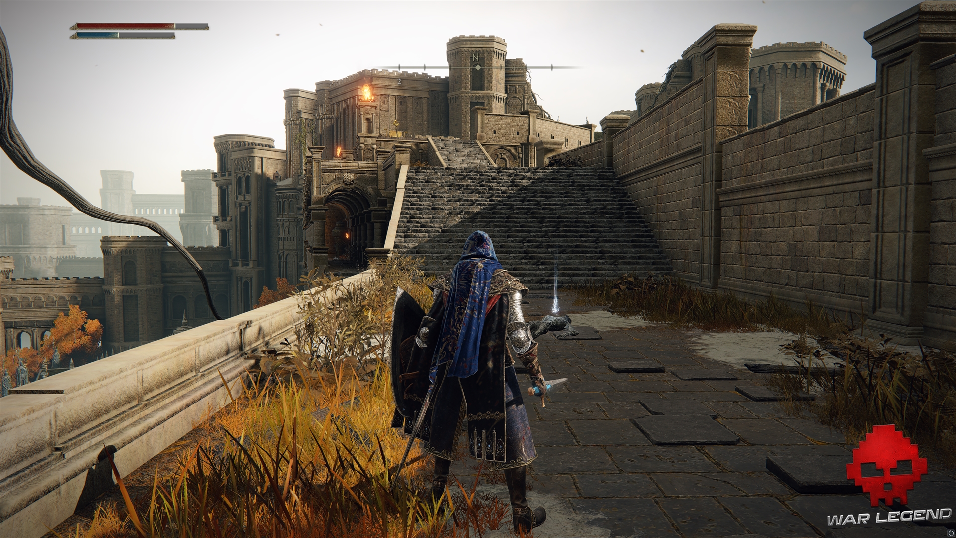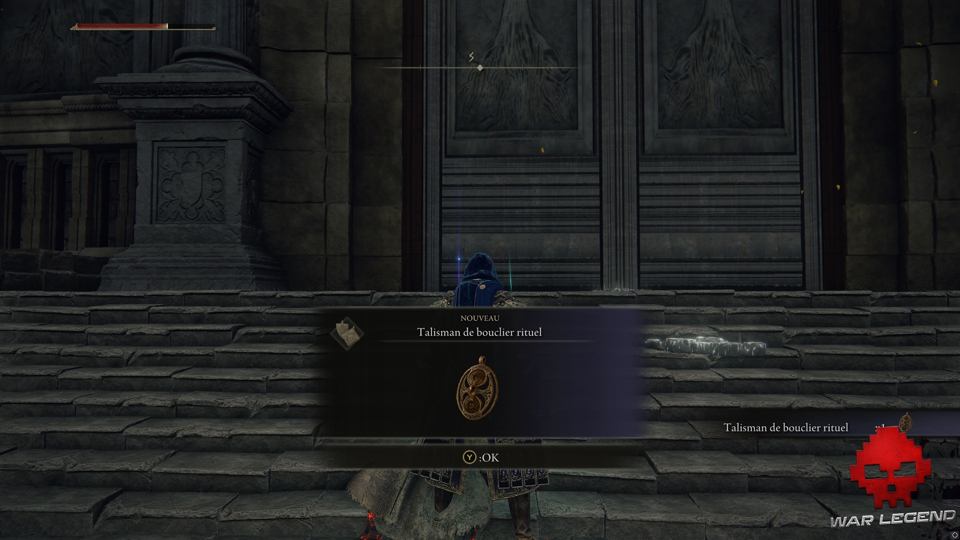 En remontant sur le rempart, continuez au-delà de l’arbre doré pour grimper la colline derrière le manoir. Sur la pente et jusqu’à l’arène, vous affronterez deux duellistes assez balèzes, mais vous pourrez récupérer un Talisman de bouclier rituel au bout du chemin.