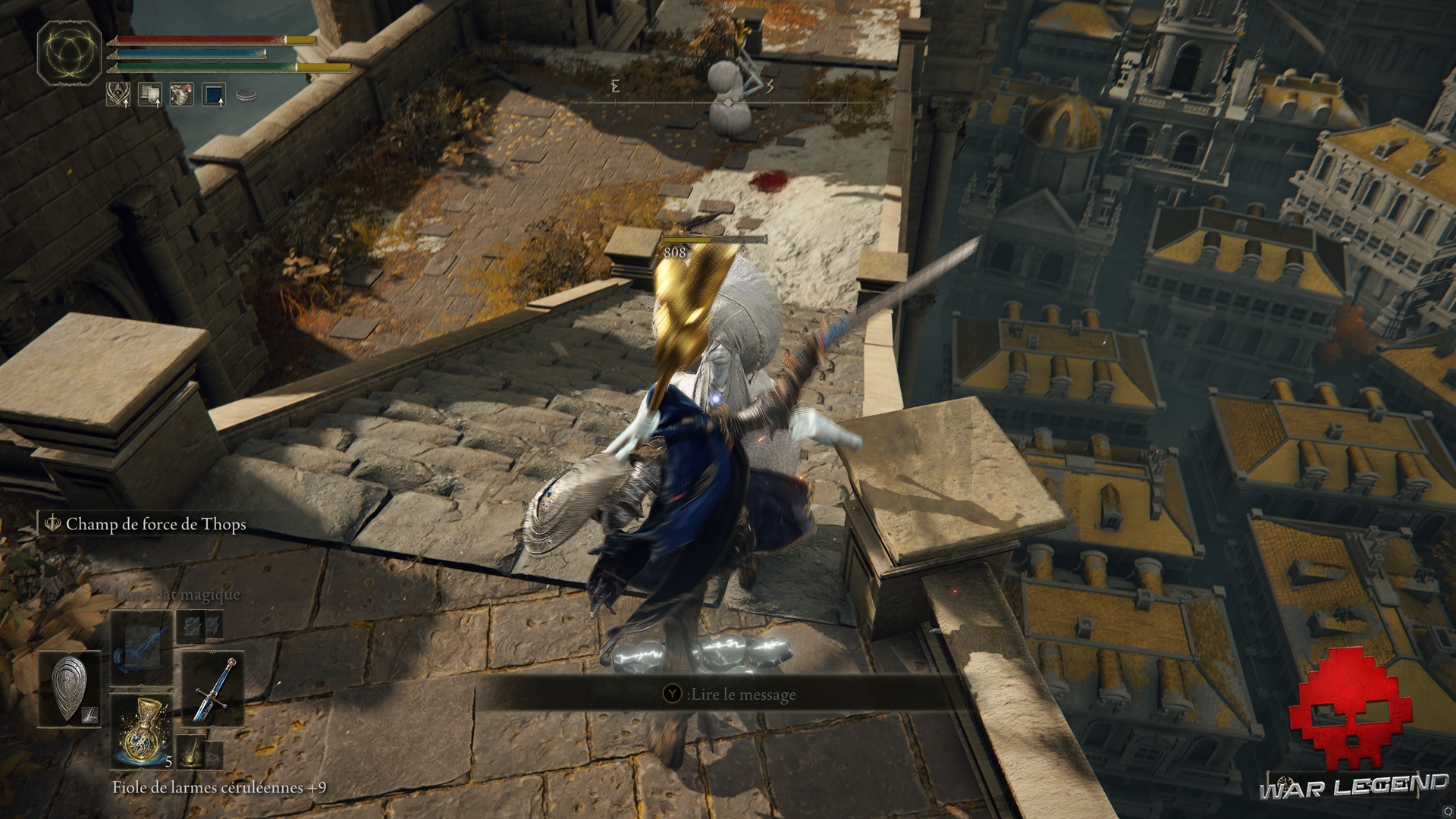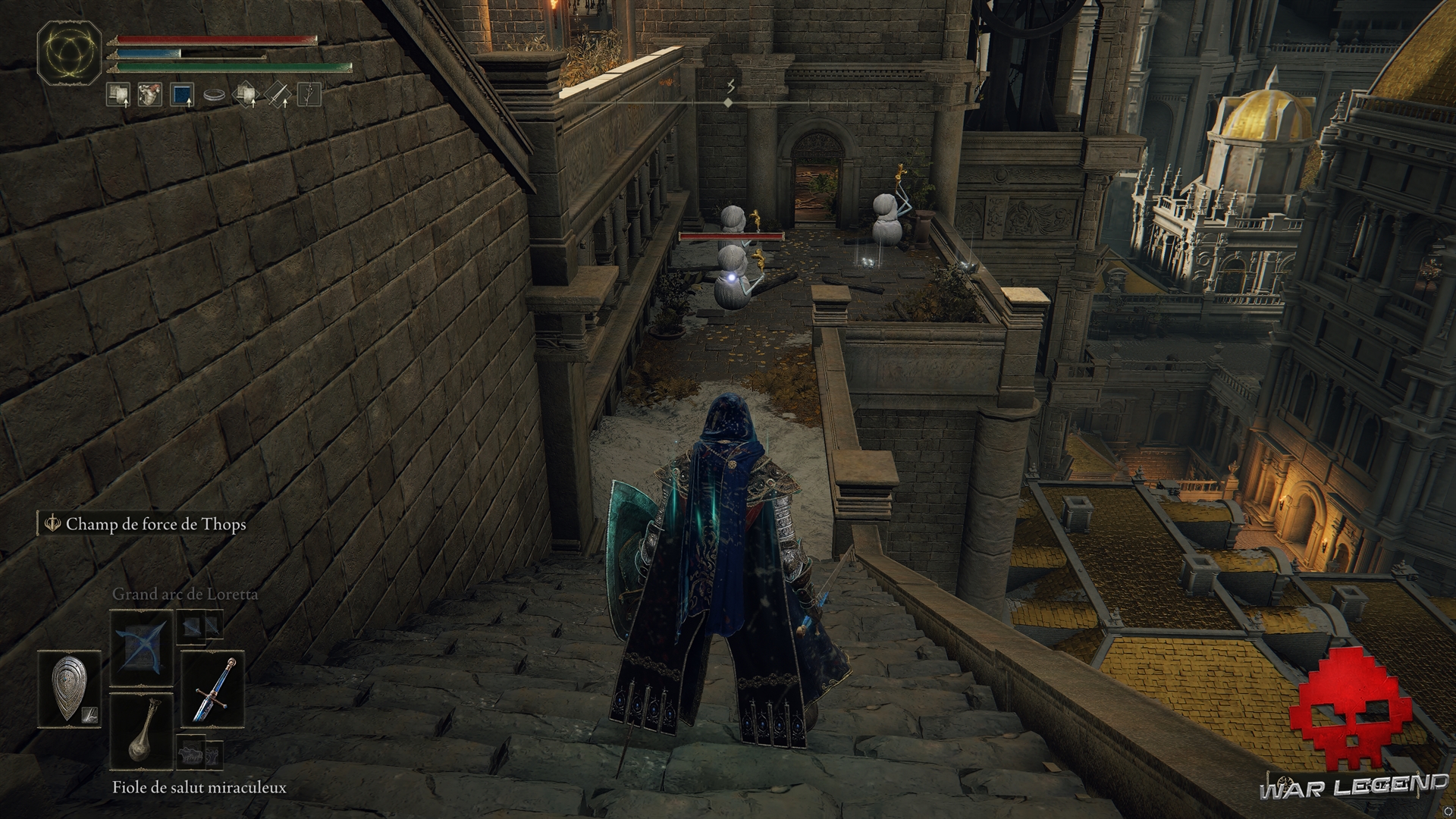 Profitez-en pour repérer les objets de loin et faire le ménage dans la haute-ville. Attention aux gargouilles de pierre qui sont postés sur les toits, et aux chevaliers qui patrouillent autour du bâtiment où se trouve l’ascenseur.