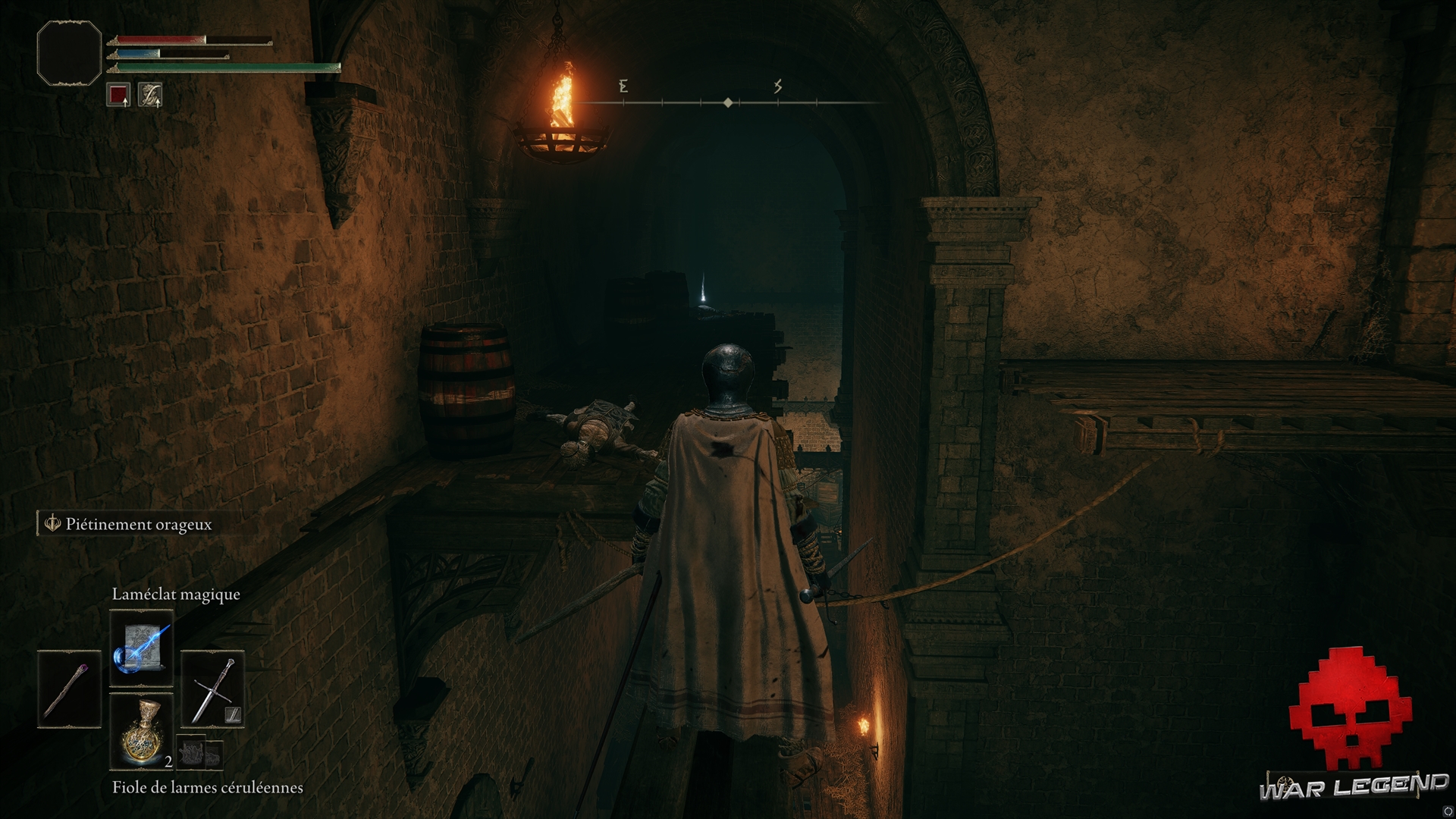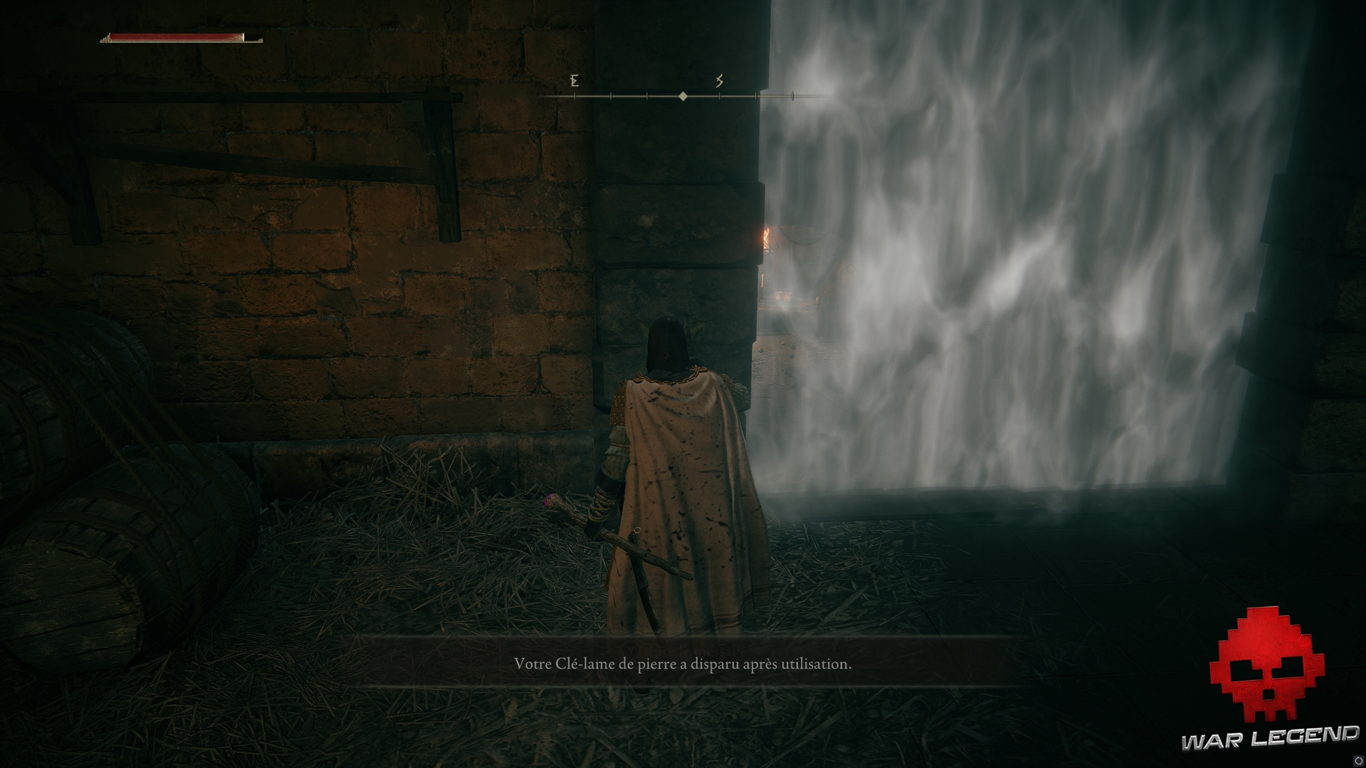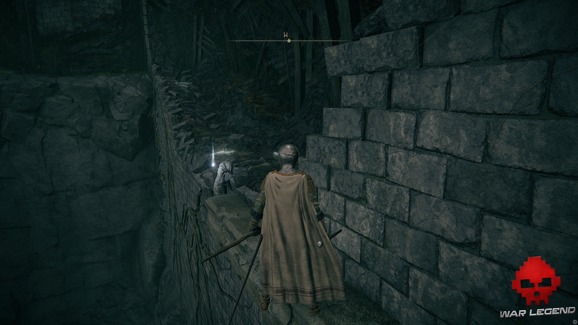 Attention aux gardes armés de grandes haches, surtout que vous n’aurez pas beaucoup de place pour vous battre, mais vous gagnez au change : un Bouclier en bois Aquilin, Miséricorde (une dague) et la Lame d’affûtage en fer qui permet d’étendre les possibilités d’améliorations en appliquant des Cendres de guerre sur vos armes.