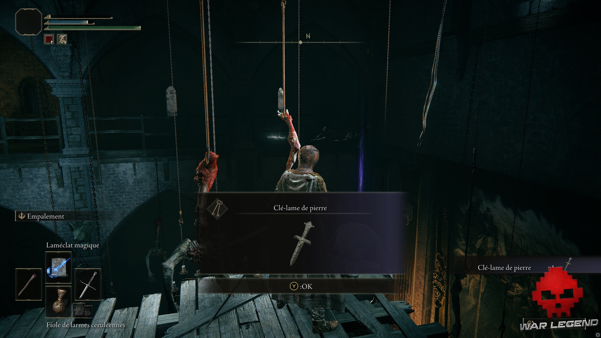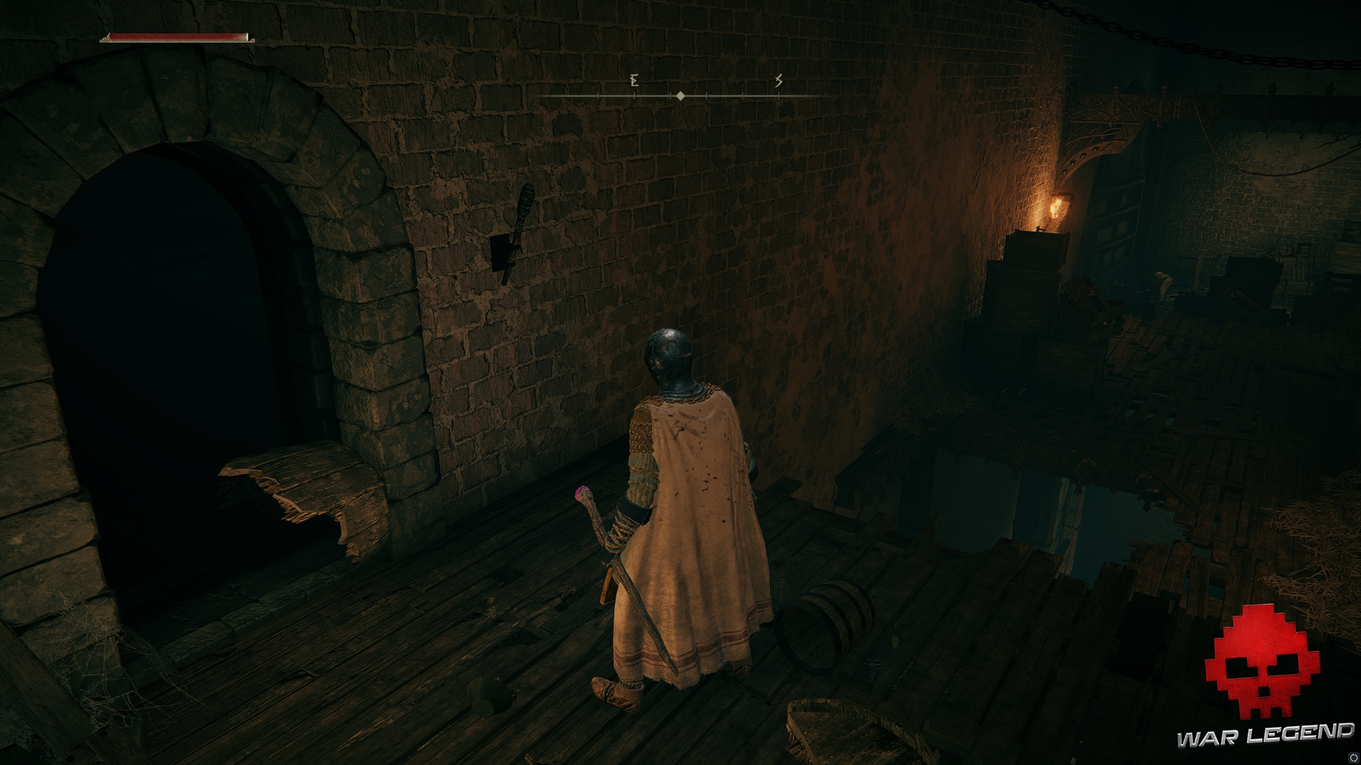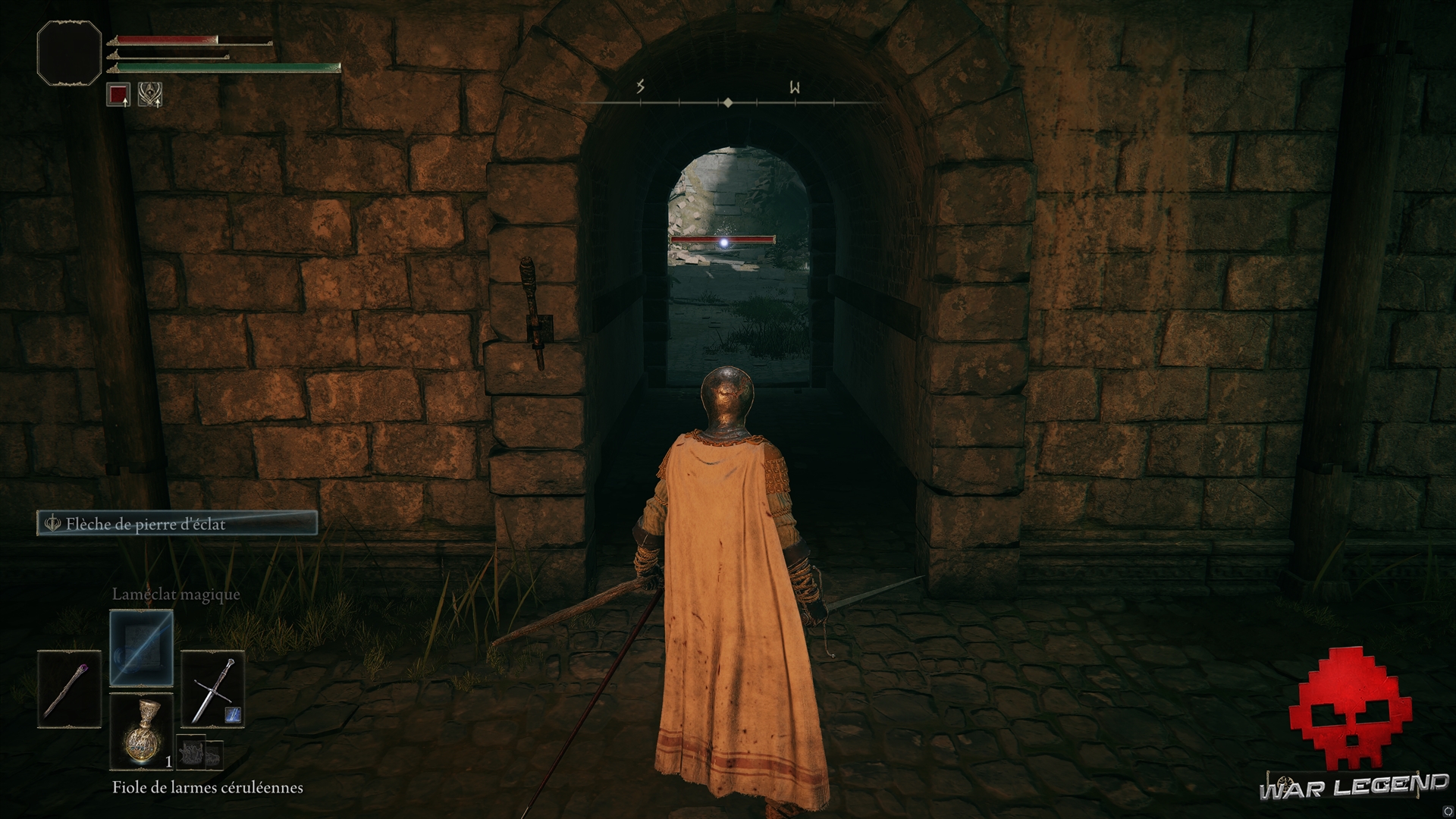 Attention aux gardes armés de grandes haches, surtout que vous n’aurez pas beaucoup de place pour vous battre, mais vous gagnez au change : un Bouclier en bois Aquilin, Miséricorde (une dague) et la Lame d’affûtage en fer qui permet d’étendre les possibilités d’améliorations en appliquant des Cendres de guerre sur vos armes.