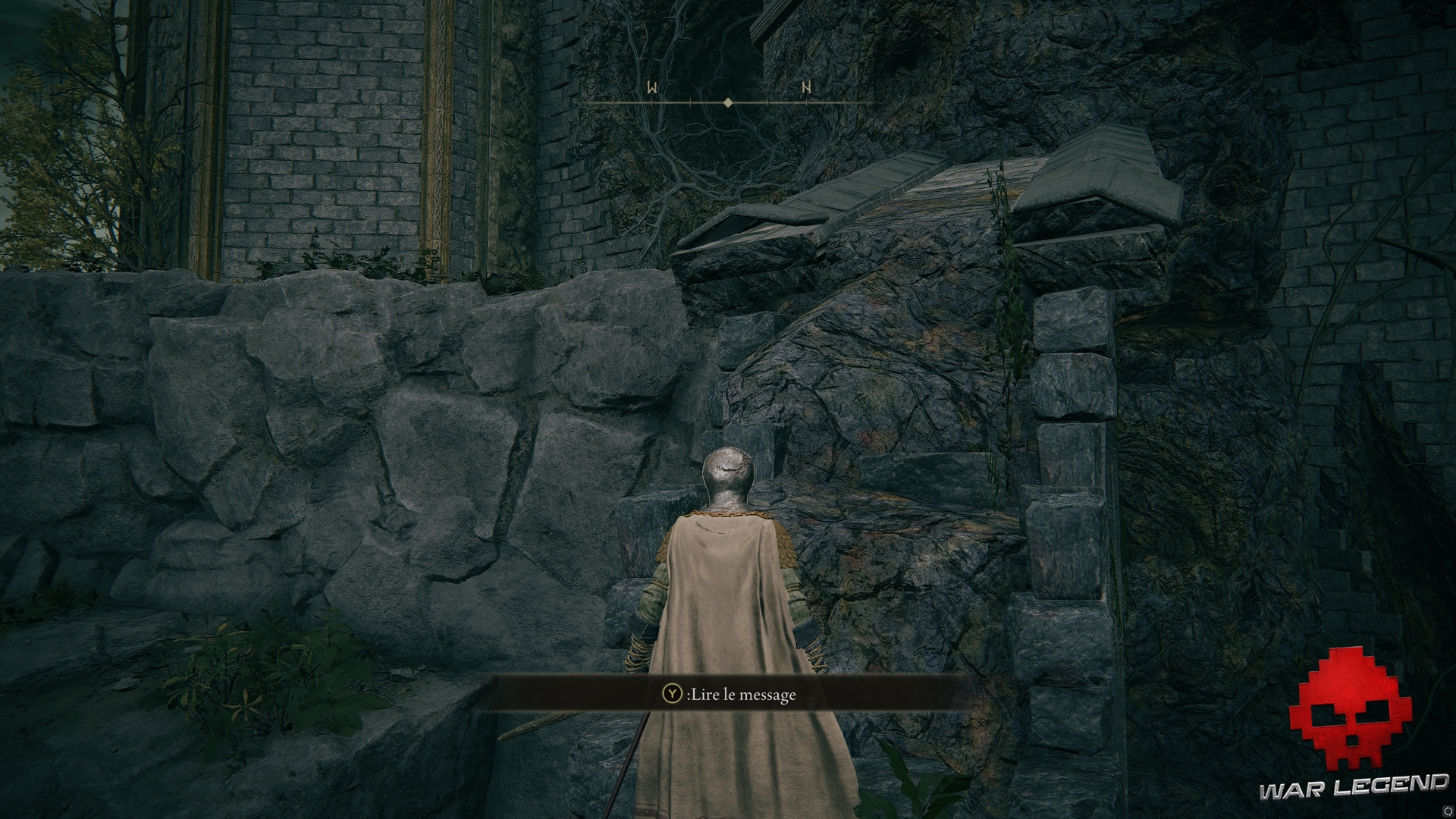 Montez sur le rebord du mur pour atteindre l’autre côté du ravin, tout en récupérant des Fragments de ruine. Montez sur le rempart pour atteindre la Grande pierre d’éclat de forge en hauteur.