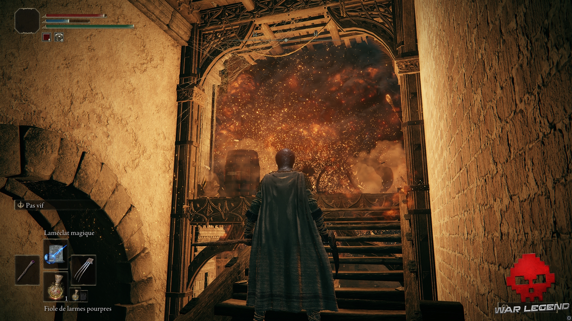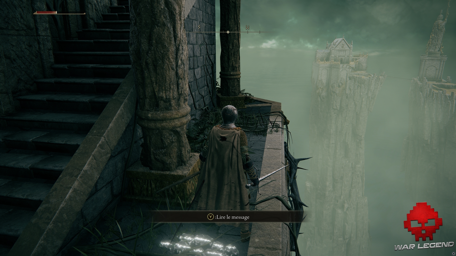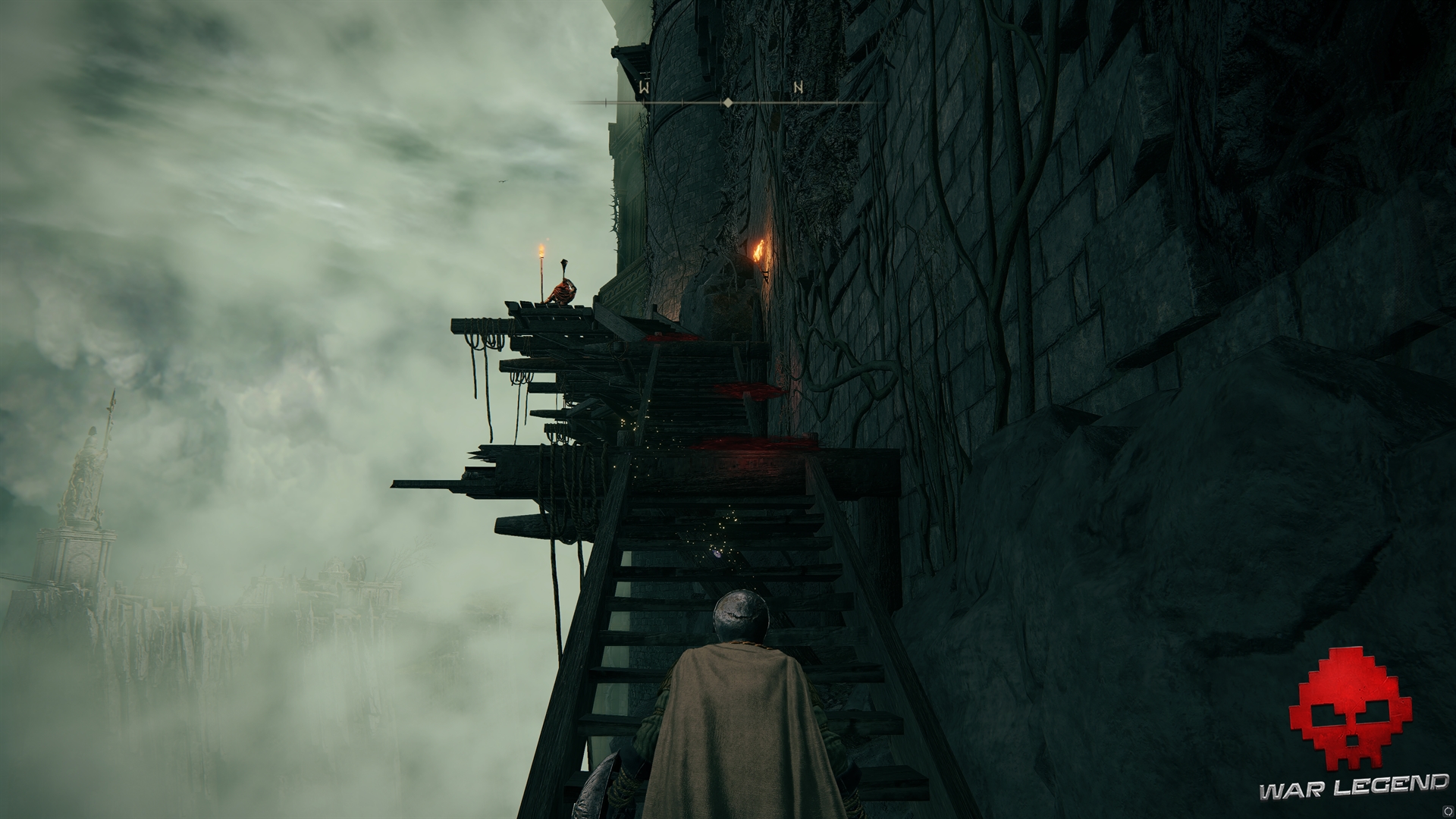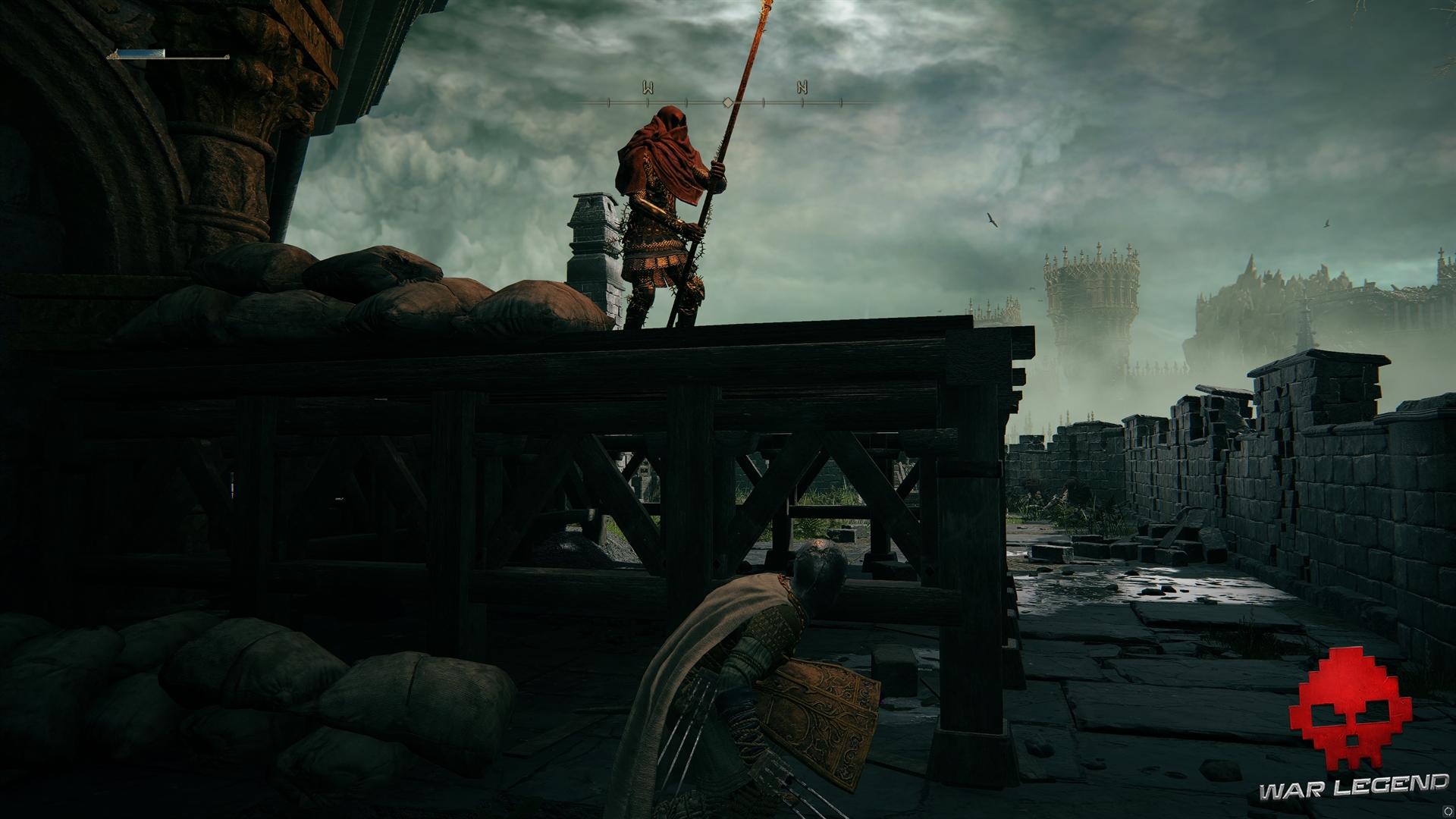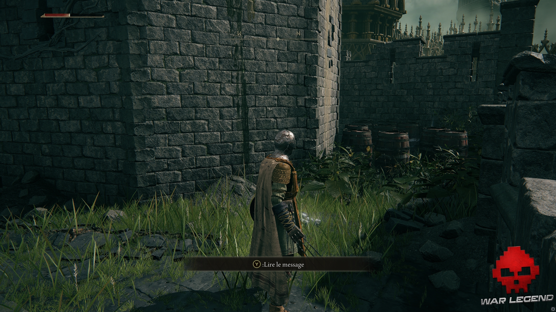 Si vous continuez dans cette direction, vous vous retrouverez sur les remparts qui surplombes la porte principale du château de Voilorage, avec la possibilité d’obtenir un Doigt sanglant suppurant en montant une échelle, mais attention : des chevaliers rôdent.