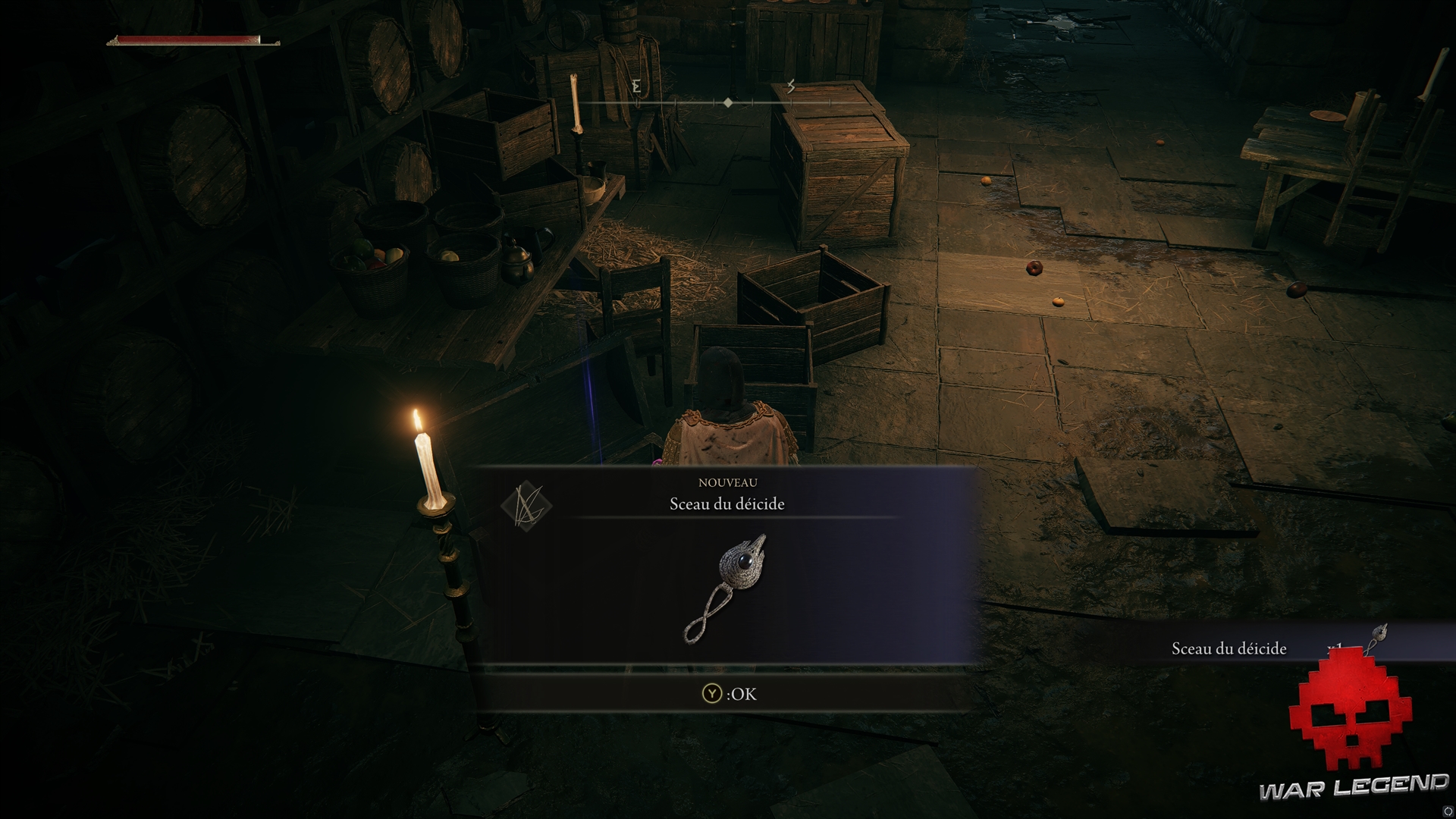 Vous n’en avez pas fini avec cette satanée cour : au sud, à gauche de la porte vers où regardent tous les gardes, vous trouverez un escalier qui descend vers une cave infestée de quelques rats. Vous pouvez utiliser une Clé lame de pierre pour accéder au butin gardé par le mur de brume : le Sceau du déicide et le Bréviaire sanctechair.