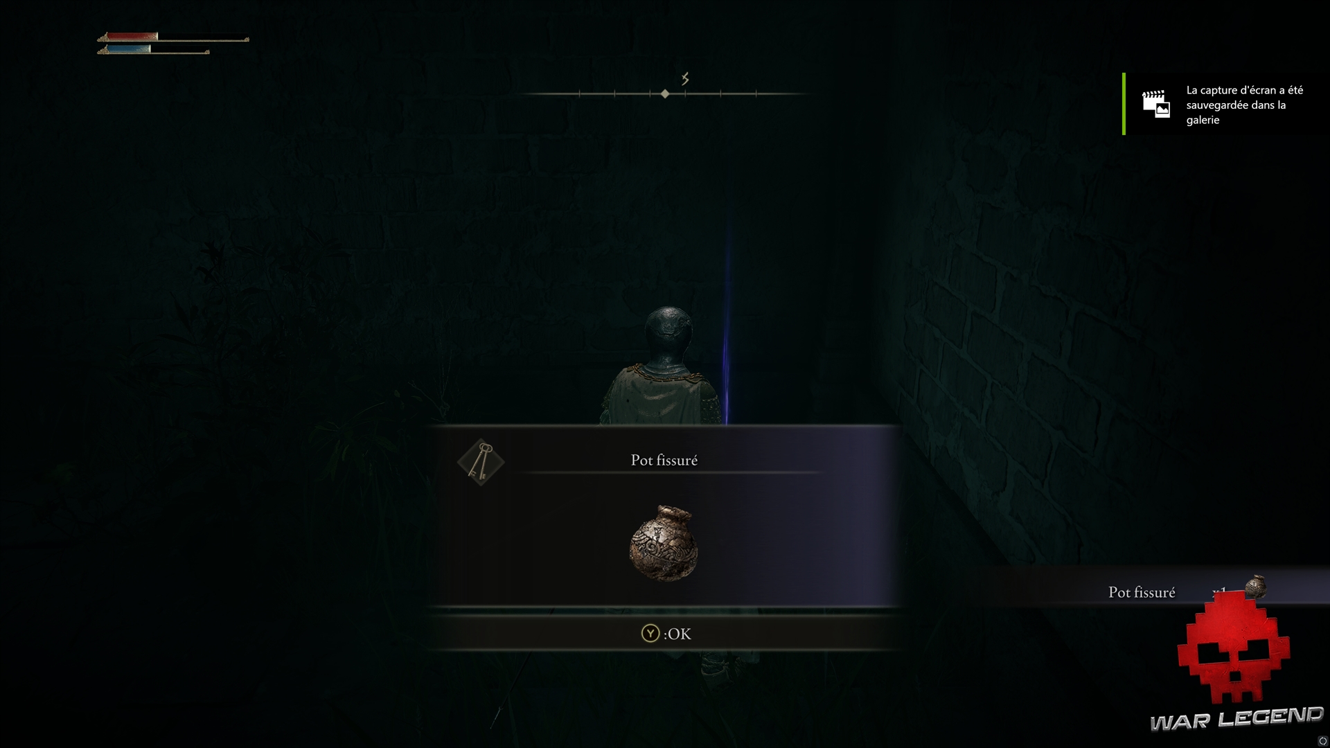 La voie est libre jusqu’au boss, mais n’oubliez pas d’aller activer le site de grâce à droite. N’hésitez pas à continuer de fouiller la zone accédée avec la porte de gauche, afin de tuer un bousier qui transporte des Cendres de guerre (Mande-orage), et récupérer 2 Pots fissurés au fond de la pièce après un combat contre des vivejarres (et leur grand frère).