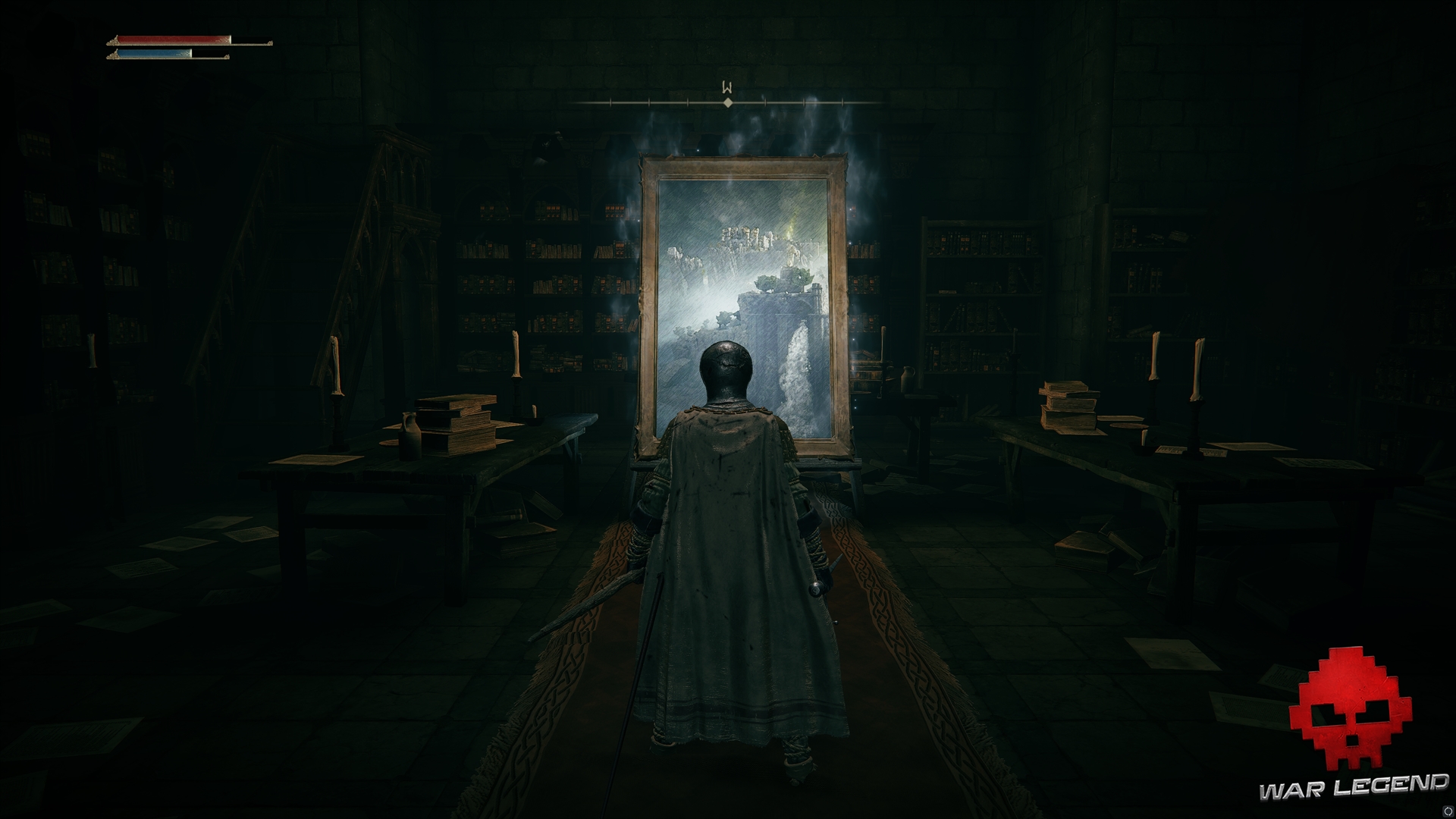Depuis le site et en revenant vers la cour, vous pourrez serrer à droite pour accéder à une pièce sous la chapelle où se trouve Rogier le Sorcier. Vous tomberez sur un bien étrange tableau : examinez-le pour obtenir une prophétie.