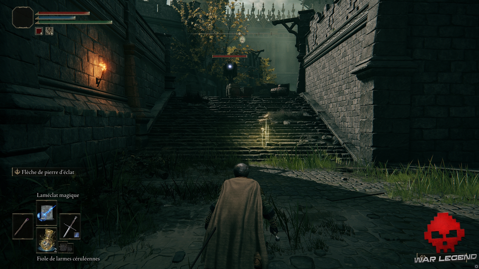 Une fois reposé au site de grâce, prenez garde aux escaliers devant vous et préférez les monter en mode discrétion : un garde patrouille en haut et appellera des renforts s’il vous voit. Vous ne voulez pas de bagarre généralisée dans des escaliers qui donne directement dans du vide, surtout que la sentinelle essaiera de vous pousser.