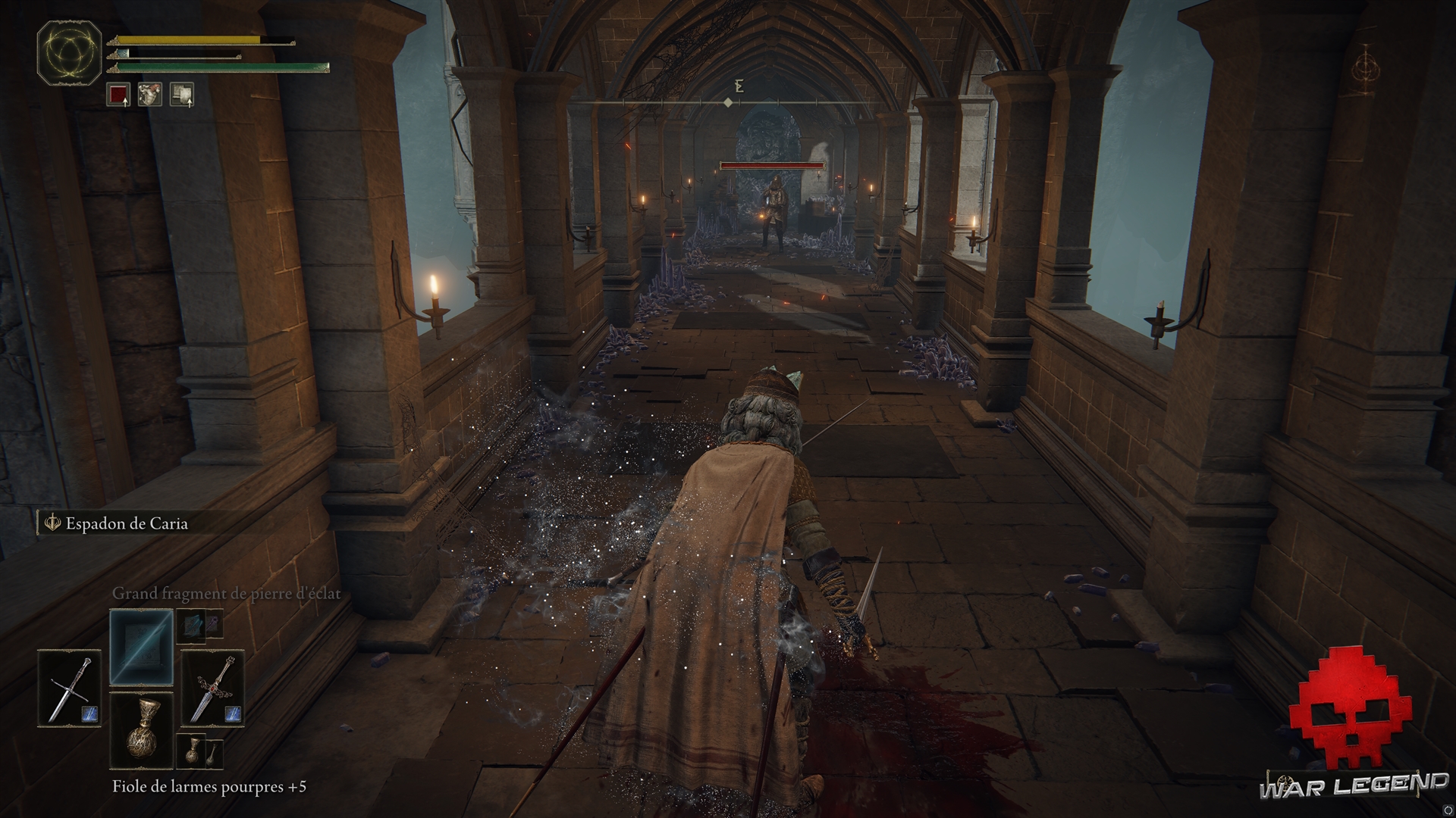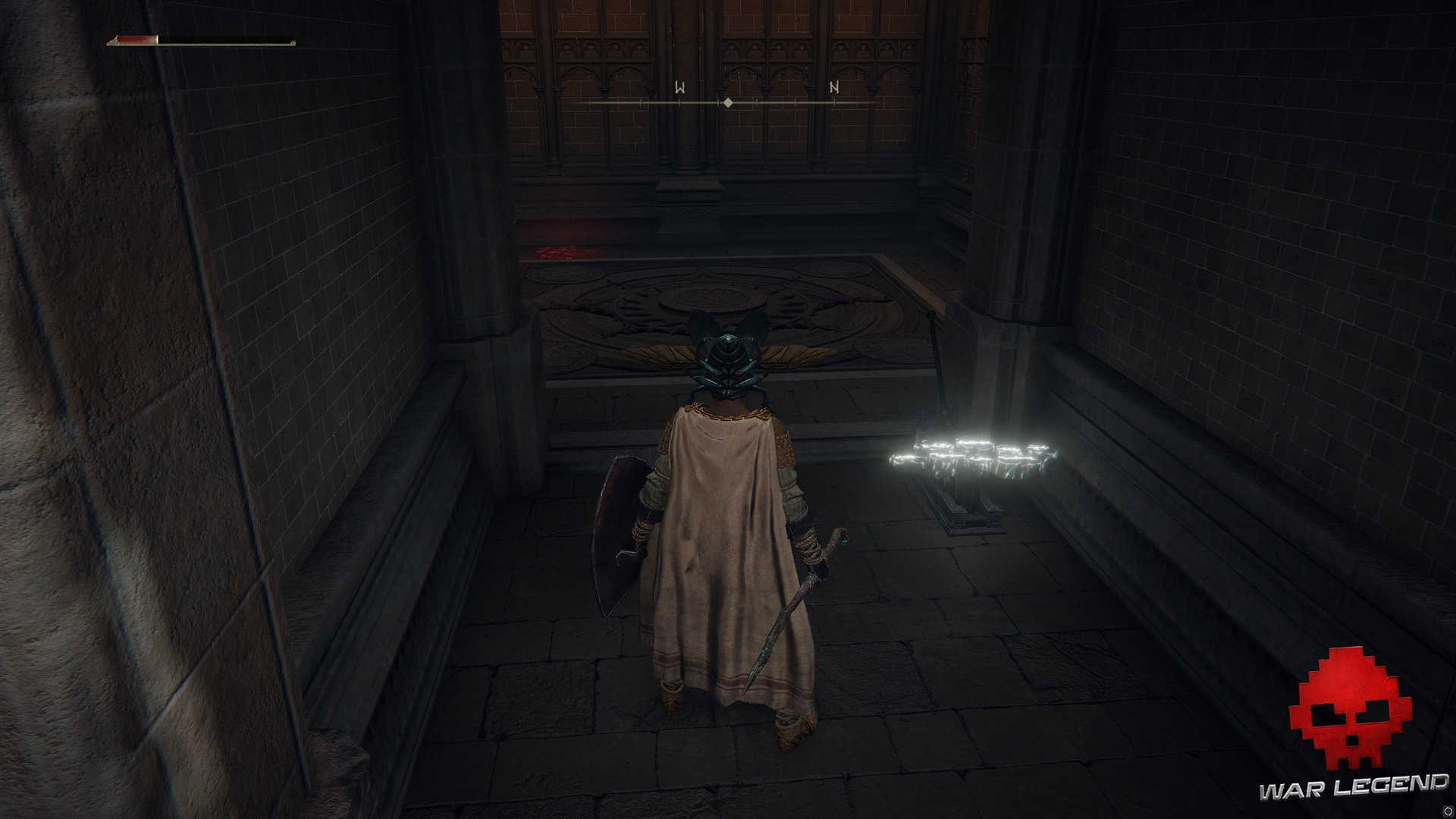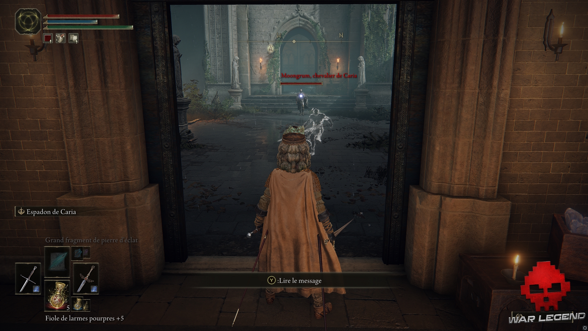 Une fois en sécurité, un puissant PNJ, Moongrum, chevalier de Caria, vous attend dans l’atrium un peu plus loin, tandis que le téléporteur à droite vous transportera à l’Église des vœux, ailleurs dans Liurnia.