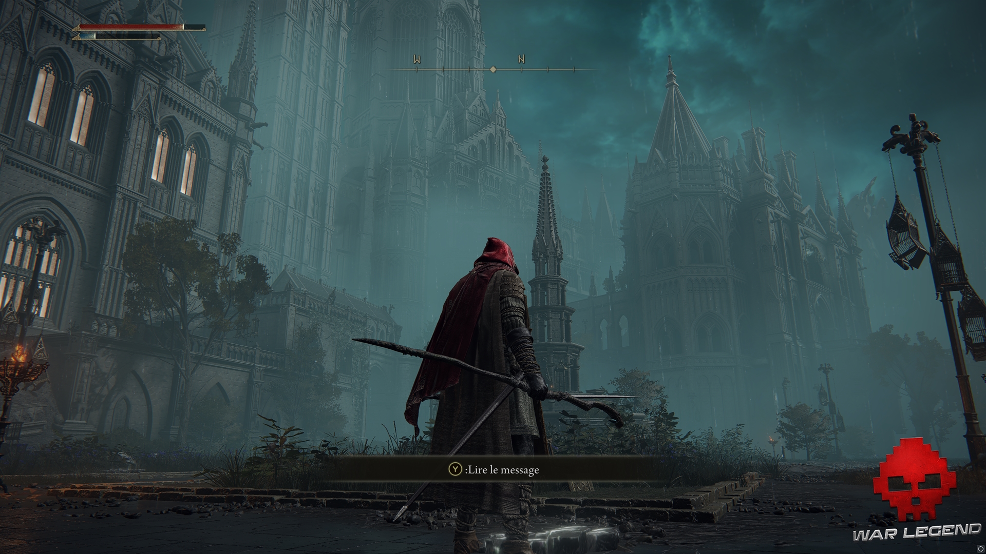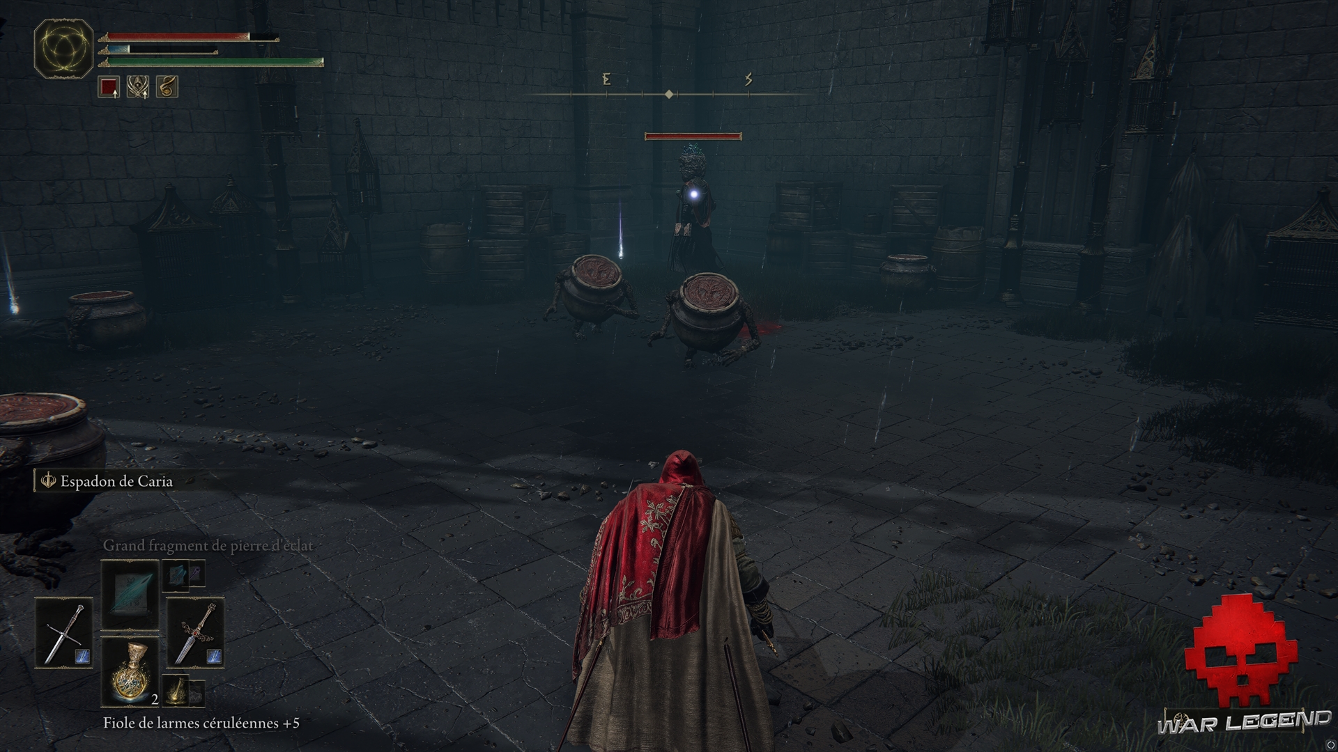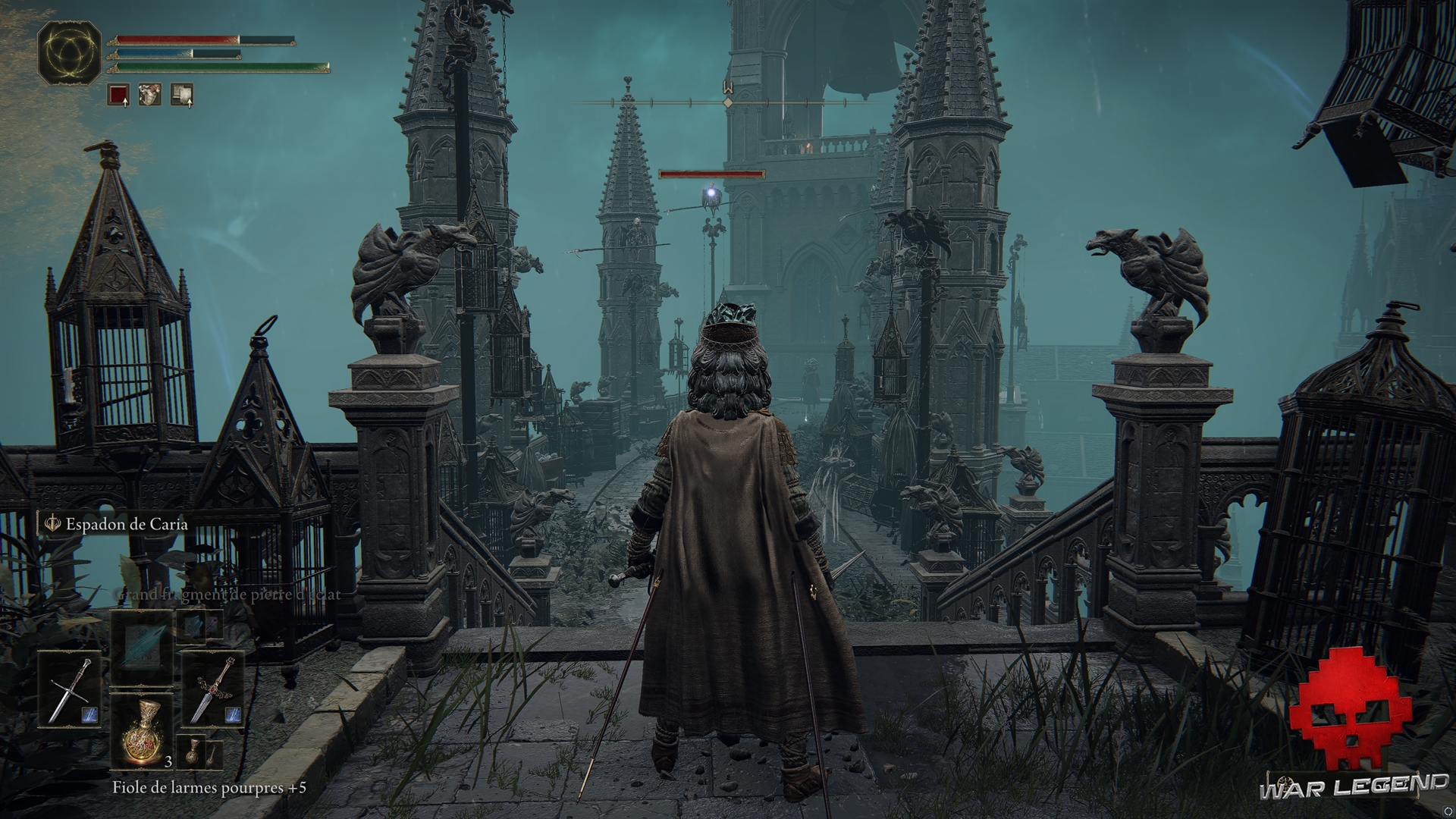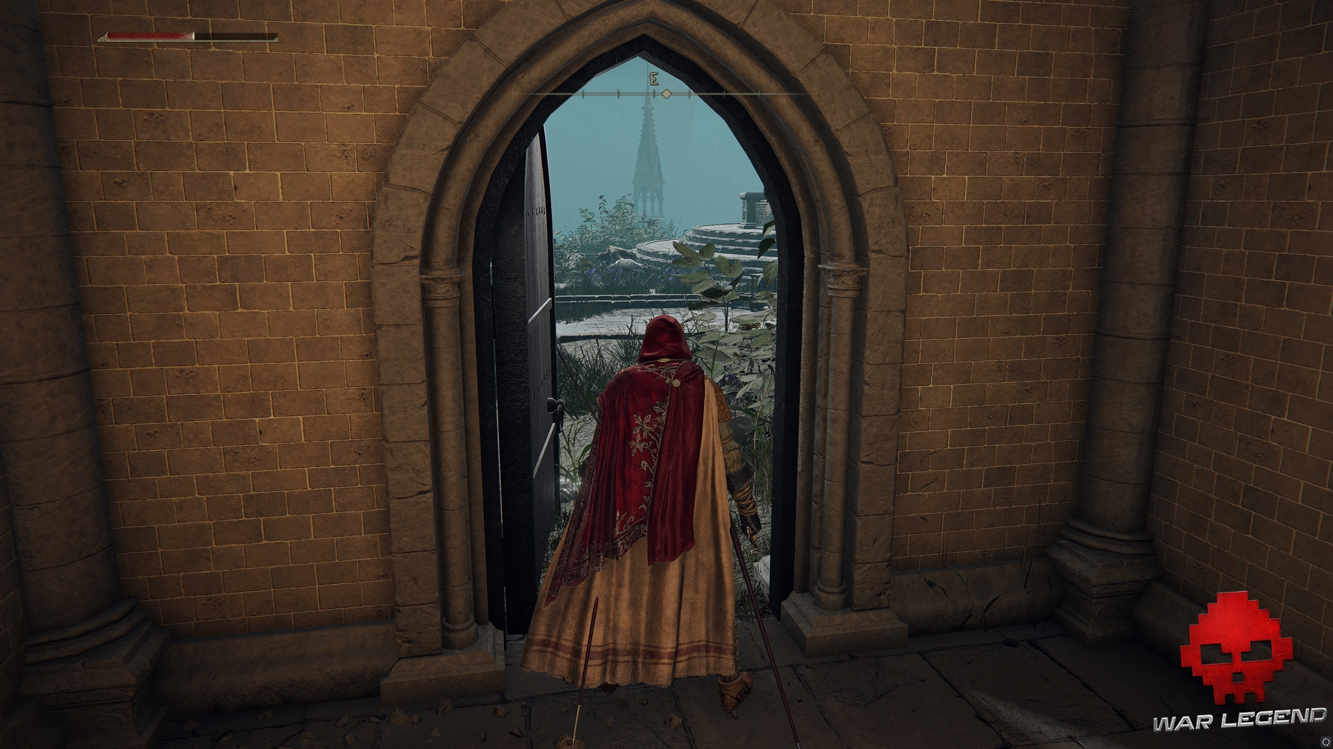 Une fois en sécurité, un puissant PNJ, Moongrum, chevalier de Caria, vous attend dans l’atrium un peu plus loin, tandis que le téléporteur à droite vous transportera à l’Église des vœux, ailleurs dans Liurnia.