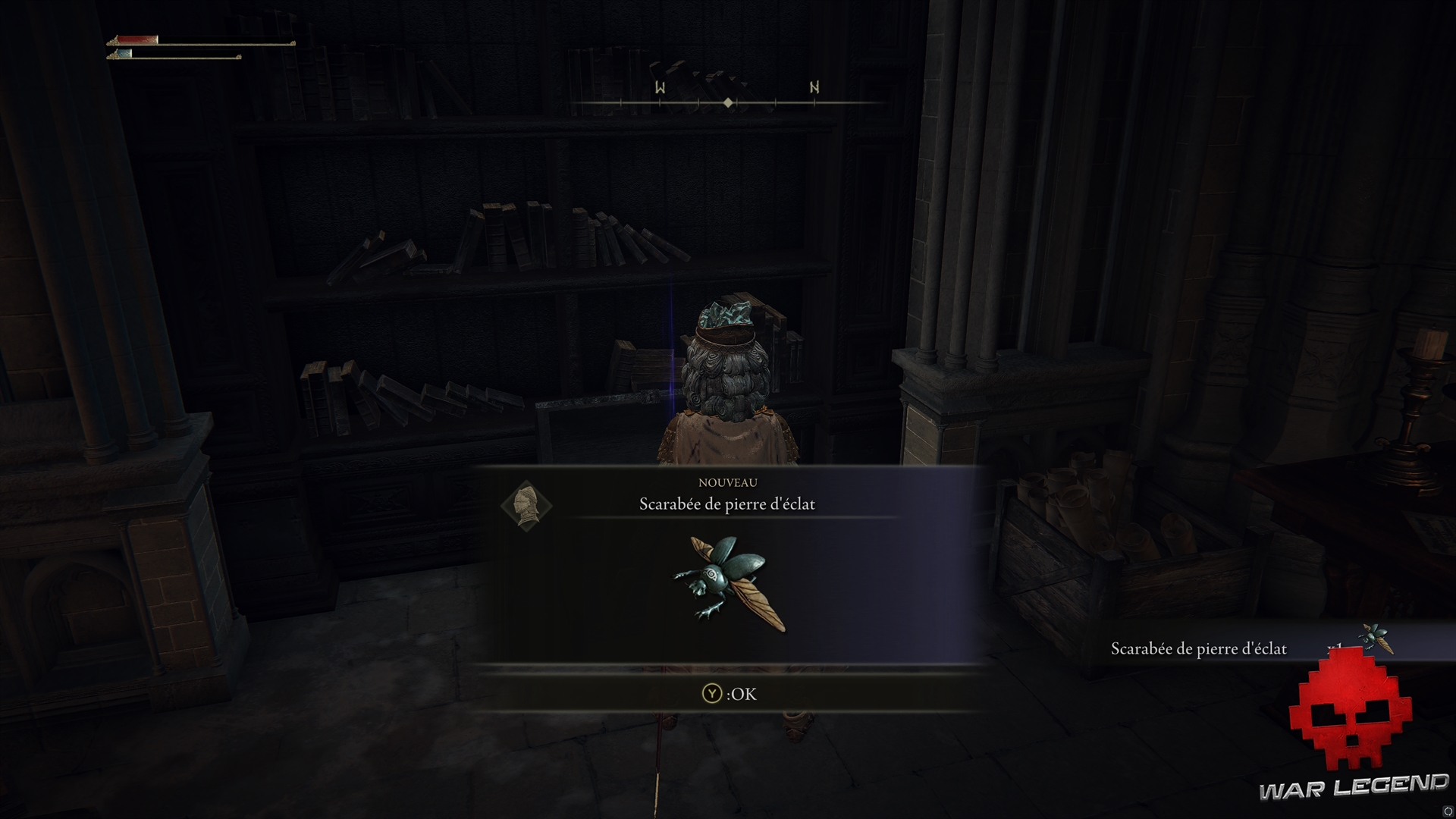 En haut de l’échelle qui se présente à vous, préparez-vous à affronter un mage et une grosse « tête de citrouille ». Récupérez une Pierre de sanctuaire et accédez à un toit pour récupérer le Scarabée de pierre d’éclat, ainsi que des Runes.