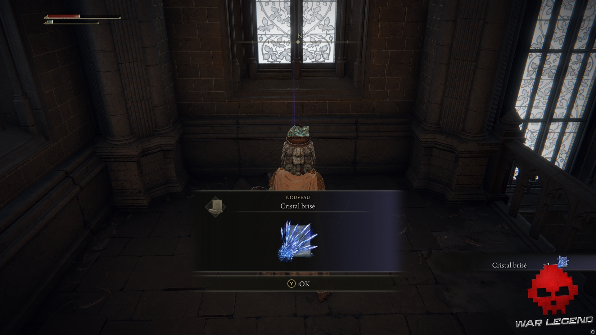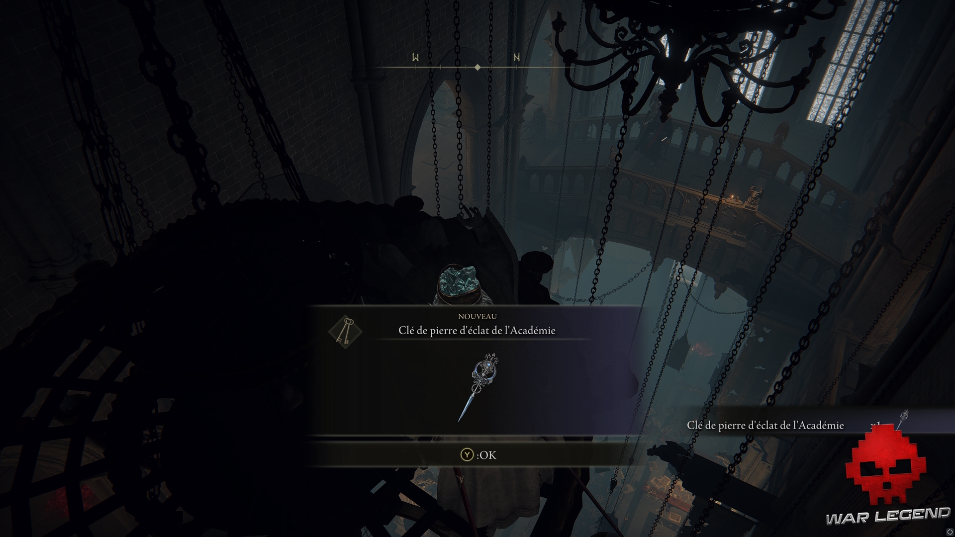 À présent, vous pouvez passer à travers une des fenêtres et marcher sur la charpente. Sautez sur un des chandeliers pour récupérer une autre Clé de pierre d’éclat de l’Académie.