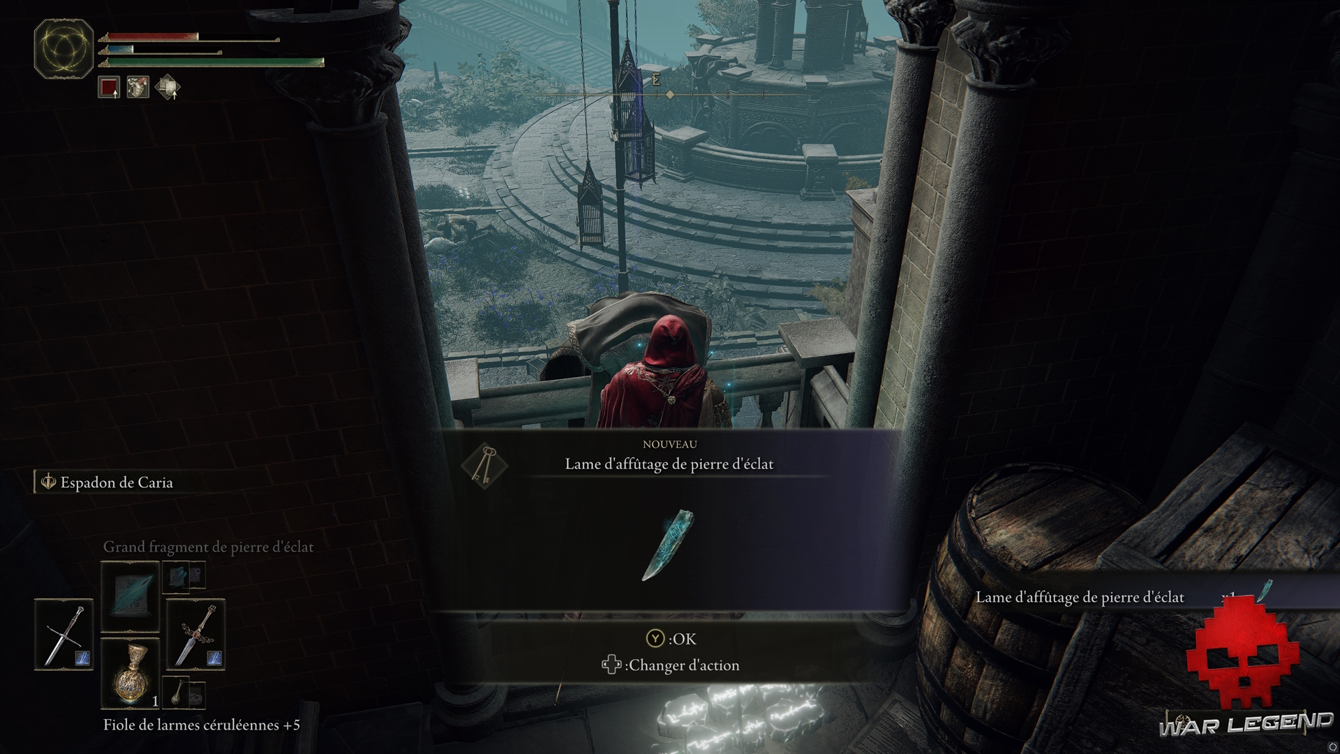 Récupérez la Lame d’affûtage de pierre d’éclat dans la petite bâtisse, puis montez sur le toit pour retomber sur les escaliers juste en dessus.