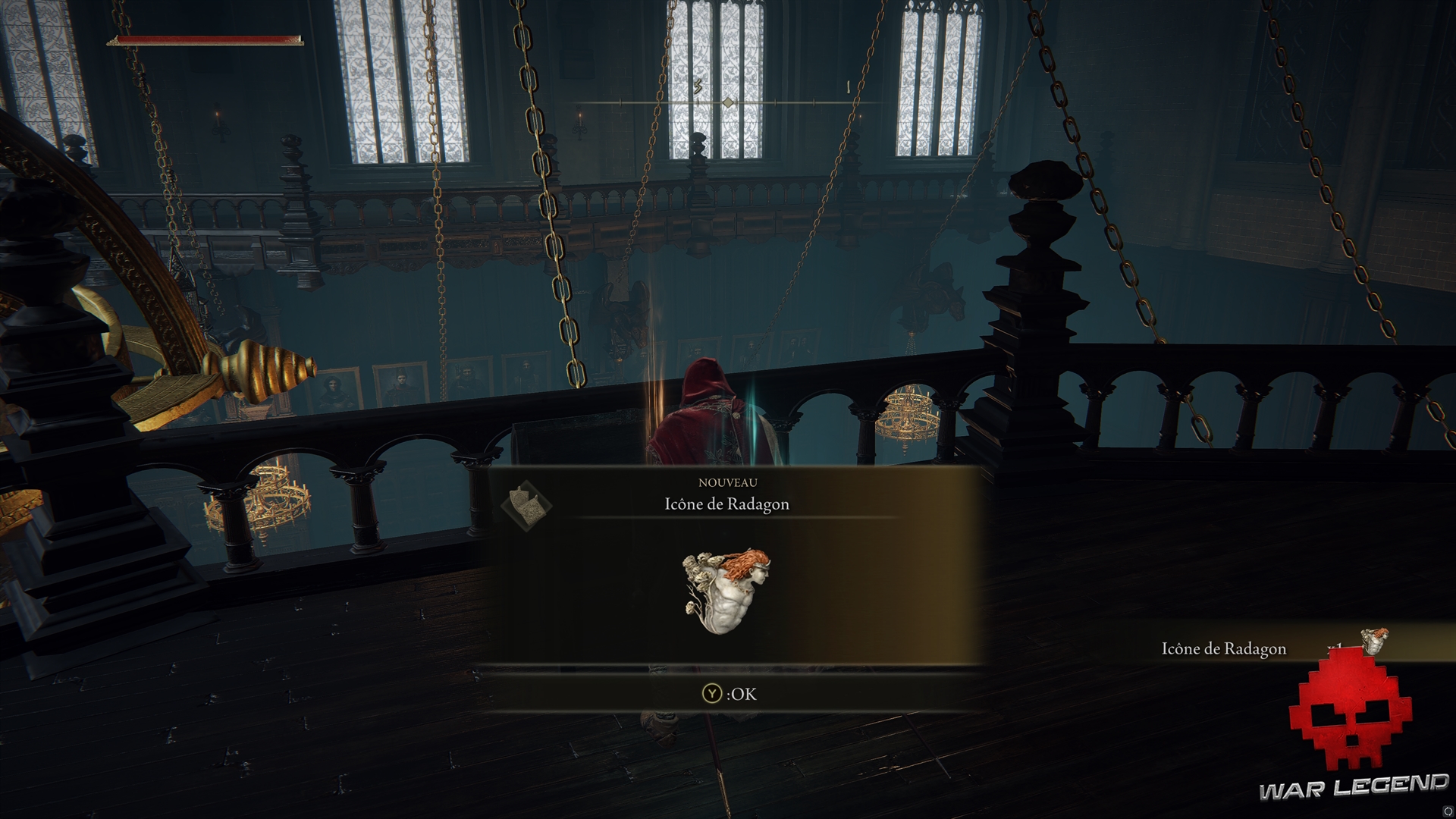 Vous voilà à l’étage de la salle de débat, avec un coffre contenant l’Icône de Radagon qui vous attend. Vous pourrez aussi ramasser 5 Bourgeons cristallins.