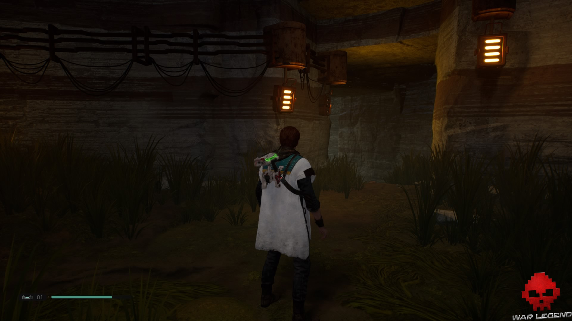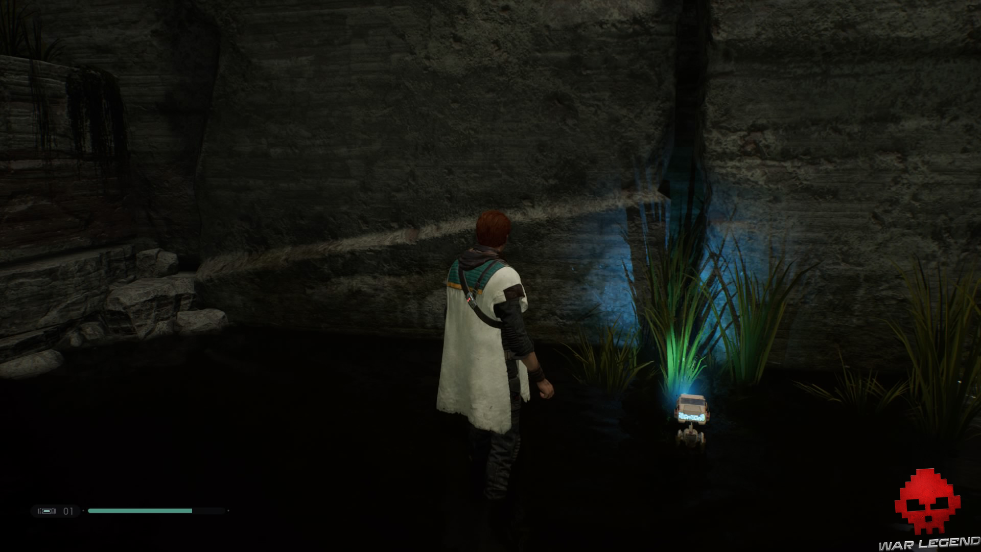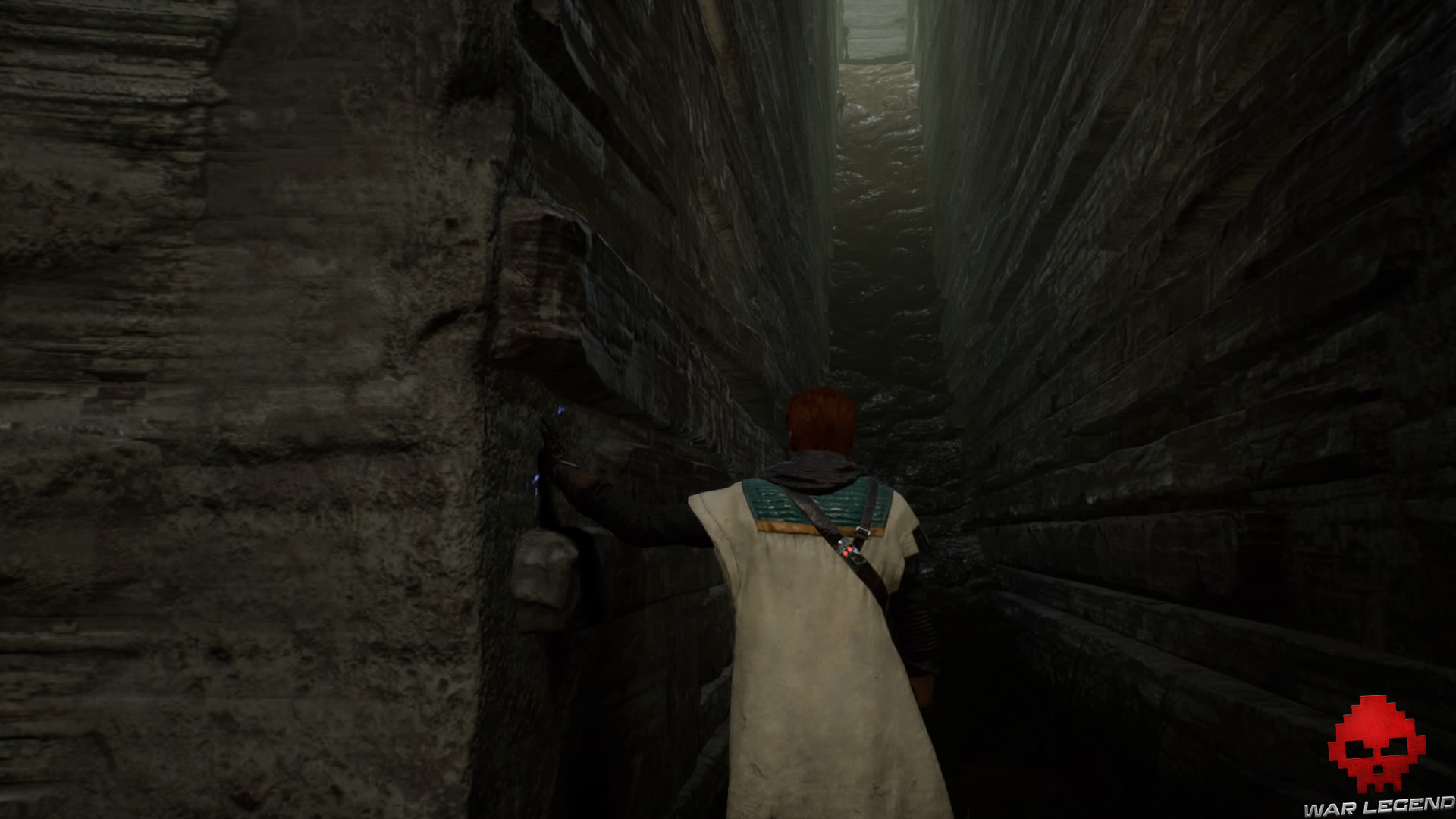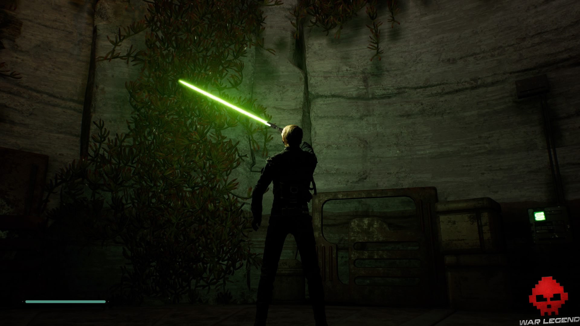 Allumez votre sabre pour vous éclairer dans la pénombre, puis grimpez sur le mur à l’aide du lierre.