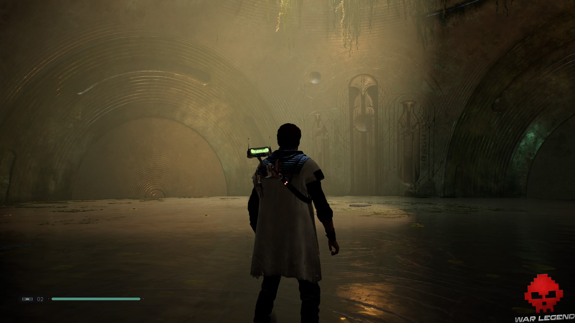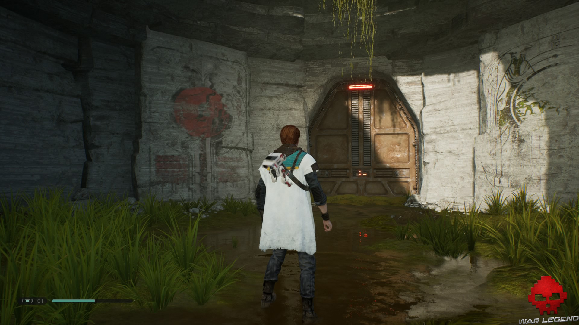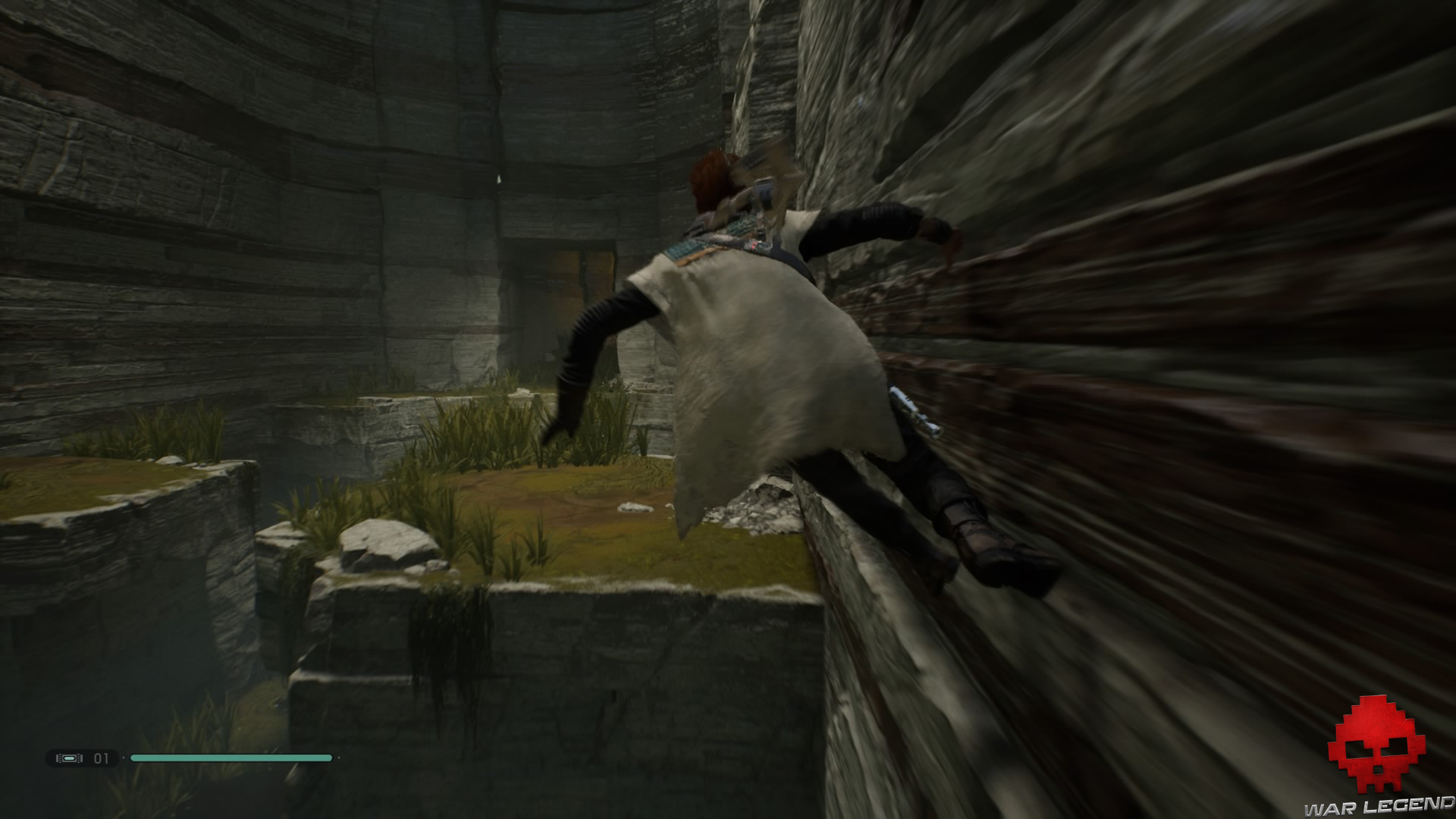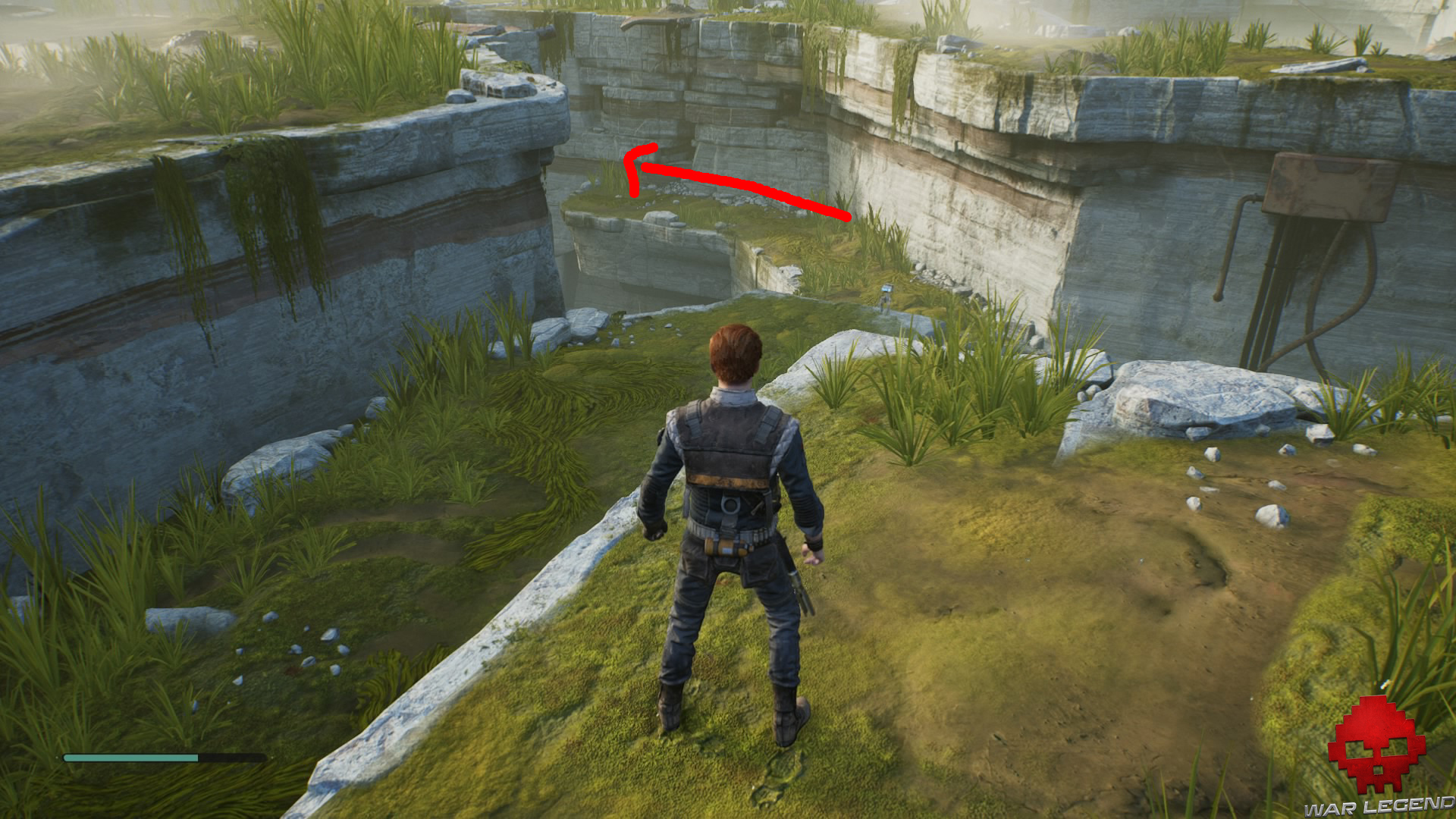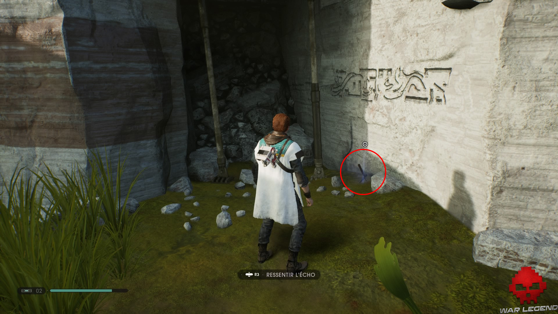 Allumez votre sabre pour vous éclairer dans la pénombre, puis grimpez sur le mur à l’aide du lierre.