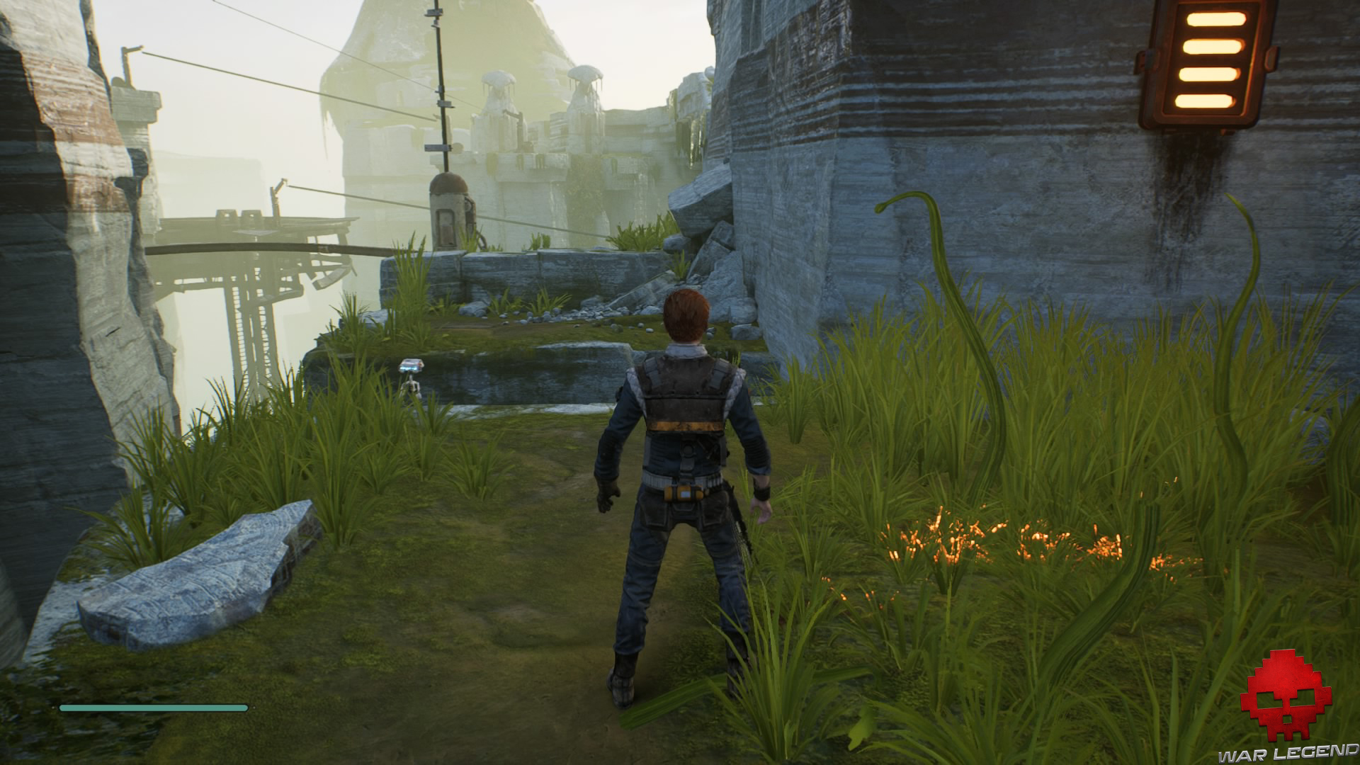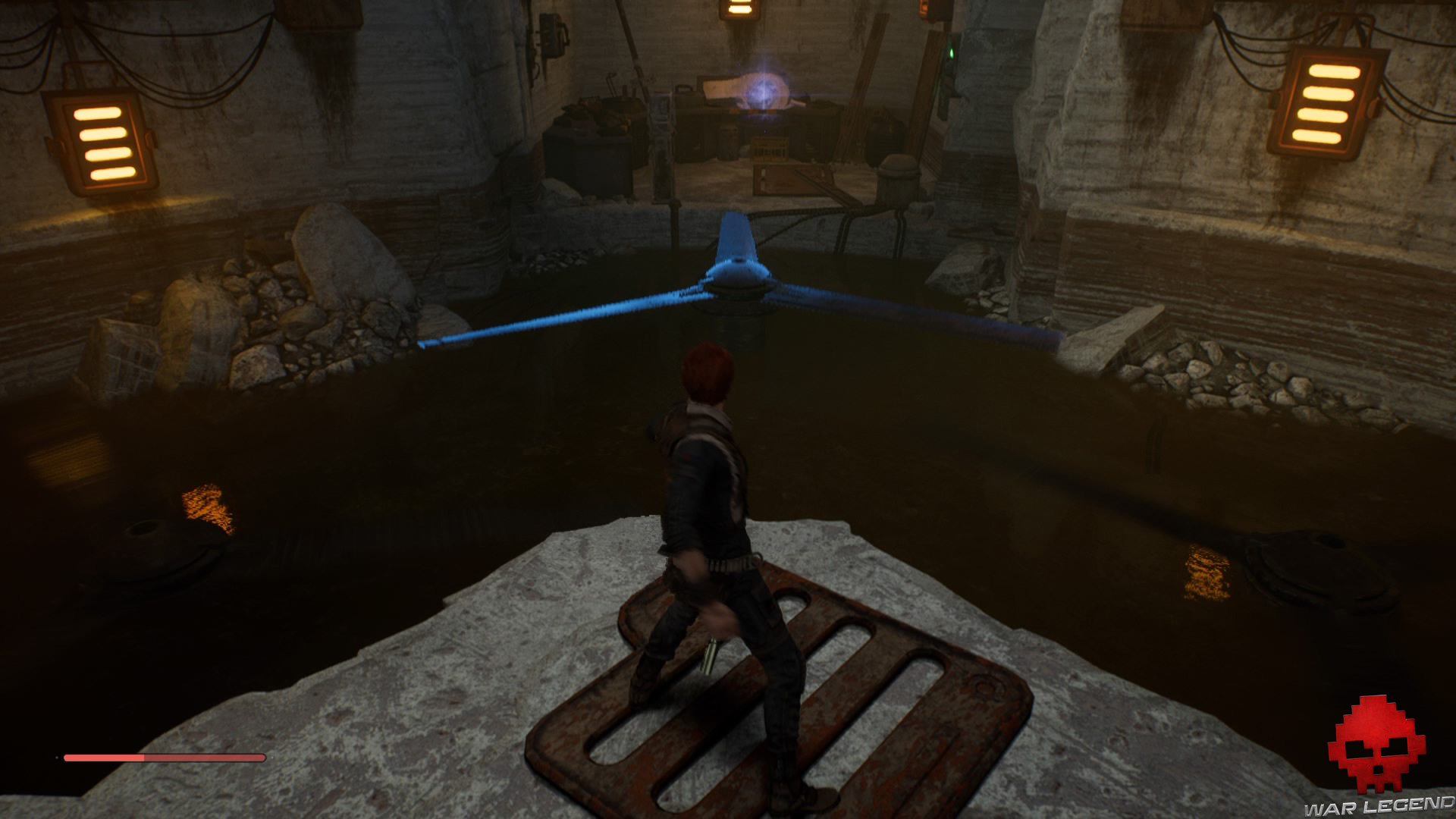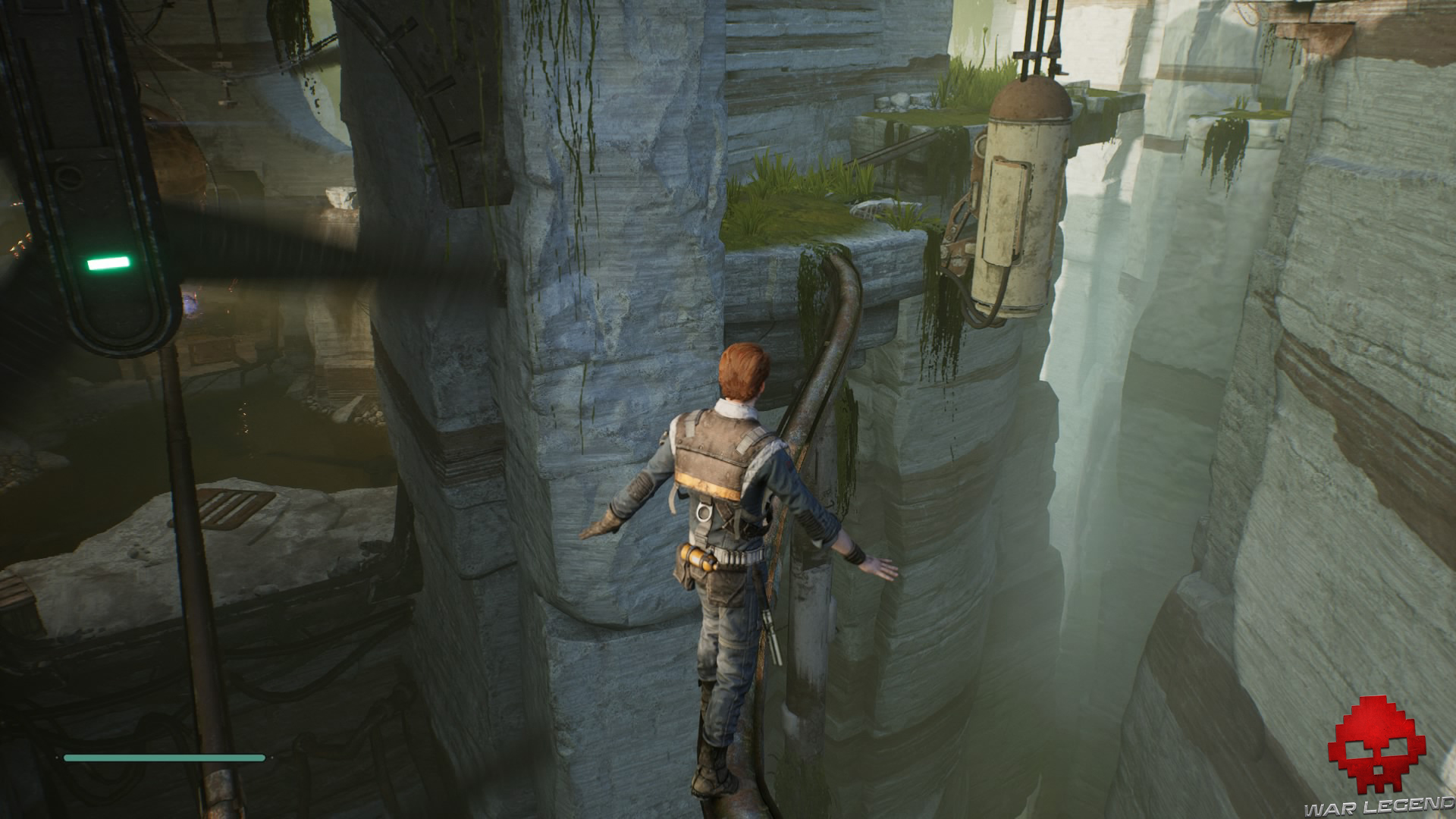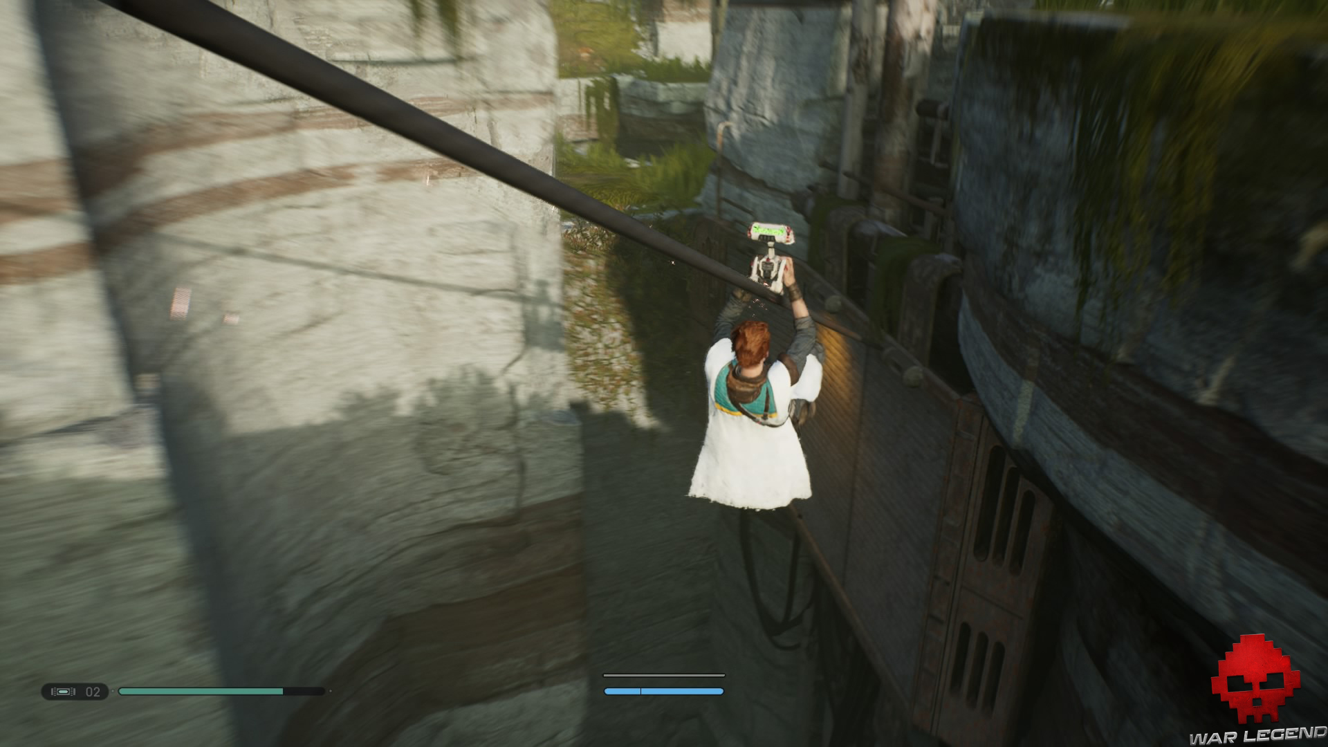 Une fois en haut, donnez un coup de sabre laser sur les tuyaux électrifiés devant vous pour déclencher une cinématique dans laquelle BD-1 vous apprend à vous soigner.
