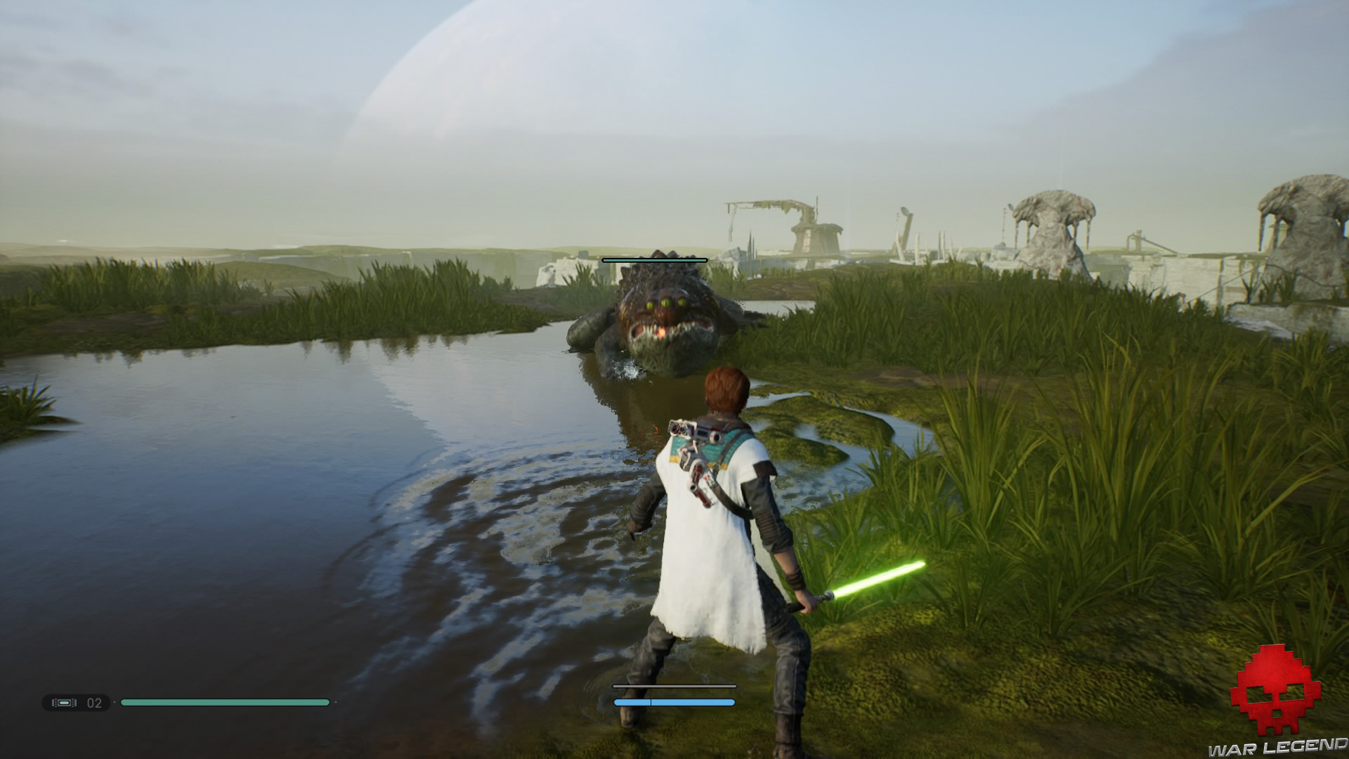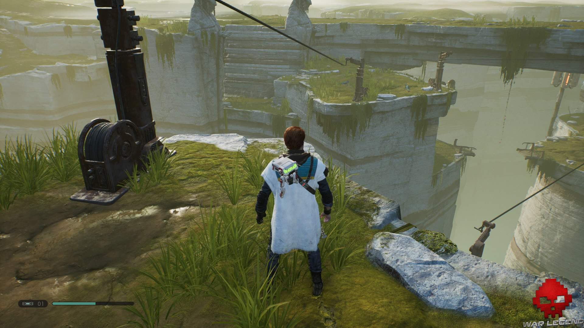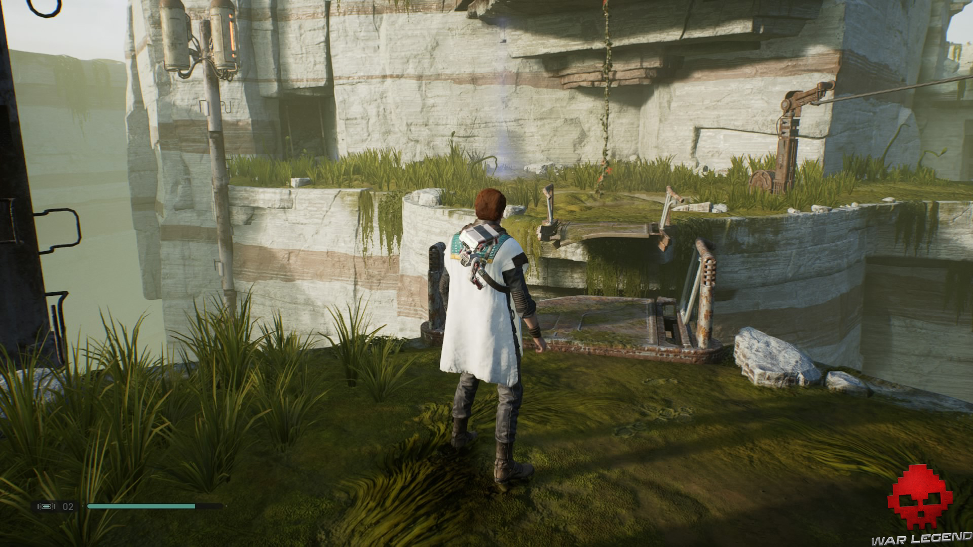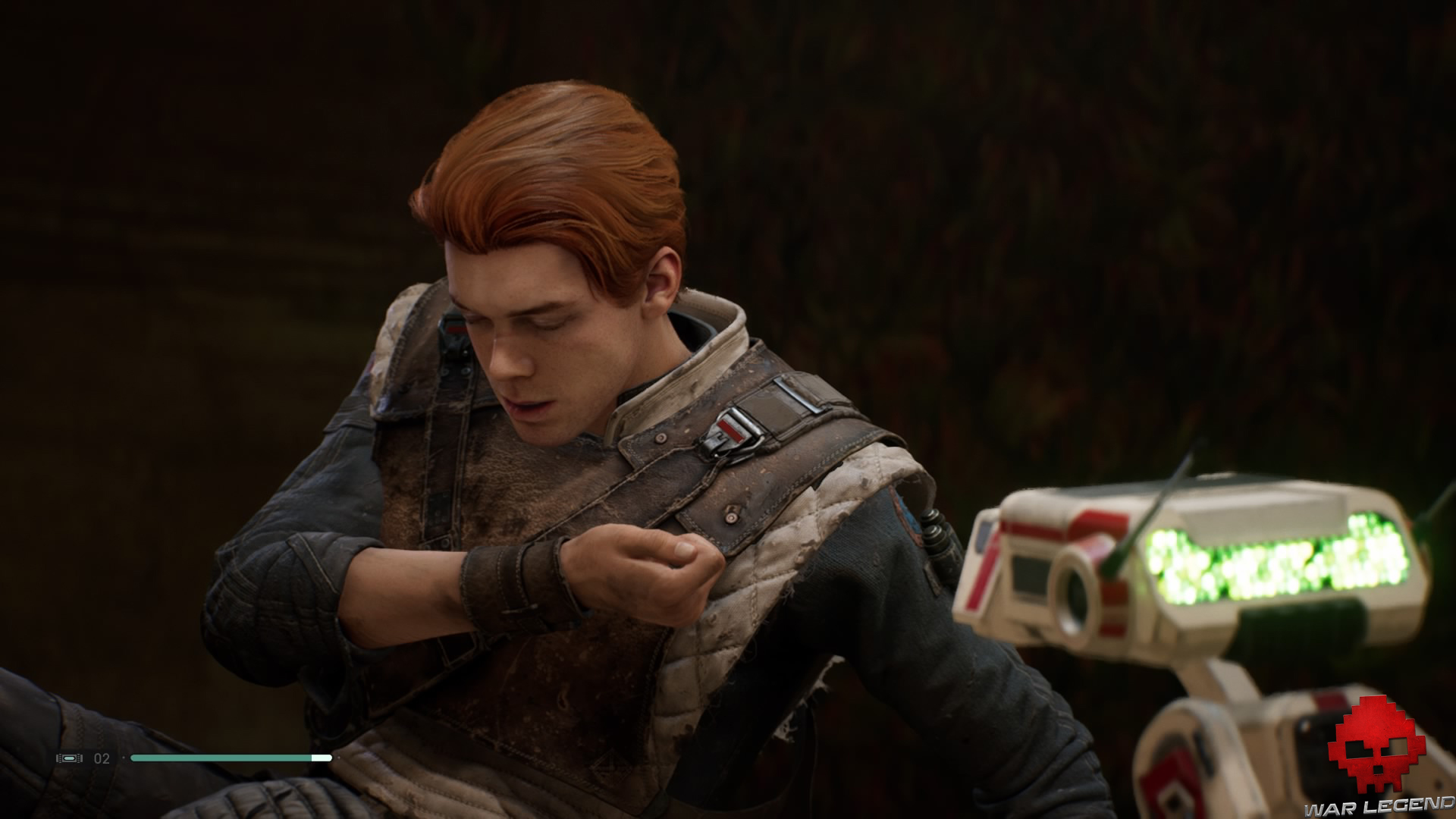 Une fois en haut, donnez un coup de sabre laser sur les tuyaux électrifiés devant vous pour déclencher une cinématique dans laquelle BD-1 vous apprend à vous soigner.