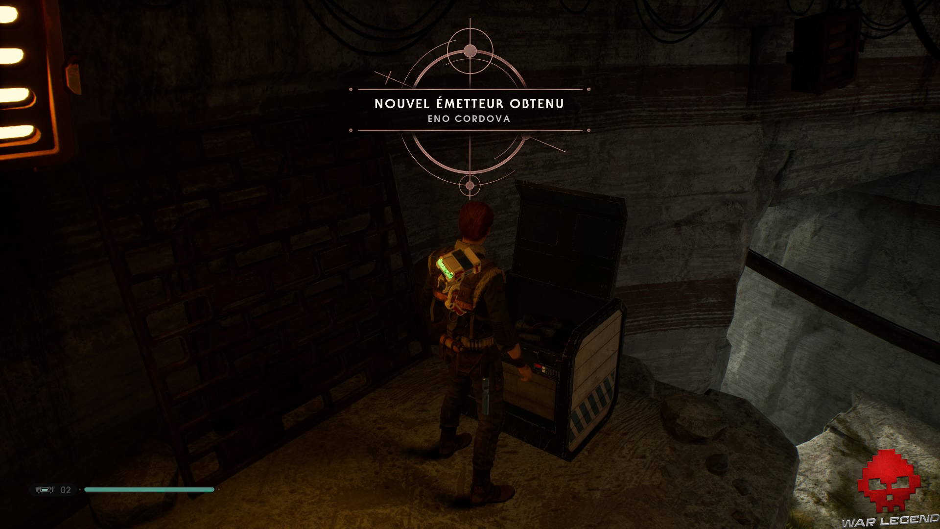 Ensuite, prenez à gauche pour ouvrir le coffre et débloquez un nouvel émetteur (objet cosmétique) pour votre sabre laser.