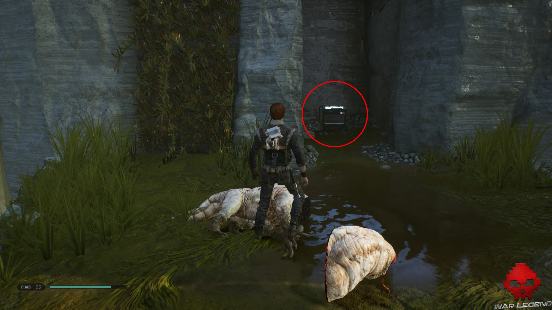 Sautez en bas à droite et tuez la créature. Retournez-vous et ouvrez le coffre caché dans le renfoncement.