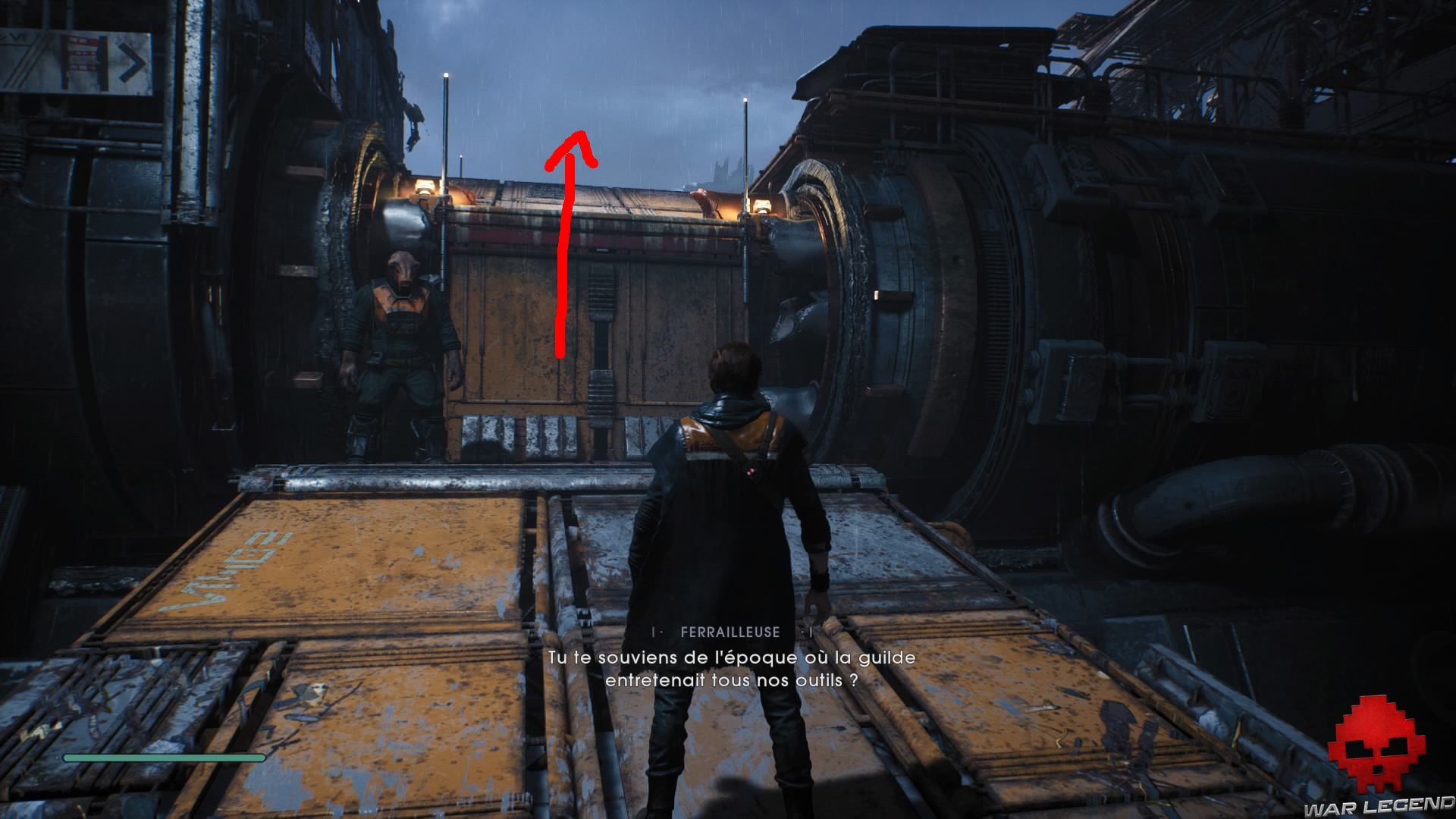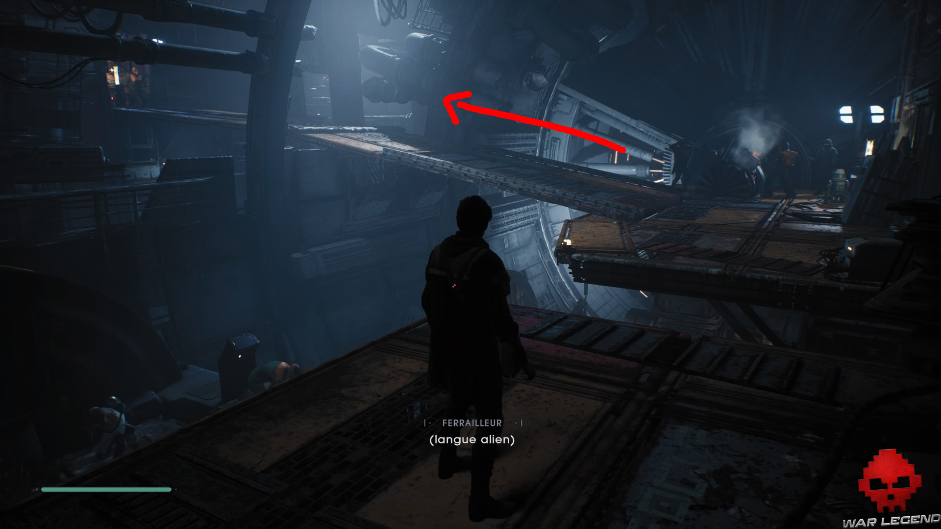 Passé la cinématique d’introduction, suivez Fraul en grimpant sur la droite. Sautez par dessus le trou et suivez la passerelle sur la gauche.