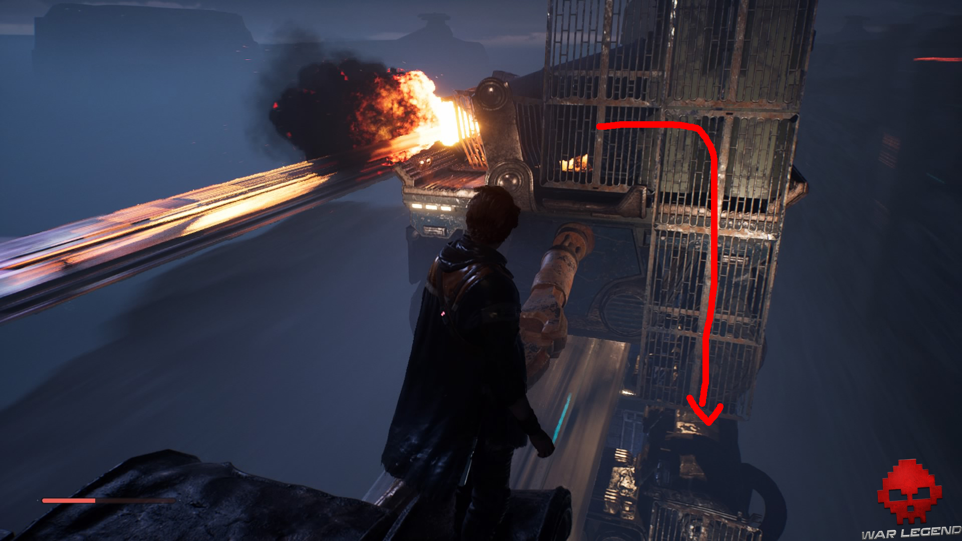 Après la courte cinématique, faufilez-vous par l’interstice sur votre gauche, après quoi, vous serez séparé de Fraul. Sautez ensuite sur votre droite pour glisser jusqu’en bas.