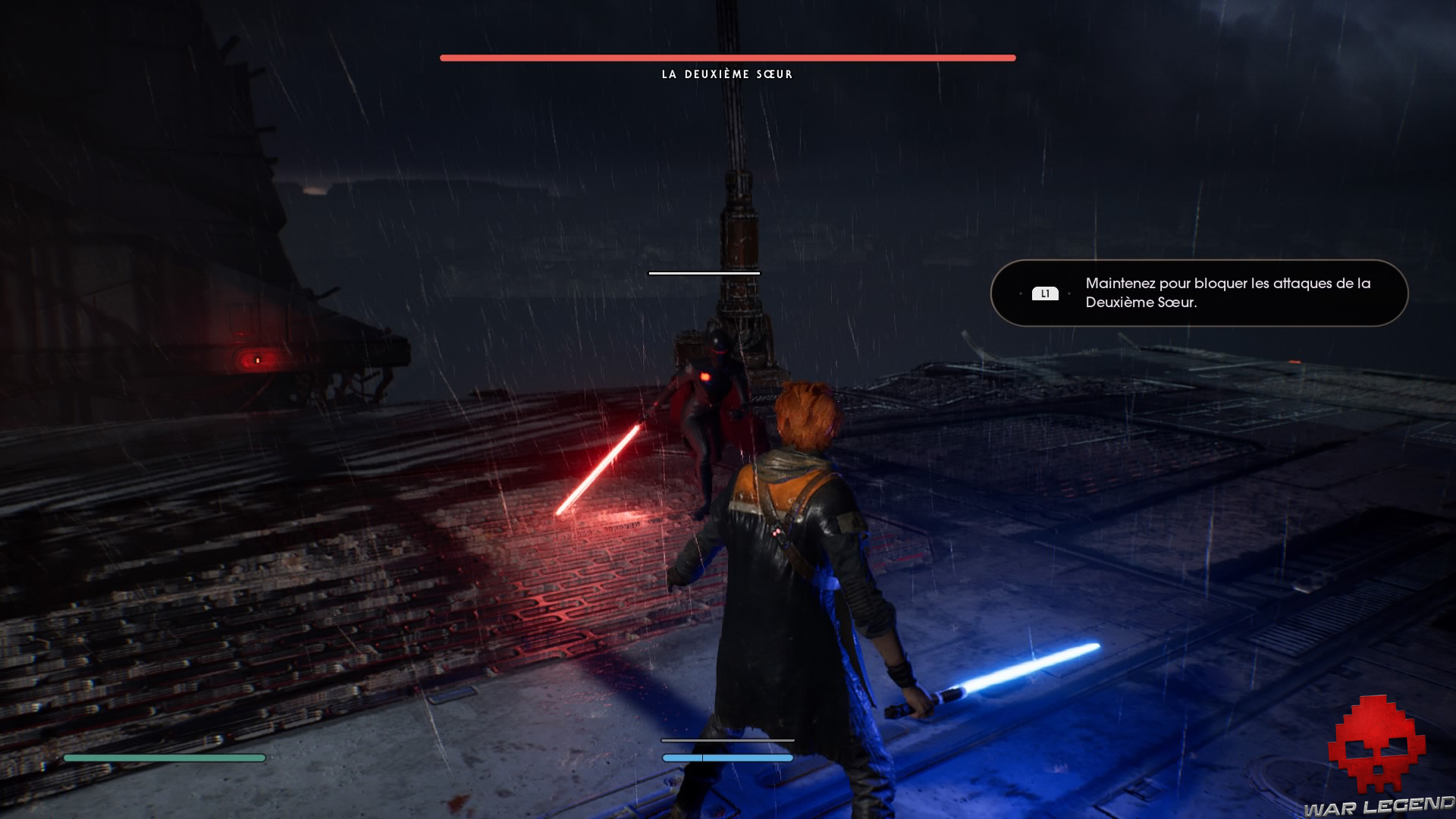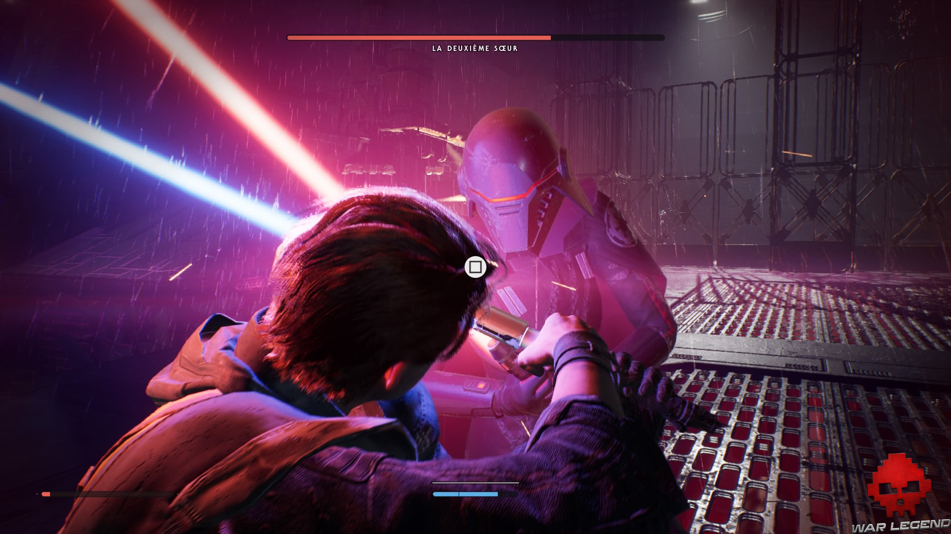 Pour la vaincre, il faudra parer ses coups de sabre laser (souvent des séries de 3 attaques), puis riposter tout de suite en bourrinant la touche d’attaque. Attention cependant à son attaque sautée imparable. Une fois que vous lui avez enlevé un tiers de vie, une cutscene se lancera dans laquelle vous aurez un petit QTE à réaliser avant de vous enfuir lâchement en vaisseau.