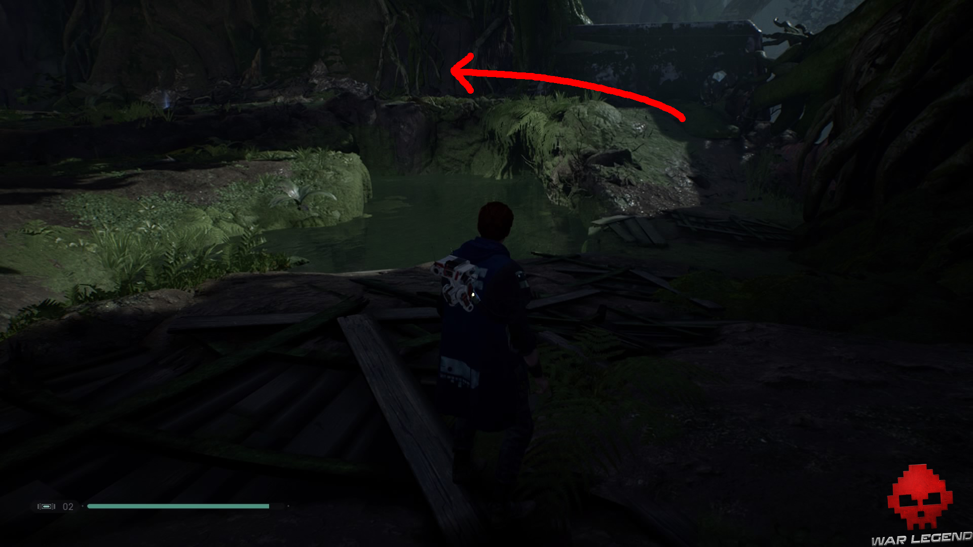 Passez sous le tronc, puis grimpez sur le rebord à gauche.