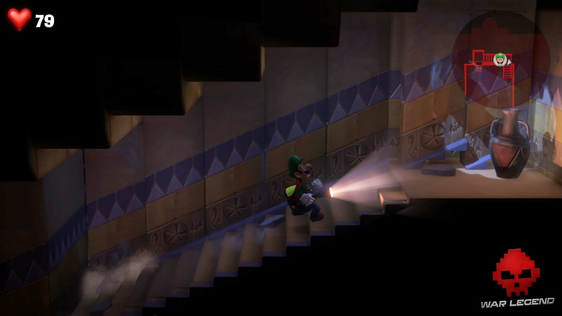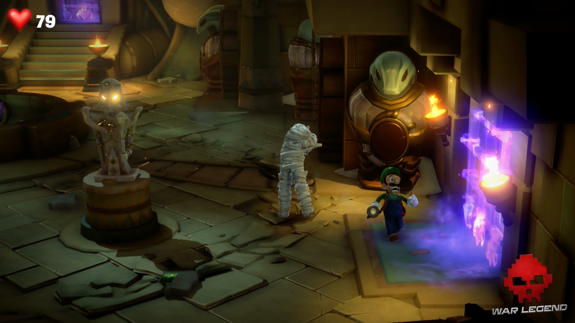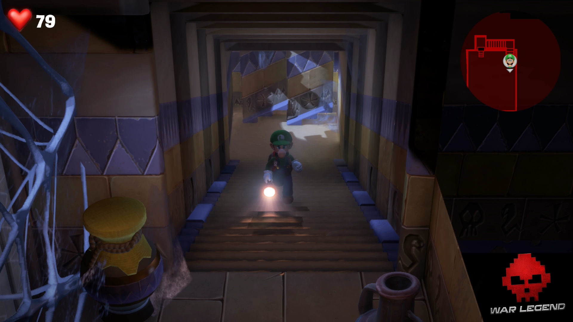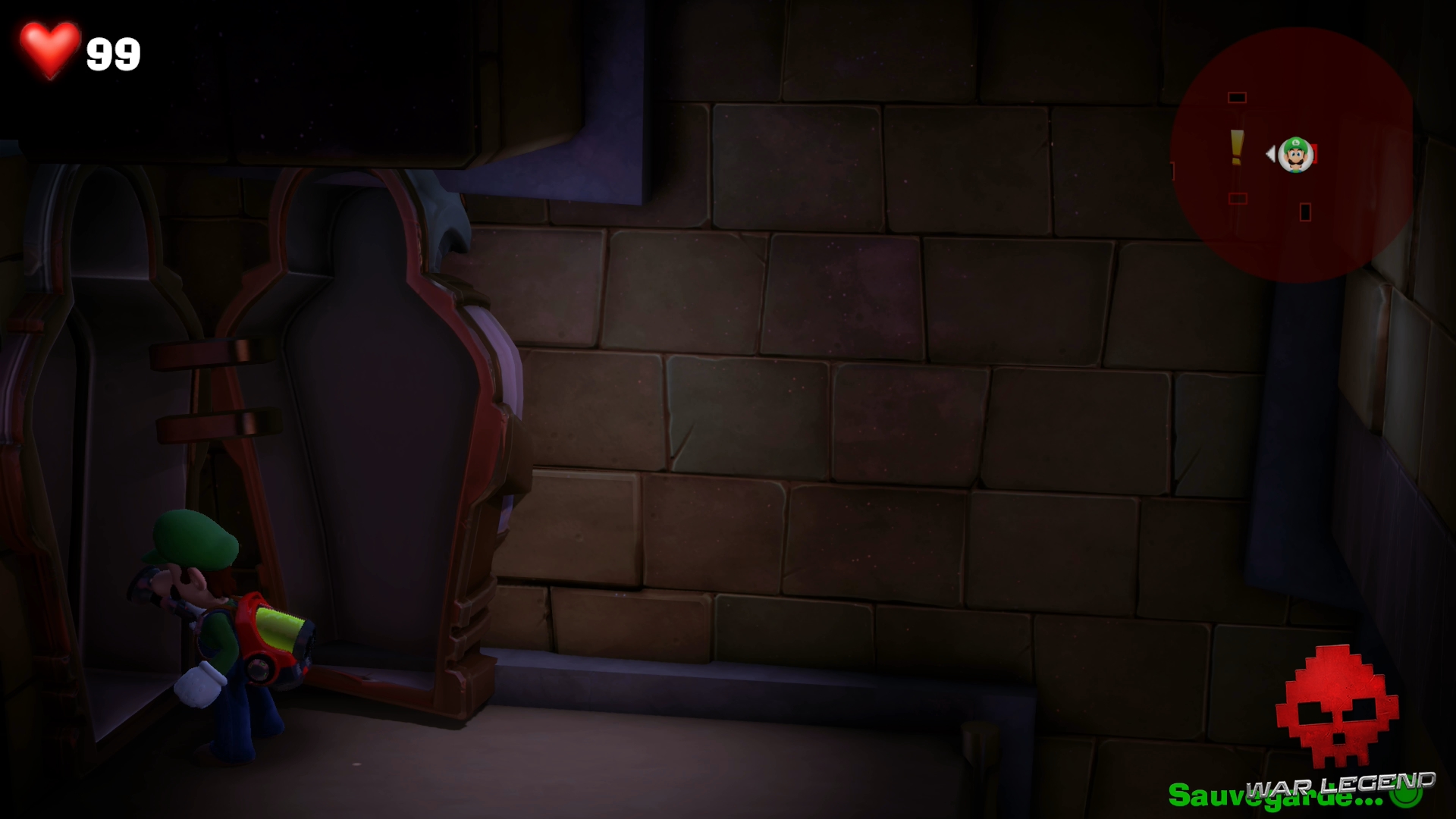 Dans le couloir suivant, faites passer Gluigi en premier (il ne craint pas les fléchettes empoisonnées). Tirez sur la bobinette pour arrêter le mécanisme et permettre à Luigi de passer sans danger. Montez l’échelle et rentrez dans le sarcophage.