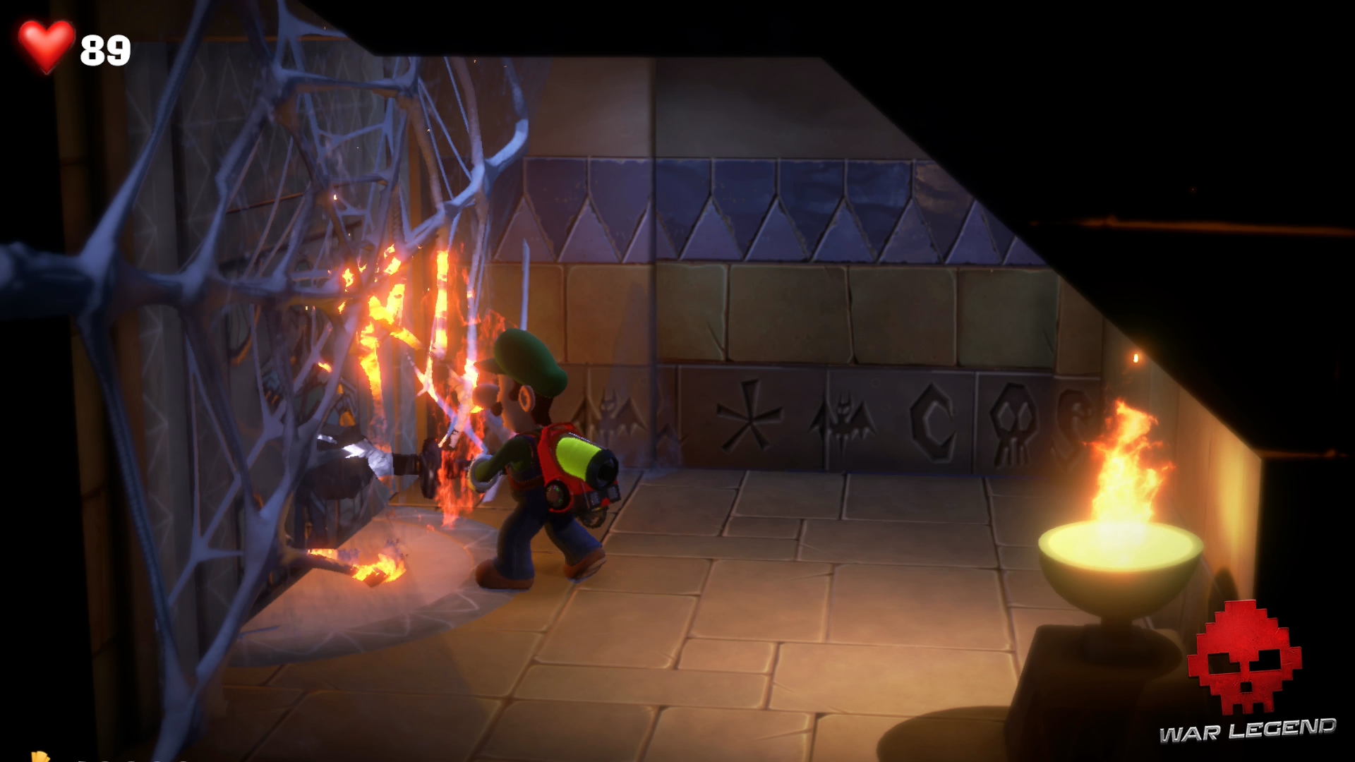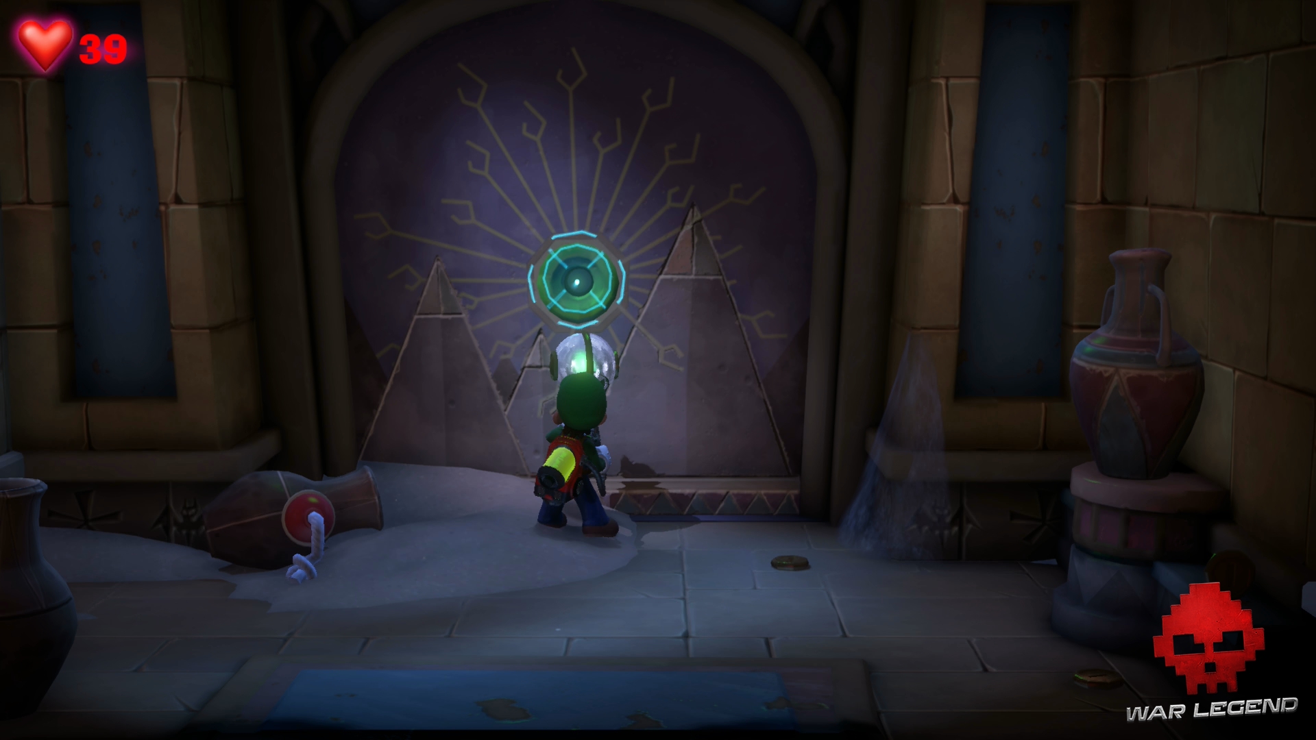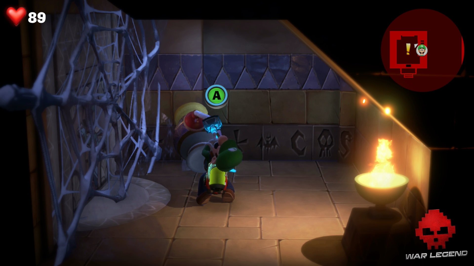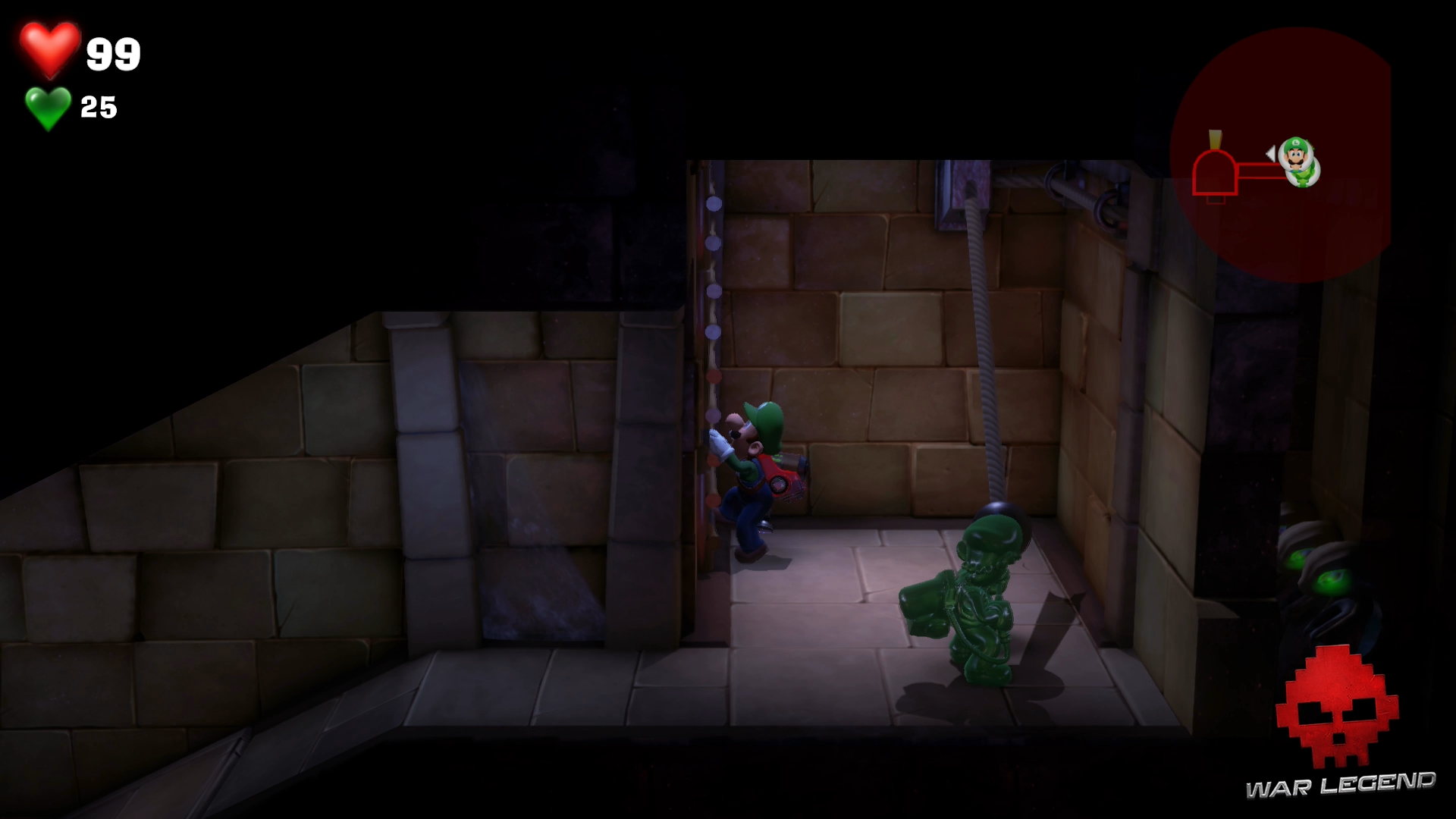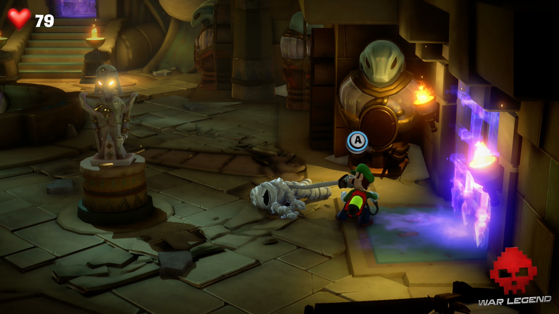 Dans le couloir suivant, faites passer Gluigi en premier (il ne craint pas les fléchettes empoisonnées). Tirez sur la bobinette pour arrêter le mécanisme et permettre à Luigi de passer sans danger. Montez l’échelle et rentrez dans le sarcophage.