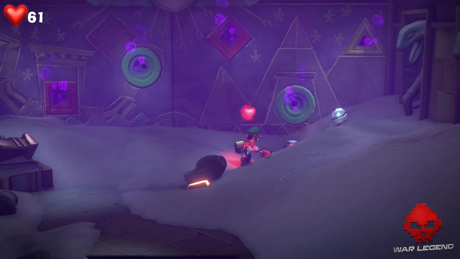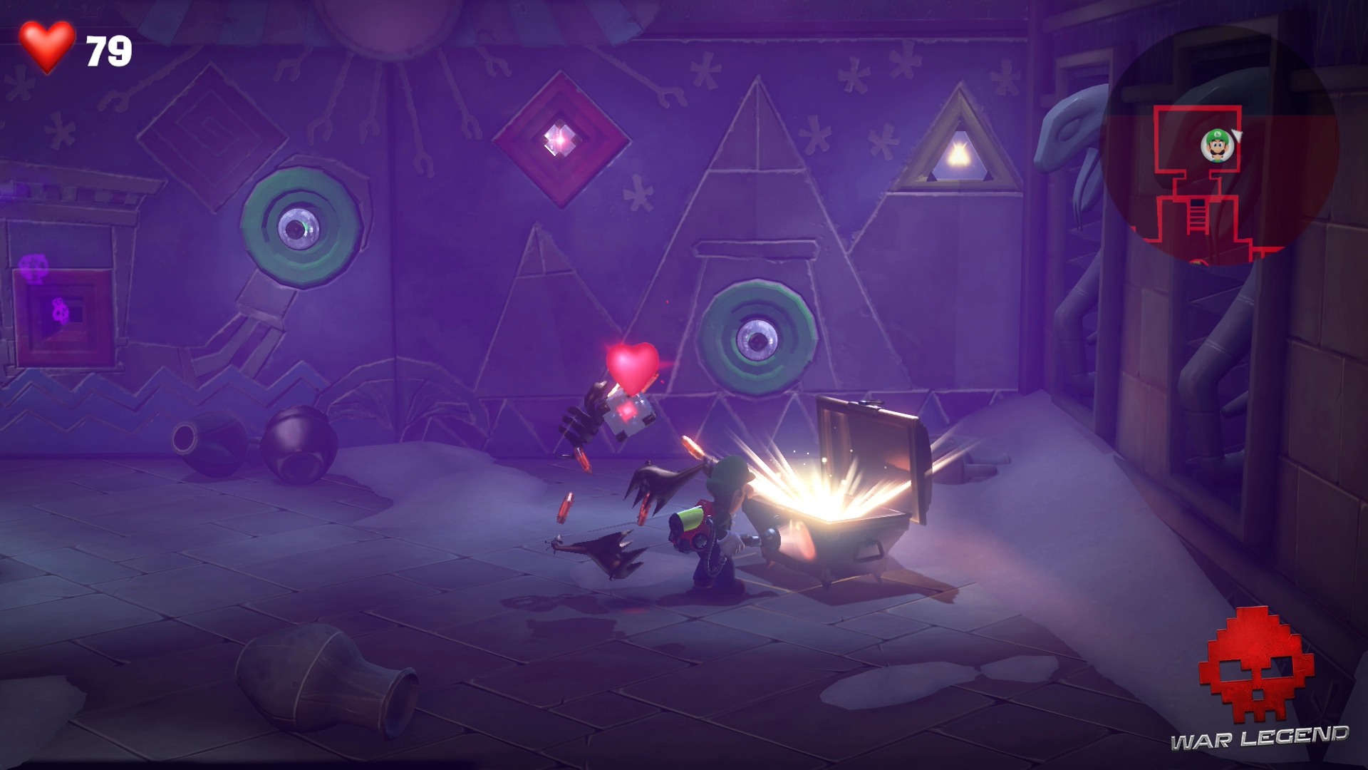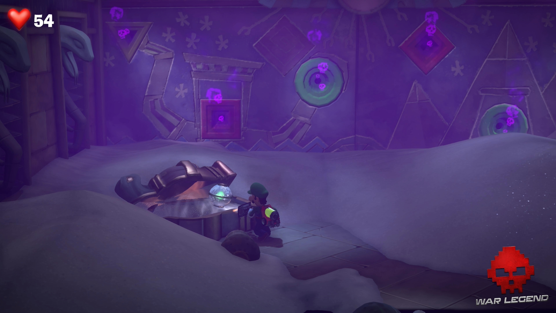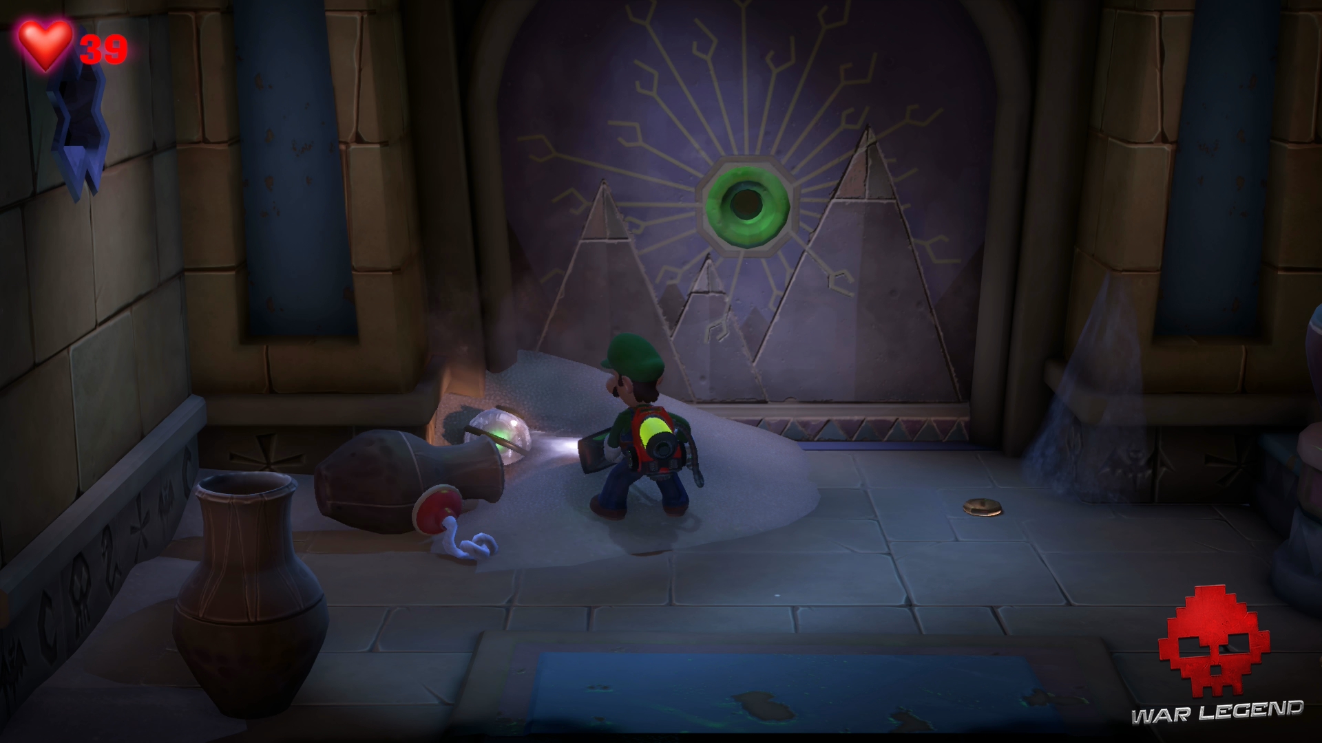 Dans le couloir suivant, faites passer Gluigi en premier (il ne craint pas les fléchettes empoisonnées). Tirez sur la bobinette pour arrêter le mécanisme et permettre à Luigi de passer sans danger. Montez l’échelle et rentrez dans le sarcophage.