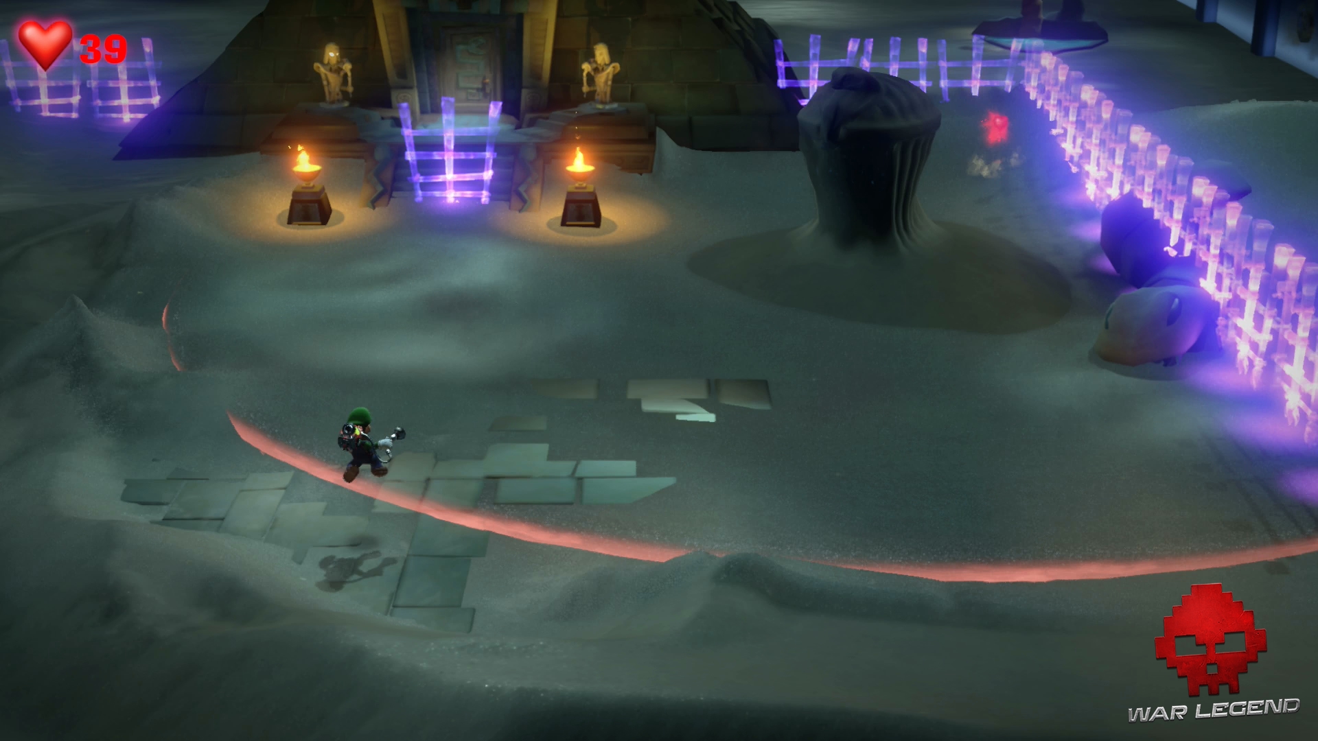 Des fantômes vous attaquent. Défendez-vous puis revenez dans la pièce principale afin de passer la porte de droite. Il y a beaucoup de sable dans cette pièce et la statue est déjà à portée. Soufflez sur le sable pour créer une butte.