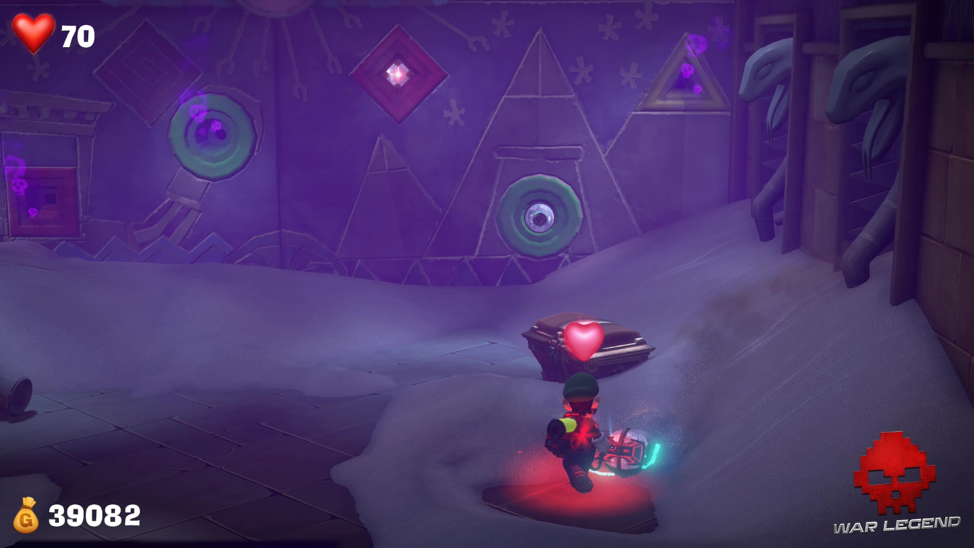 Revenu dans la pièce principale, les choses se compliquent. Des fantômes vous attaquent et une grosse boule tirée d’Indiana Jones risque fortement de vous rouler dessus. Prenez les adversaires à parti et n’hésitez pas à lâcher prise avant d’être transformé en crêpe.