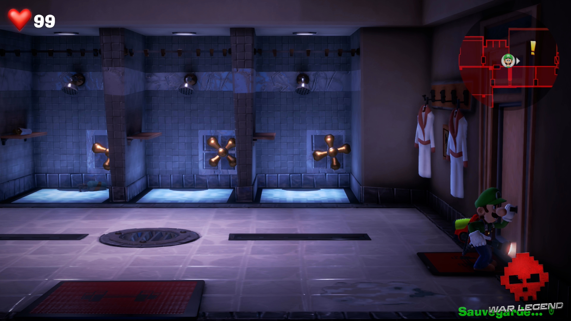 Voici la salle de douche. Vous ne pouvez pas flasher les fantômes à cause de la vapeur, mais ils ne peuvent pas vous voir non plus. Soyez prudent par leurs mouvements erratiques et coupez l’eau des douches avec l’Ectoblast. La 3e douche nécessite que vous vous débarassiez d’abord du rideau.